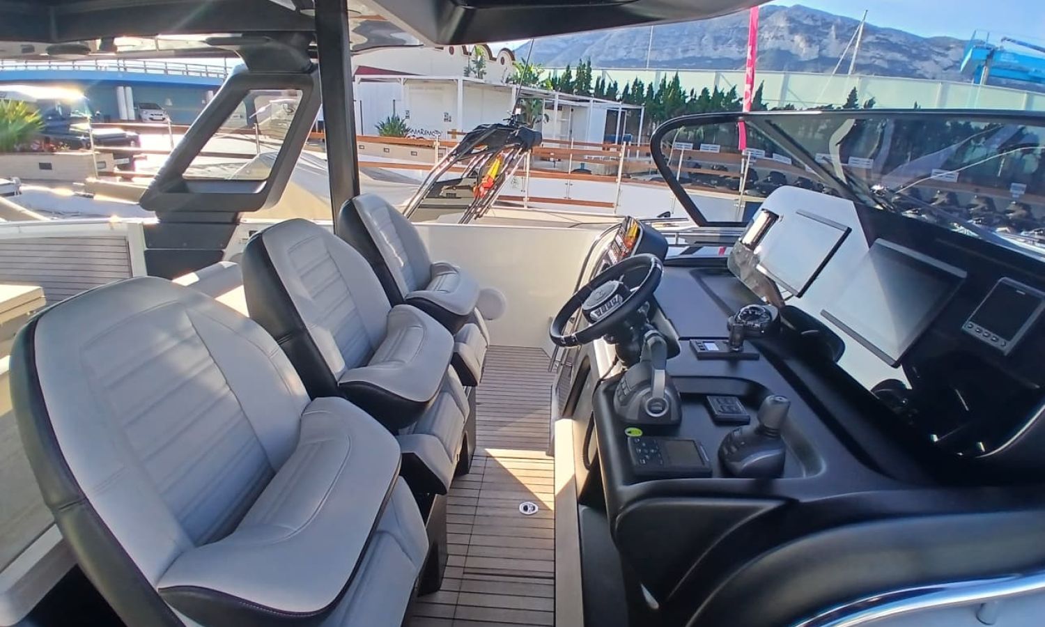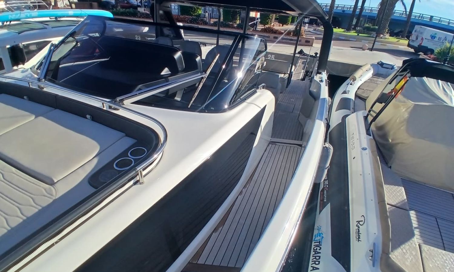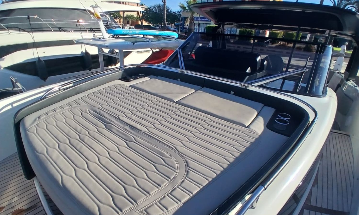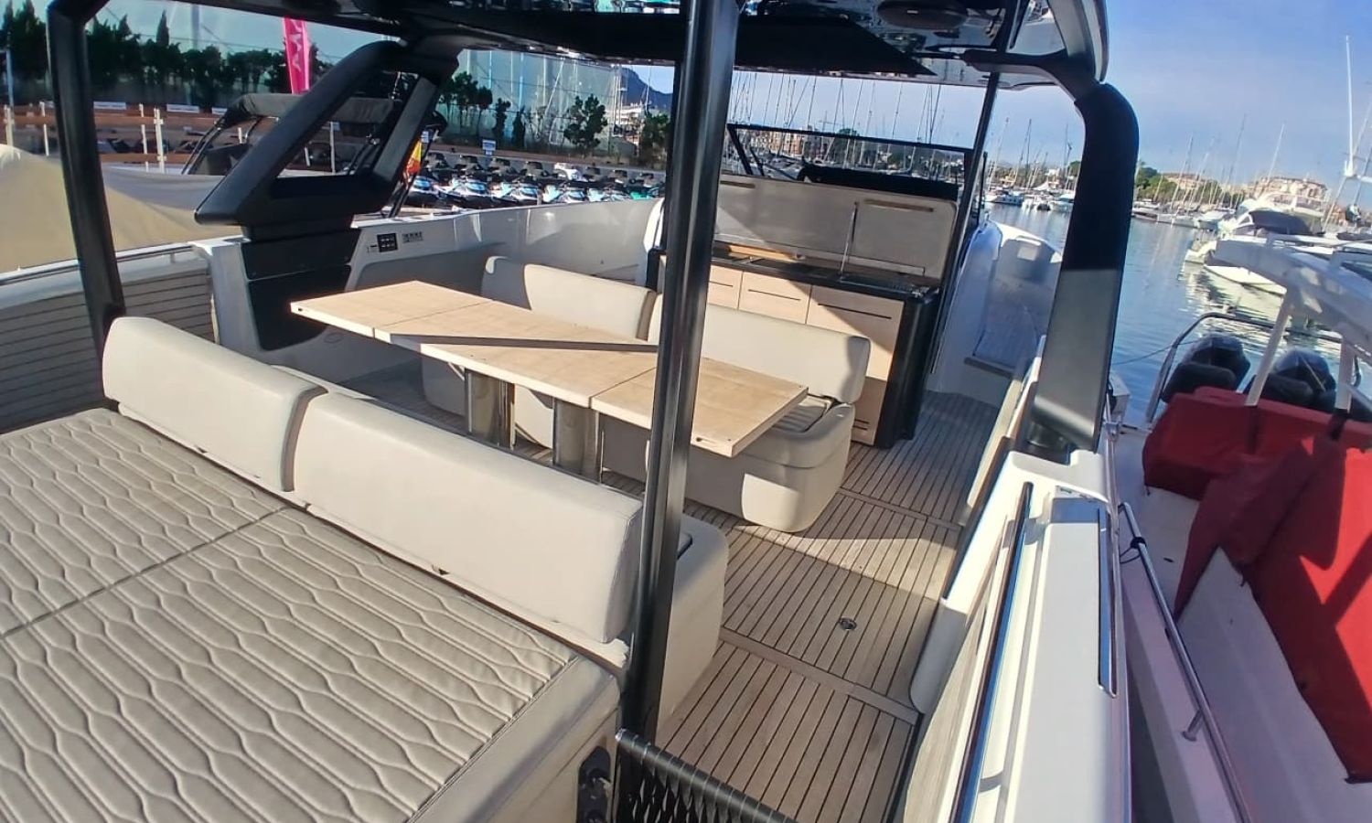 Waste water tank - Air conditioning 16.000 BTU in cabins with heat pump - Set covers (for dashboard, pilot seat, stern sofa, cockpit table, cockpit wetbar and stern sun cushion) - Automatic List Control + Coordinated Turn Control - Bow thruster - Cockpit refrigerator - Generator 8 kW - Electric cockpit grill - Ice-maker - Aft lowering bulkwarks - Hydraulic gangway - Autopilot - Up/down hydraulic stern platform - Teak laid cockpit and teak laid aft lowering bulkwarks - Solid teak coverings on lateral stringers - T-Top - VHF - CE Certificate - Stern band (side and platform frame) lacquered - T-Top lacquered - Preparation, launch and delivery with sea trial - Transport shipyard to Costa Brava.Boat description