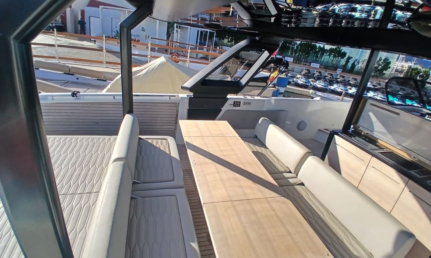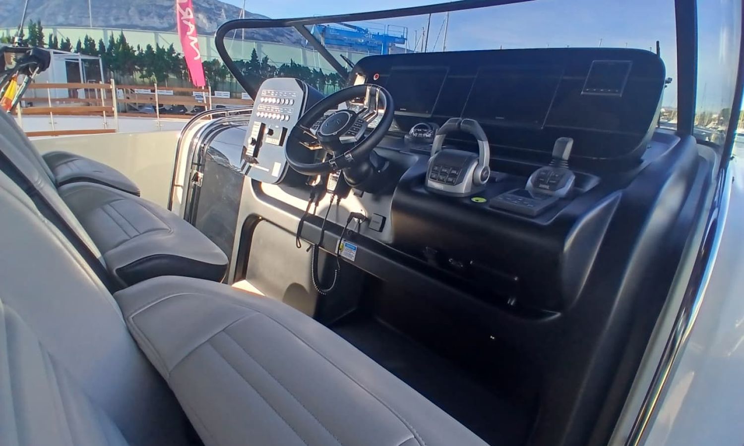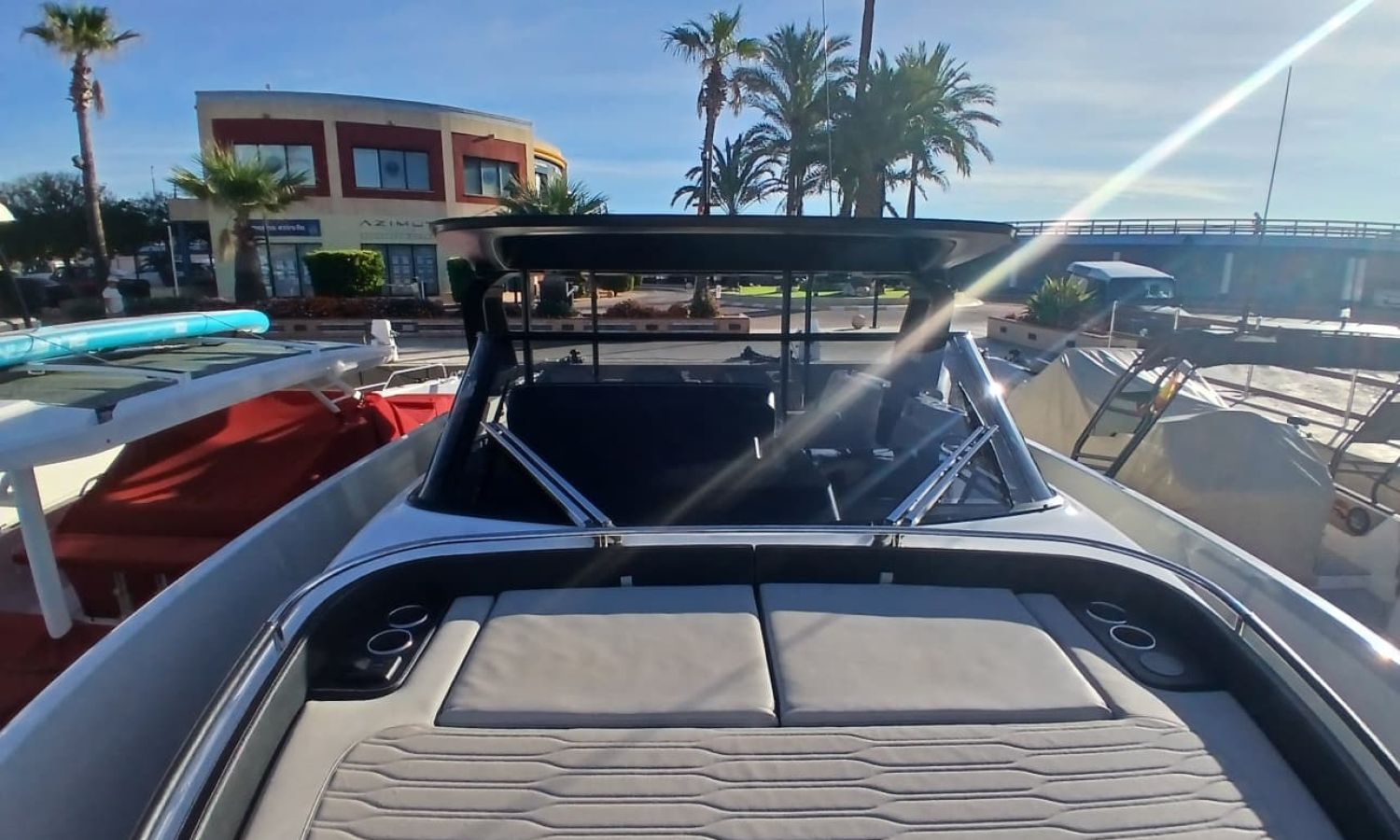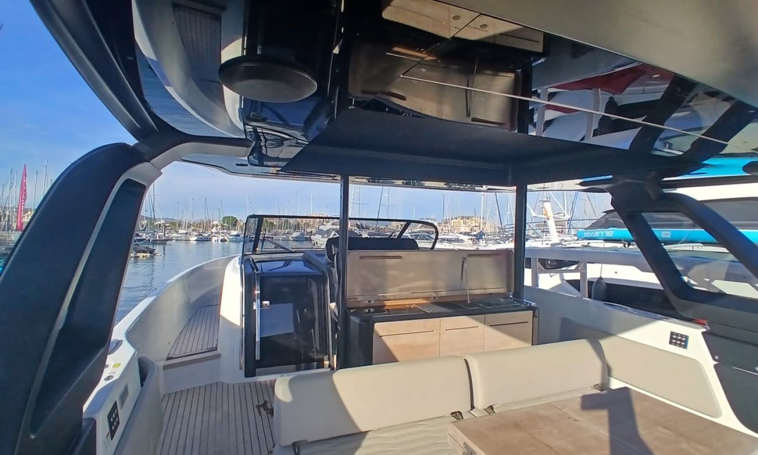 Waste water tank - Air conditioning 16.000 BTU in cabins with heat pump - Set covers (for dashboard, pilot seat, stern sofa, cockpit table, cockpit wetbar and stern sun cushion) - Automatic List Control + Coordinated Turn Control - Bow thruster - Cockpit refrigerator - Generator 8 kW - Electric cockpit grill - Ice-maker - Aft lowering bulkwarks - Hydraulic gangway - Autopilot - Up/down hydraulic stern platform - Teak laid cockpit and teak laid aft lowering bulkwarks - Solid teak coverings on lateral stringers - T-Top - VHF - CE Certificate - Stern band (side and platform frame) lacquered - T-Top lacquered - Preparation, launch and delivery with sea trial - Transport shipyard to Costa Brava.Boat description