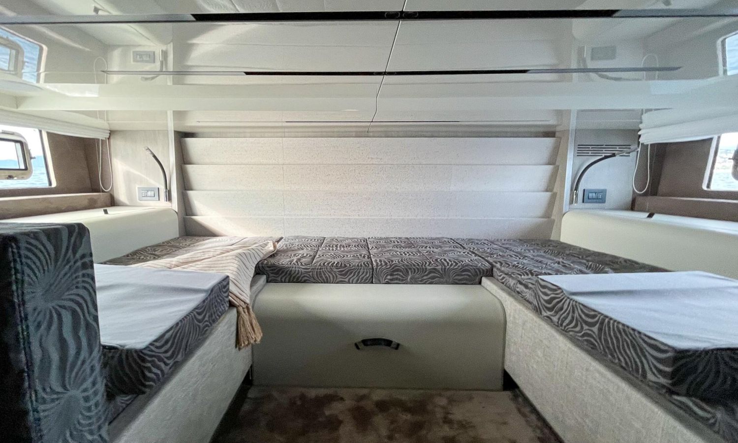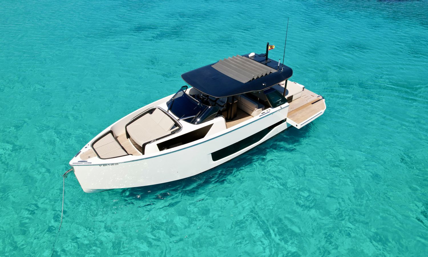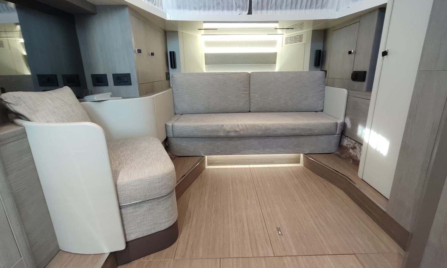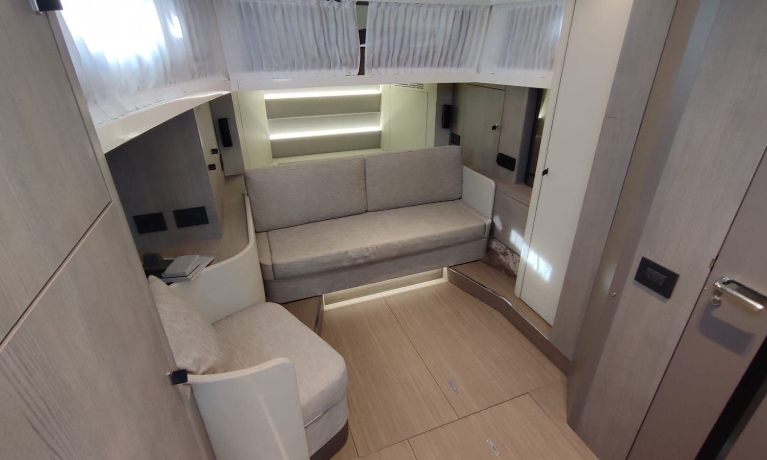 Waste water tank - Air conditioning 16.000 BTU in cabins with heat pump - Set covers (for dashboard, pilot seat, stern sofa, cockpit table, cockpit wetbar and stern sun cushion) - Automatic List Control + Coordinated Turn Control - Bow thruster - Cockpit refrigerator - Generator 8 kW - Electric cockpit grill - Ice-maker - Aft lowering bulkwarks - Hydraulic gangway - Autopilot - Up/down hydraulic stern platform - Teak laid cockpit and teak laid aft lowering bulkwarks - Solid teak coverings on lateral stringers - T-Top - VHF - CE Certificate - Stern band (side and platform frame) lacquered - T-Top lacquered - Preparation, launch and delivery with sea trial - Transport shipyard to Costa Brava.Boat description