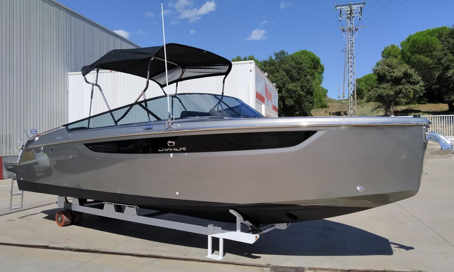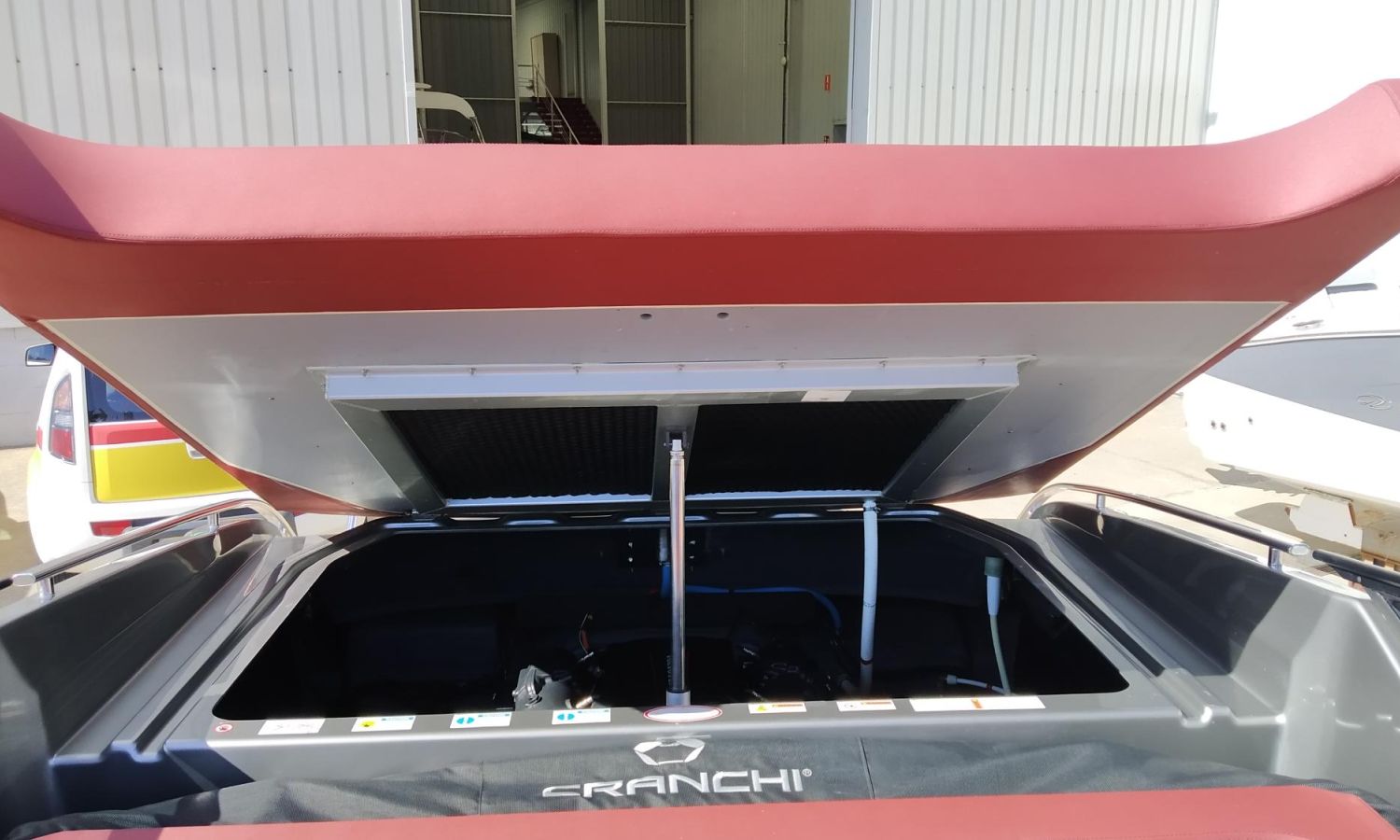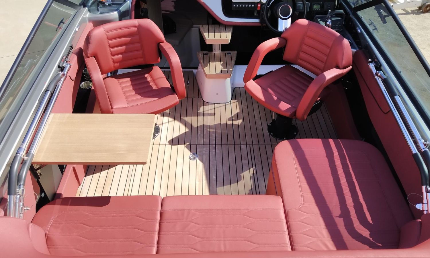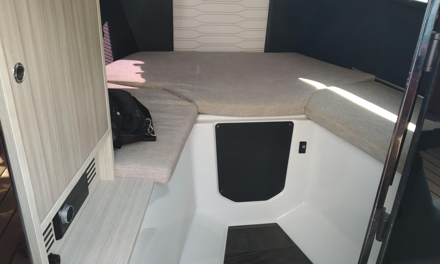 Black bimini top microperforated - Bow thruster - Removable icebox 34 l - Radio Fusion with iPod connexion and USB socket - Cockpit table - Teak laid bathing platform - Teak laid foredeck - Teak laid cockpit - Cockpit cover - Trip computer + power trim assitance - Electric anchor winch with chain and Ultramarine anchor - VHF - Ski hook - Antifouling.Boat description