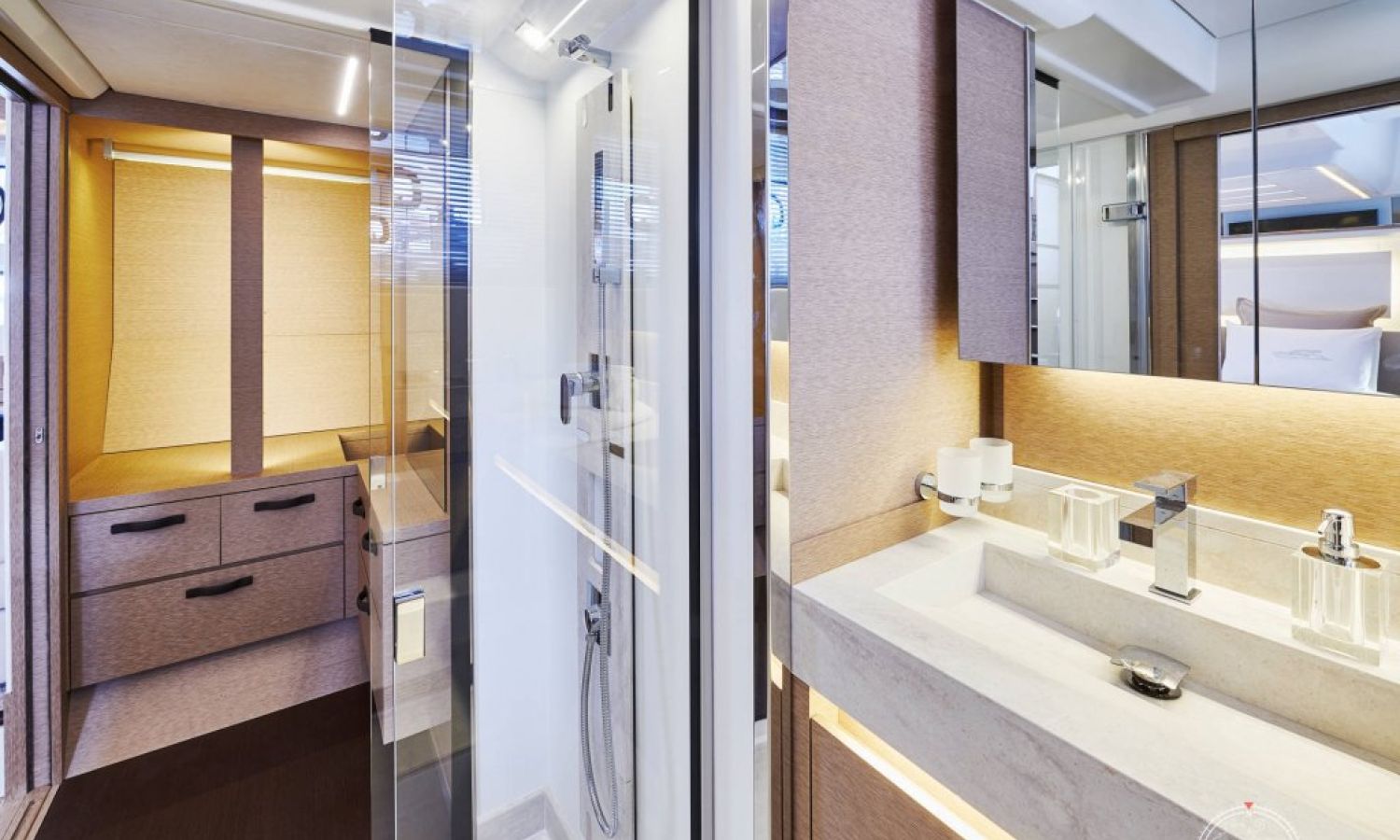 A generous flybridge and sleek radar arch enhance the onboard comfort and the powerful look. The ability to choose between an independent crew cabin and a large tender garage is unique in her category. All these design features come together in a yacht that provides remarkable comfort and dynamic design.