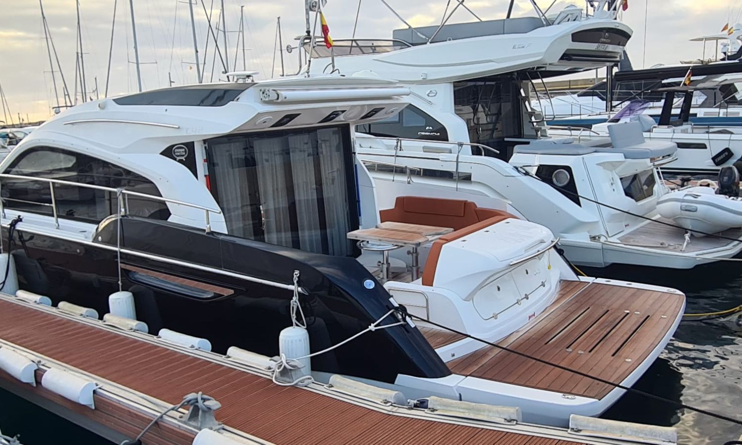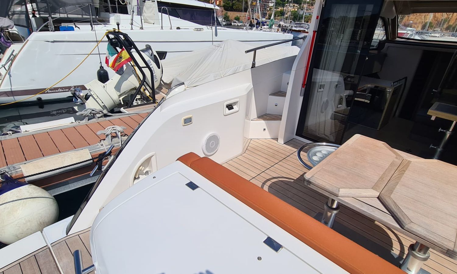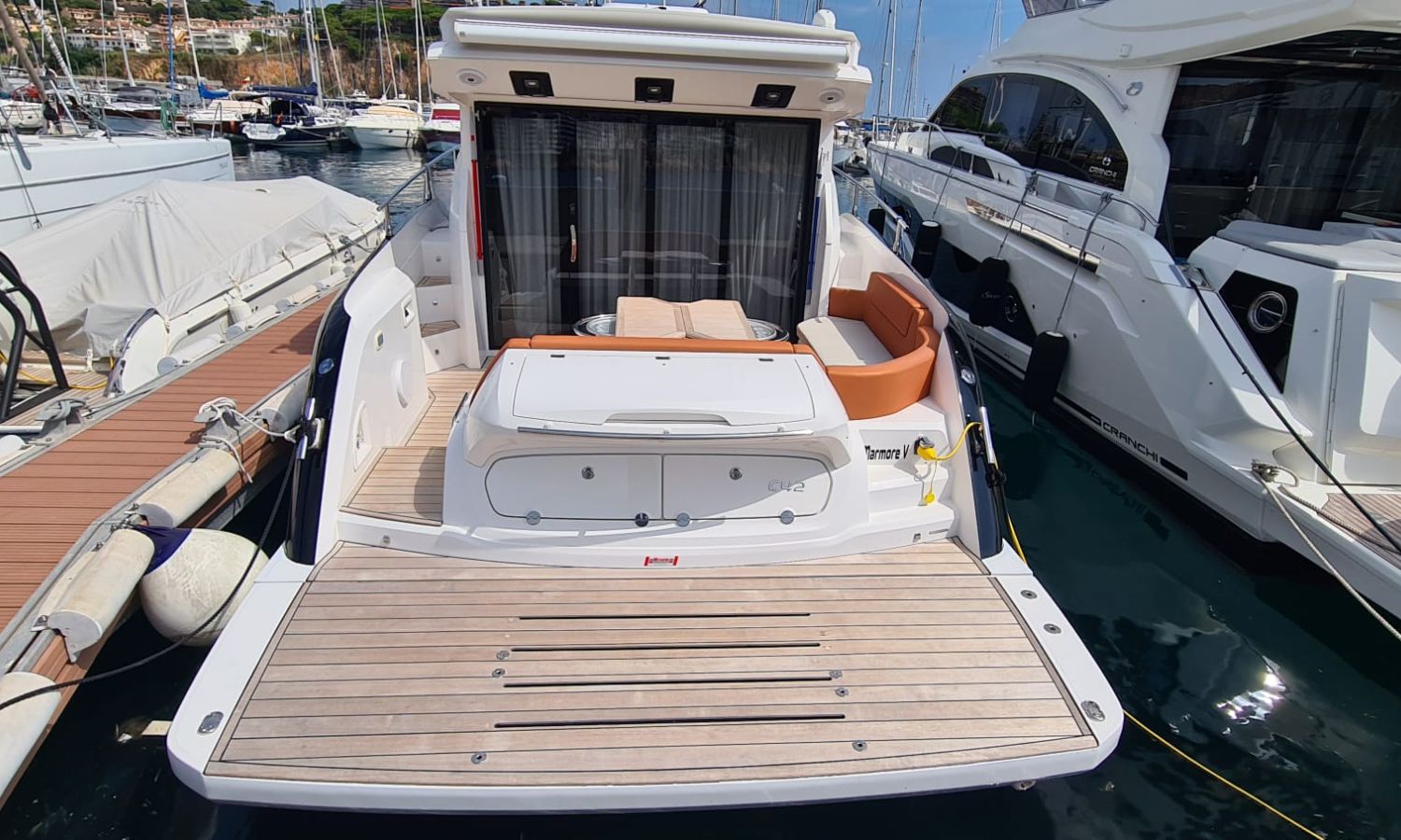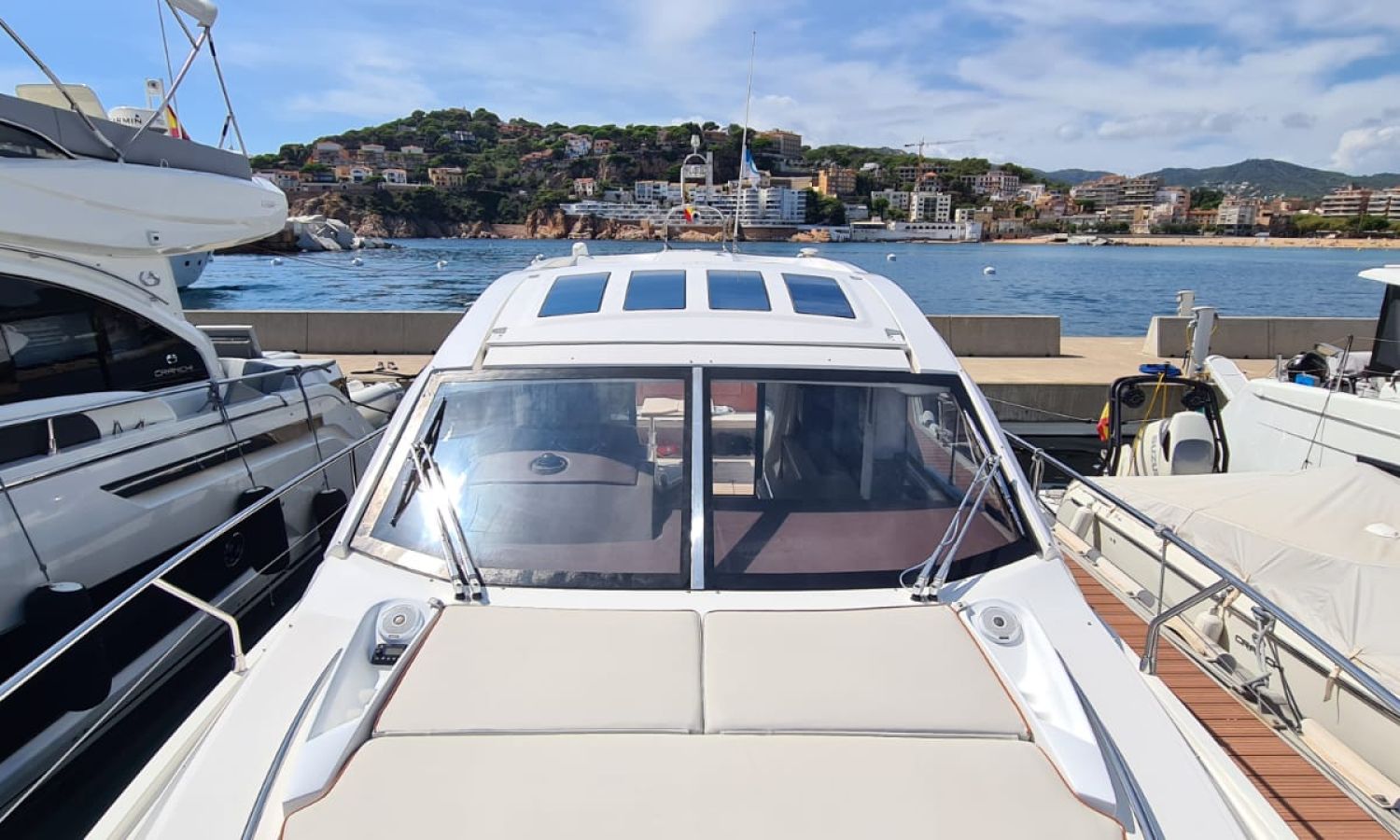 Generator - Air conditioning - Auto pilot - GPS/Plotter/Depth finder Raymarine 12 " - Electric windlass - Chain meter counter - Sound system inside/outside - Joystick IPS - Bow thruster - Trim tabs Benetti - Hydraulic swim platform - Electric bimini - Bow sun cushions and aft sundeck - Grill on swim platform - Electric Hard-top - Fresh water intake - Complete kitchen inside with vitro - Microwave - Refrigerator - Freezer - Extractor hood in kitchen - Electric WCs with waste water tank - Refrigerator in living room - DPS positioning system.Boat description