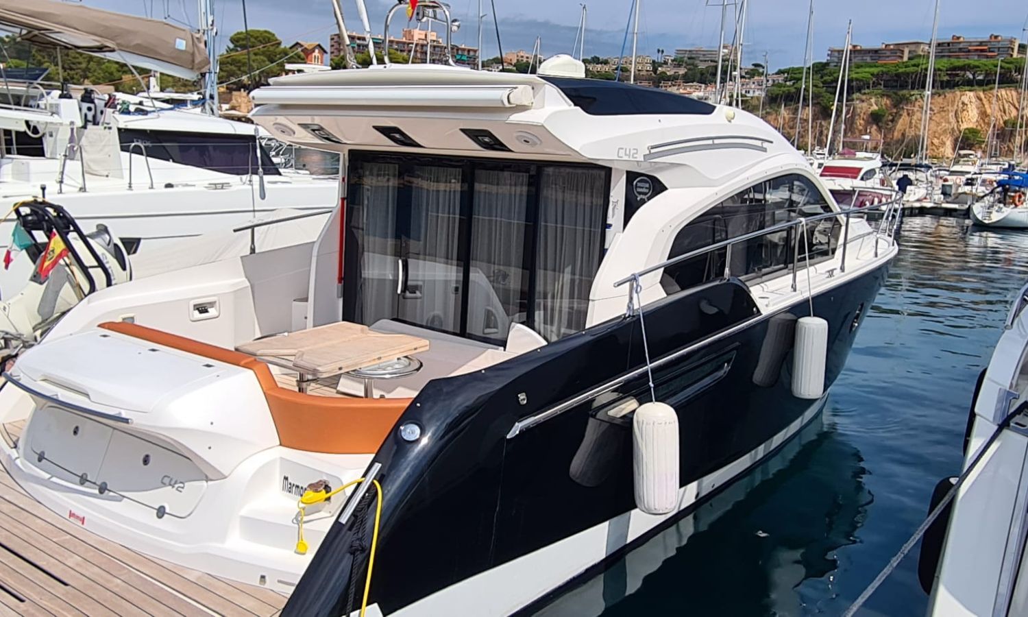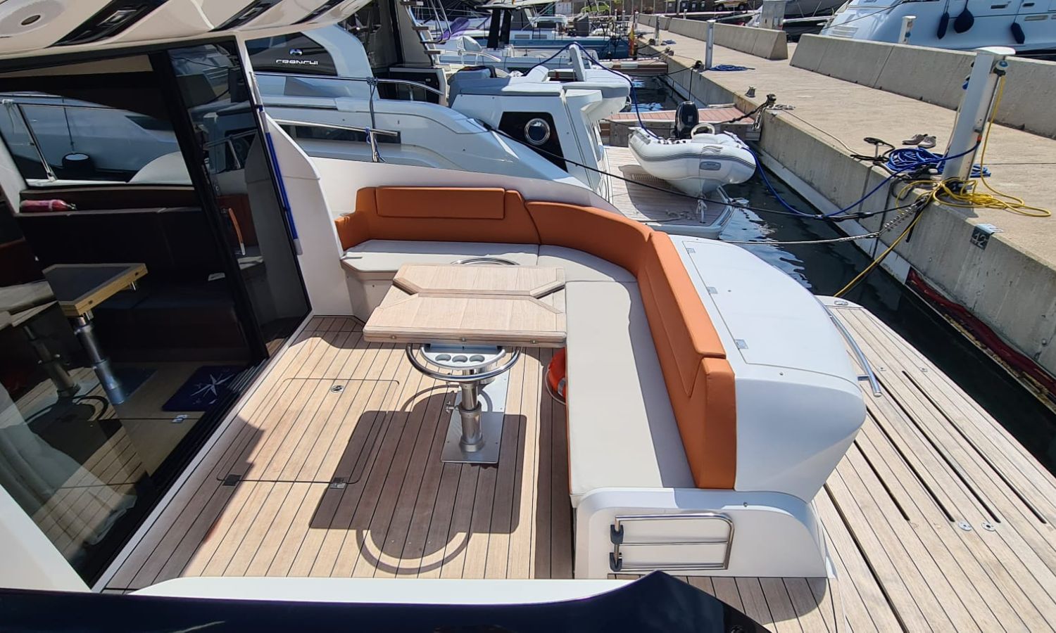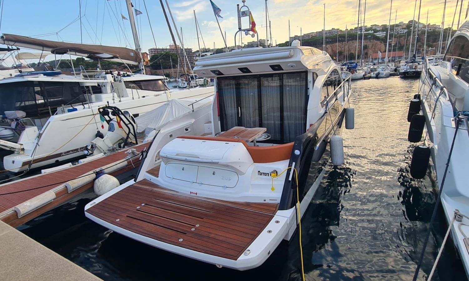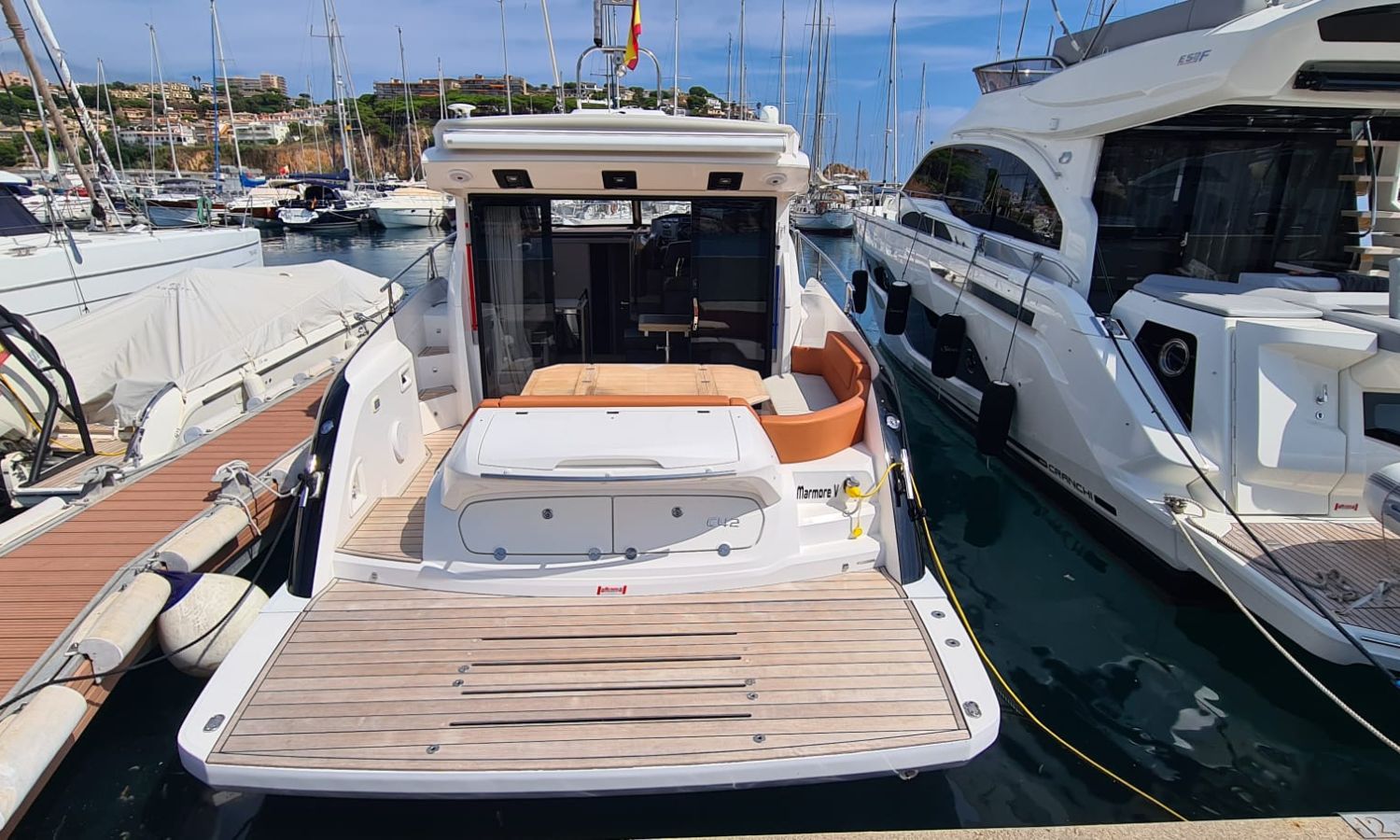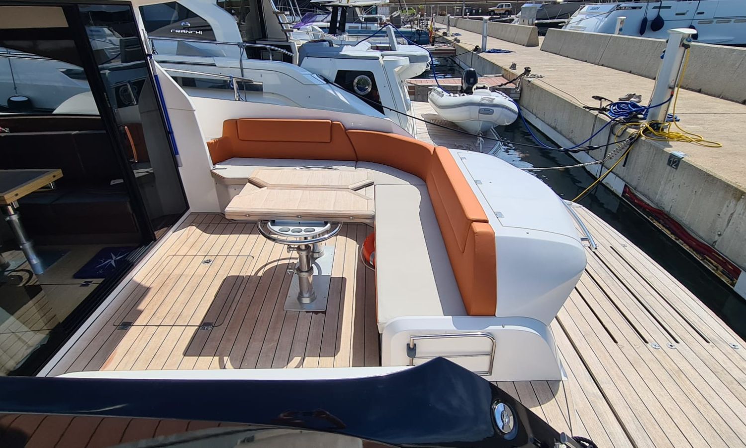 Generator - Air conditioning - Auto pilot - GPS/Plotter/Depth finder Raymarine 12 " - Electric windlass - Chain meter counter - Sound system inside/outside - Joystick IPS - Bow thruster - Trim tabs Benetti - Hydraulic swim platform - Electric bimini - Bow sun cushions and aft sundeck - Grill on swim platform - Electric Hard-top - Fresh water intake - Complete kitchen inside with vitro - Microwave - Refrigerator - Freezer - Extractor hood in kitchen - Electric WCs with waste water tank - Refrigerator in living room - DPS positioning system.Boat description