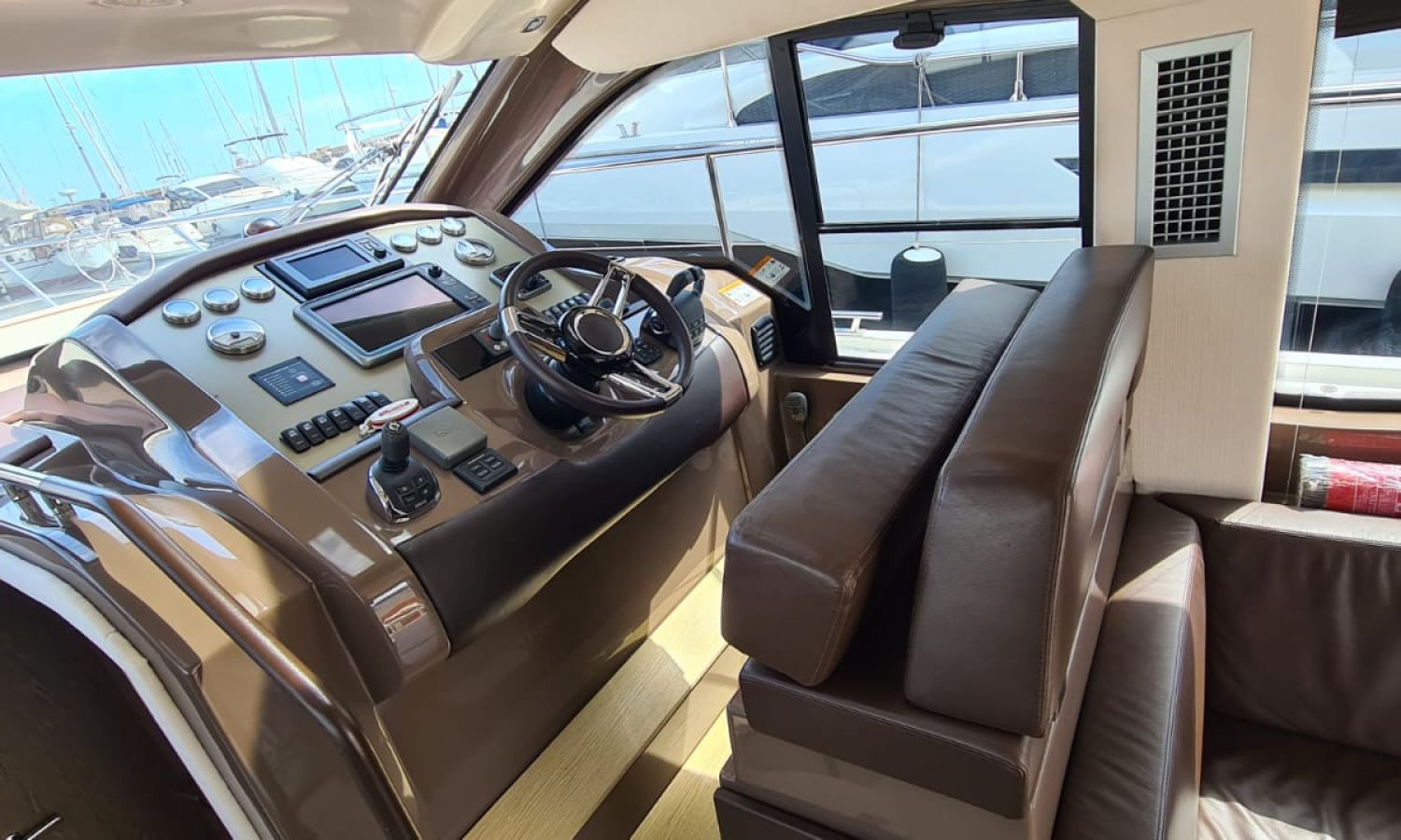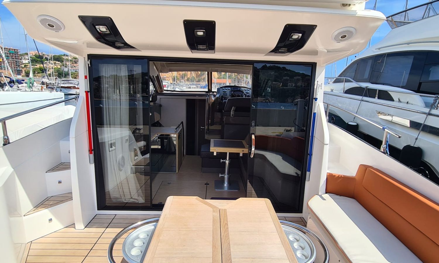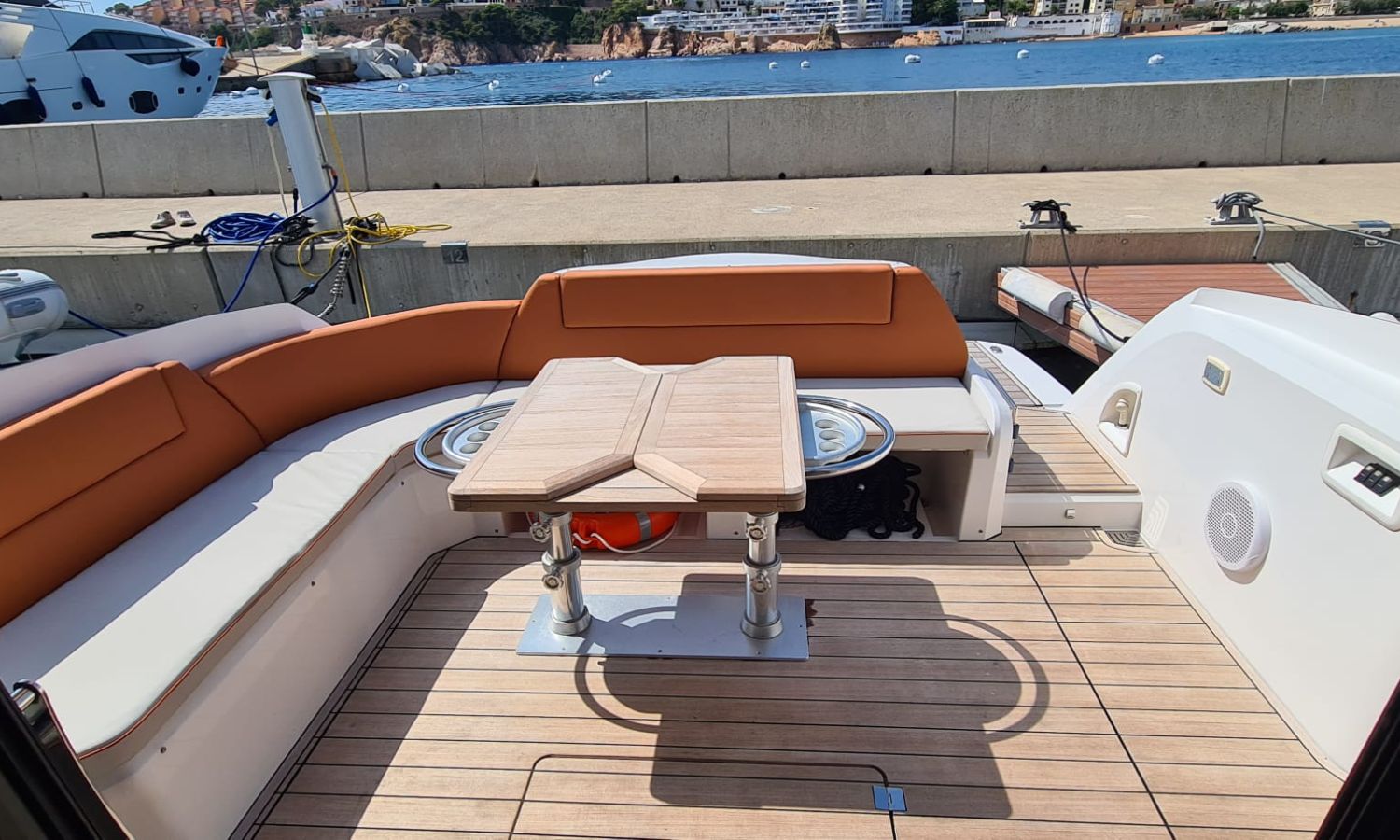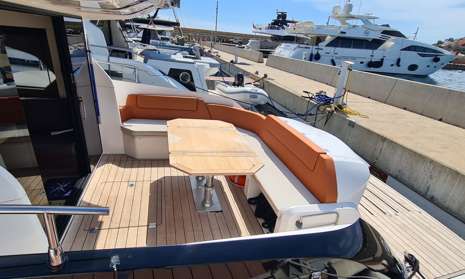 Generator - Air conditioning - Auto pilot - GPS/Plotter/Depth finder Raymarine 12 " - Electric windlass - Chain meter counter - Sound system inside/outside - Joystick IPS - Bow thruster - Trim tabs Benetti - Hydraulic swim platform - Electric bimini - Bow sun cushions and aft sundeck - Grill on swim platform - Electric Hard-top - Fresh water intake - Complete kitchen inside with vitro - Microwave - Refrigerator - Freezer - Extractor hood in kitchen - Electric WCs with waste water tank - Refrigerator in living room - DPS positioning system.Boat description