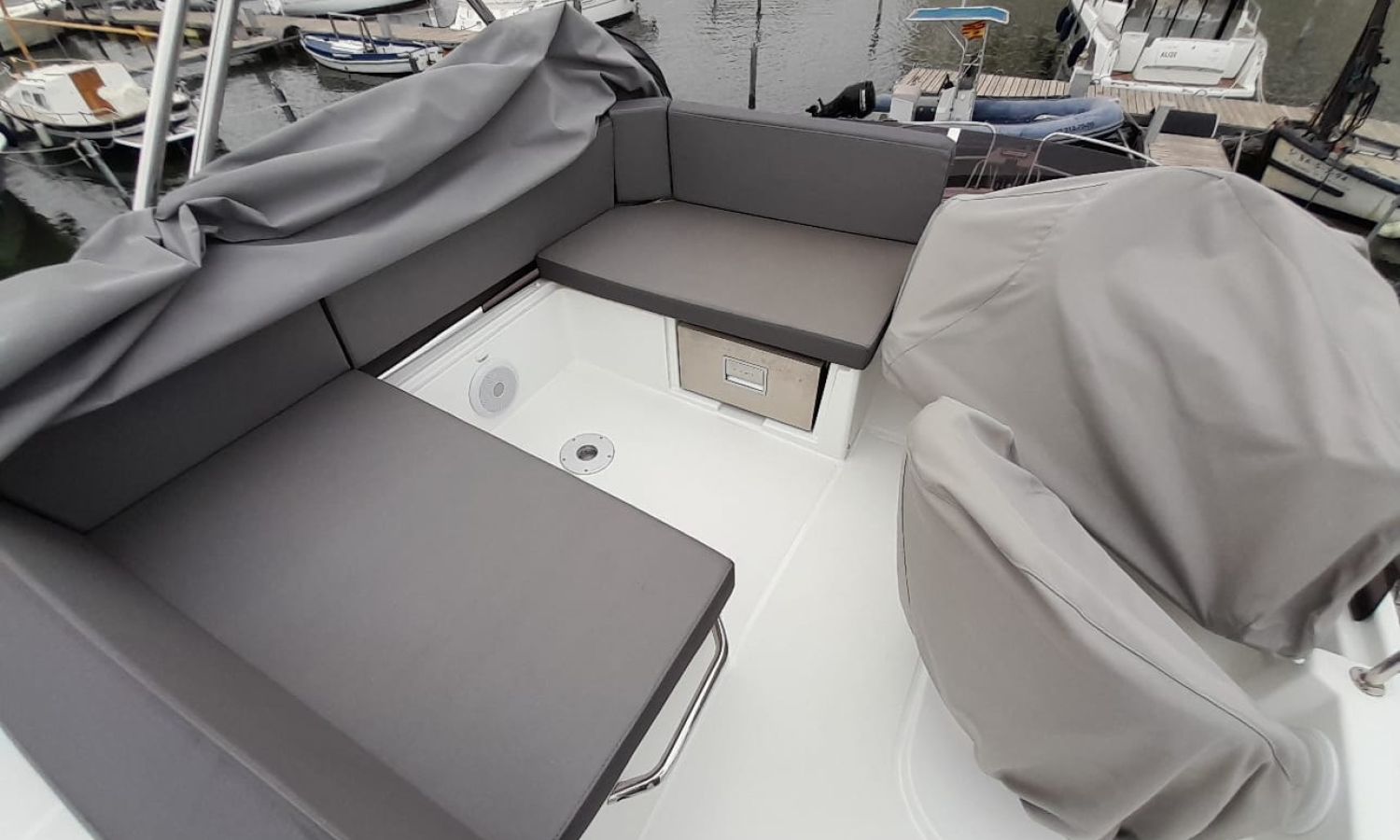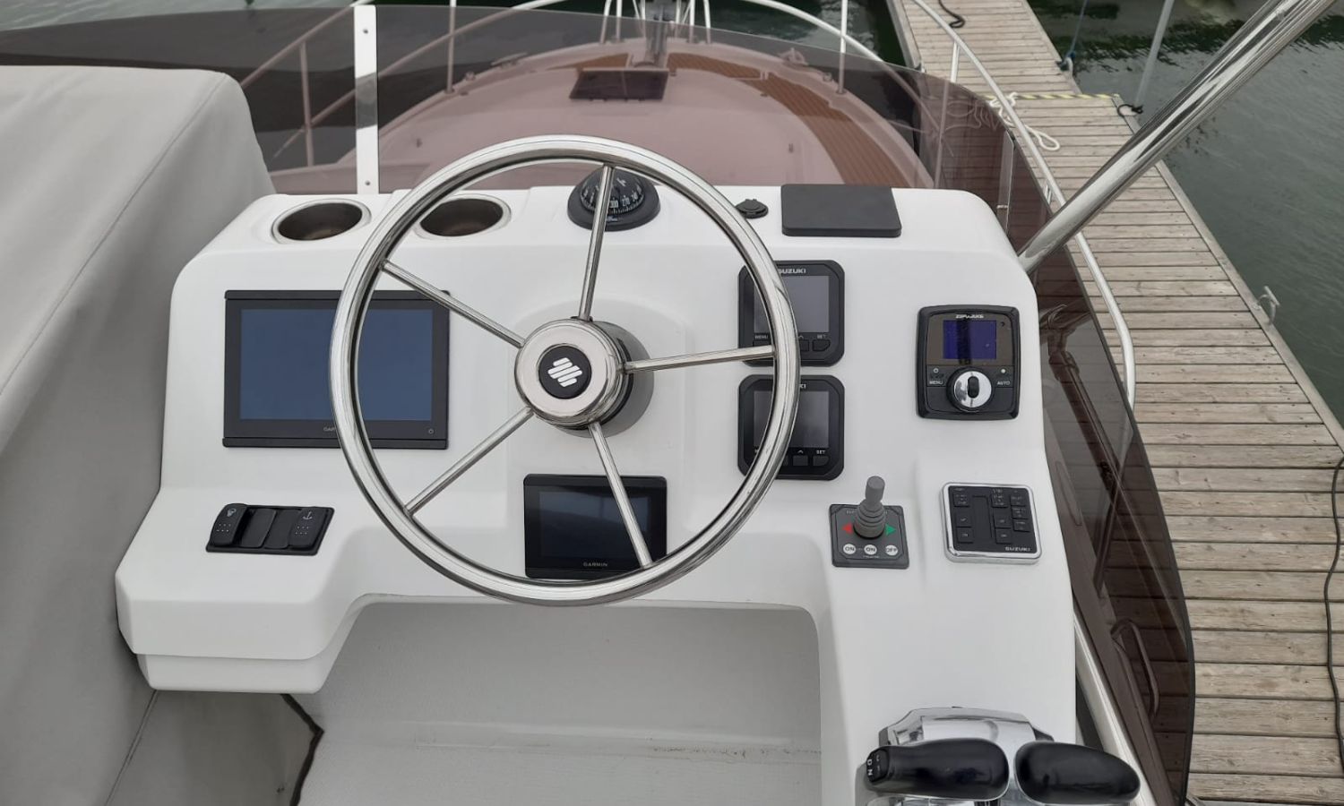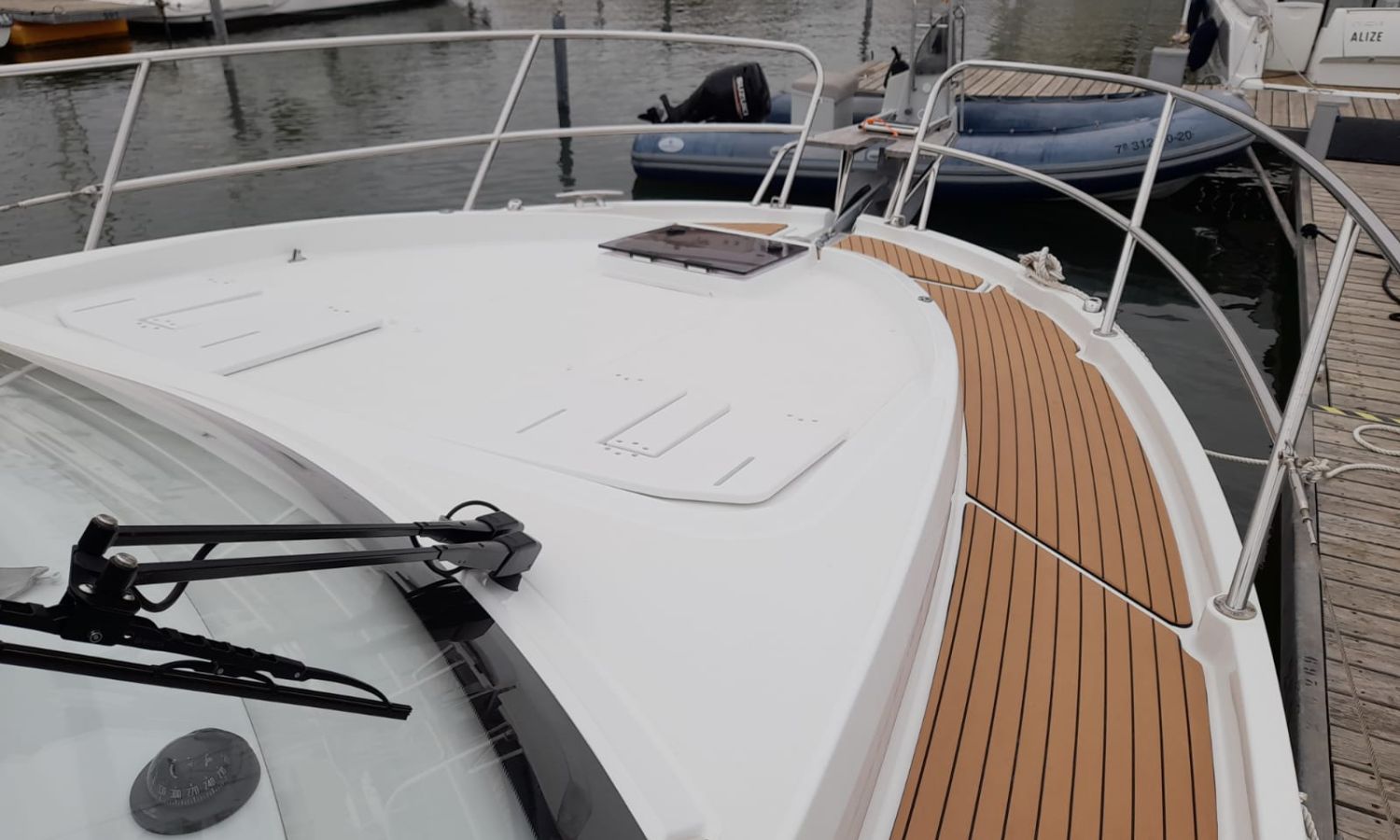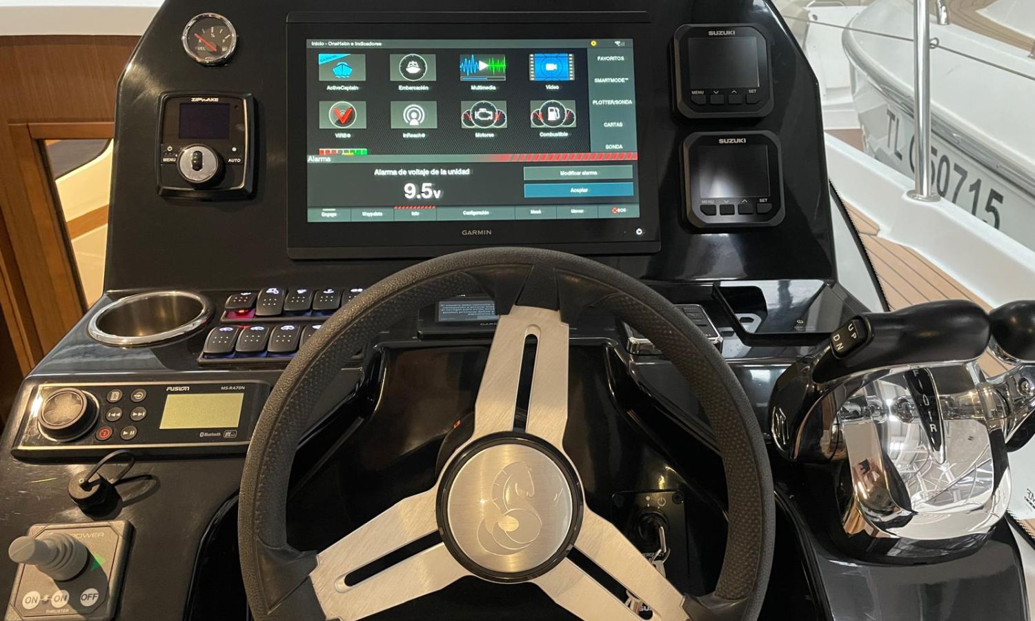 Flybridge - Toldo parasol - Solarium de proa - Escalera de baño - Mesa en la bañera - Teca - Ducha - Toma de puerto - Cargador de baterias - Generador - Aire acondicionado - Molinete eléctrico con ancla y cadena - 2 Cabinas - Wc eléctrico con depósito de aguas negras - Mandos electrónicos - Gps/Plotter/Sonda - Hélice de proa - VHF - Equipo de audio Fusion - Nevera 12 V. - Fregadero - Microondas - Antifouling.Descripción embarcación