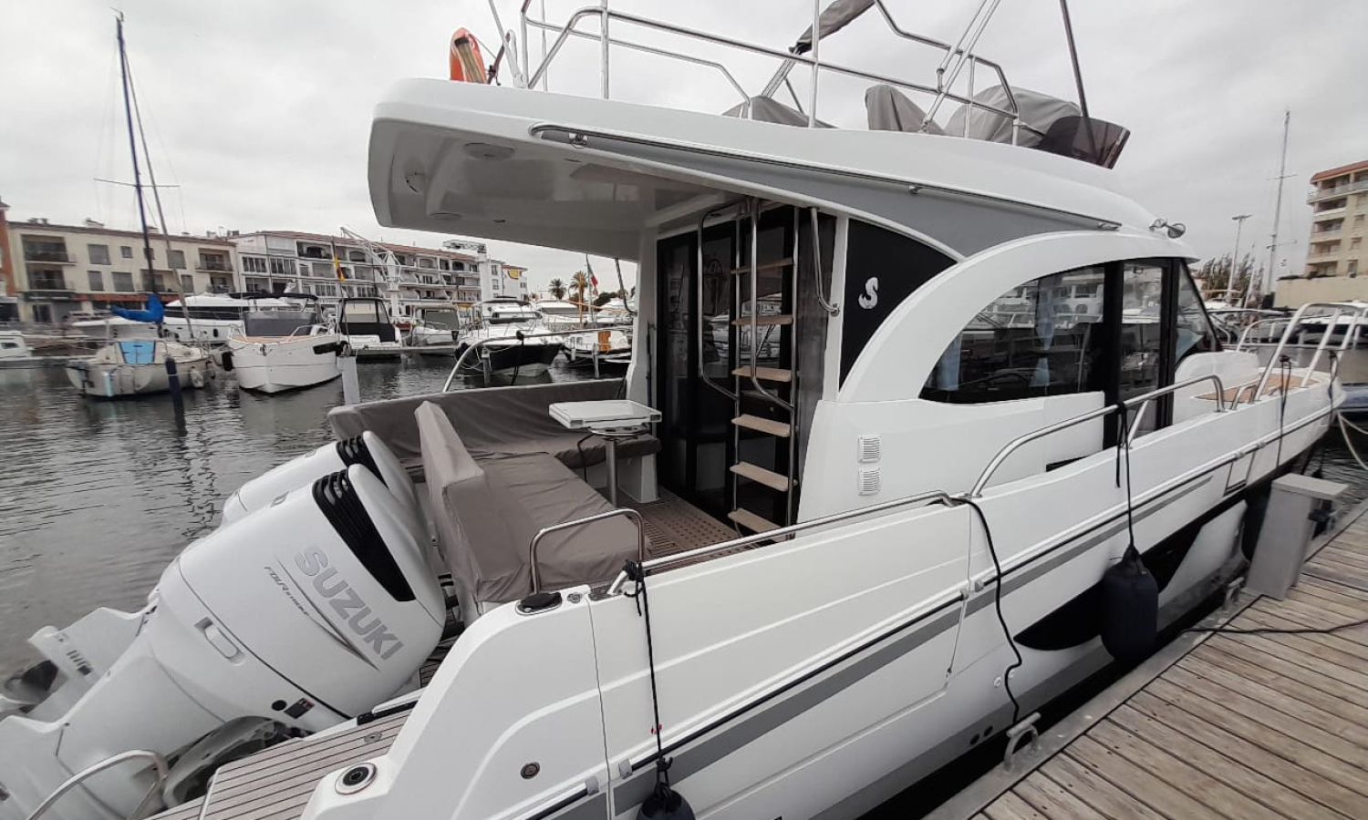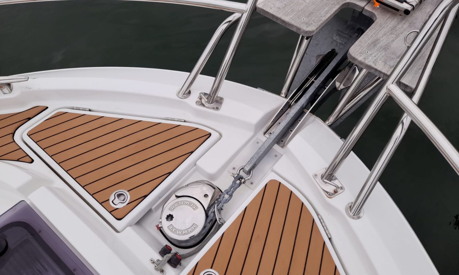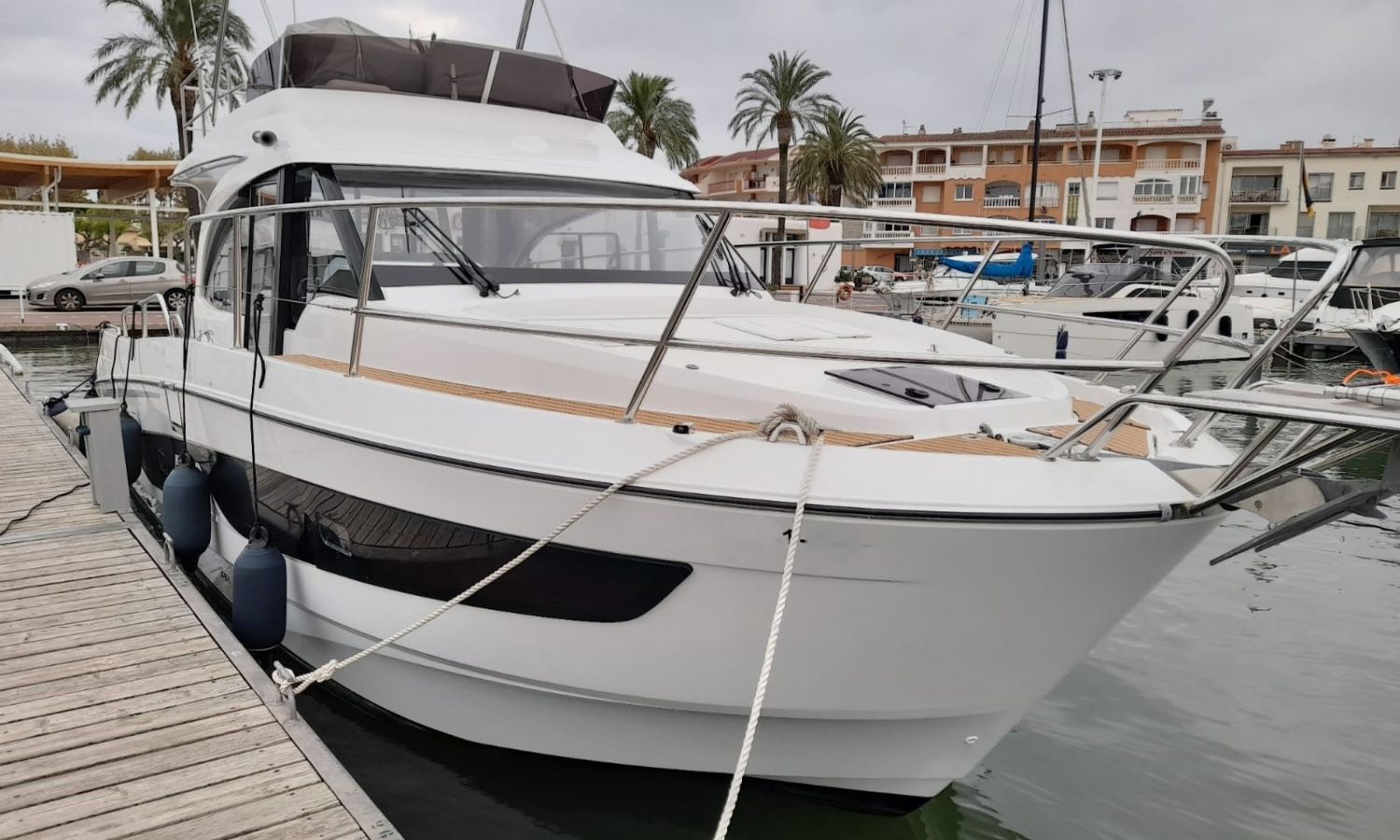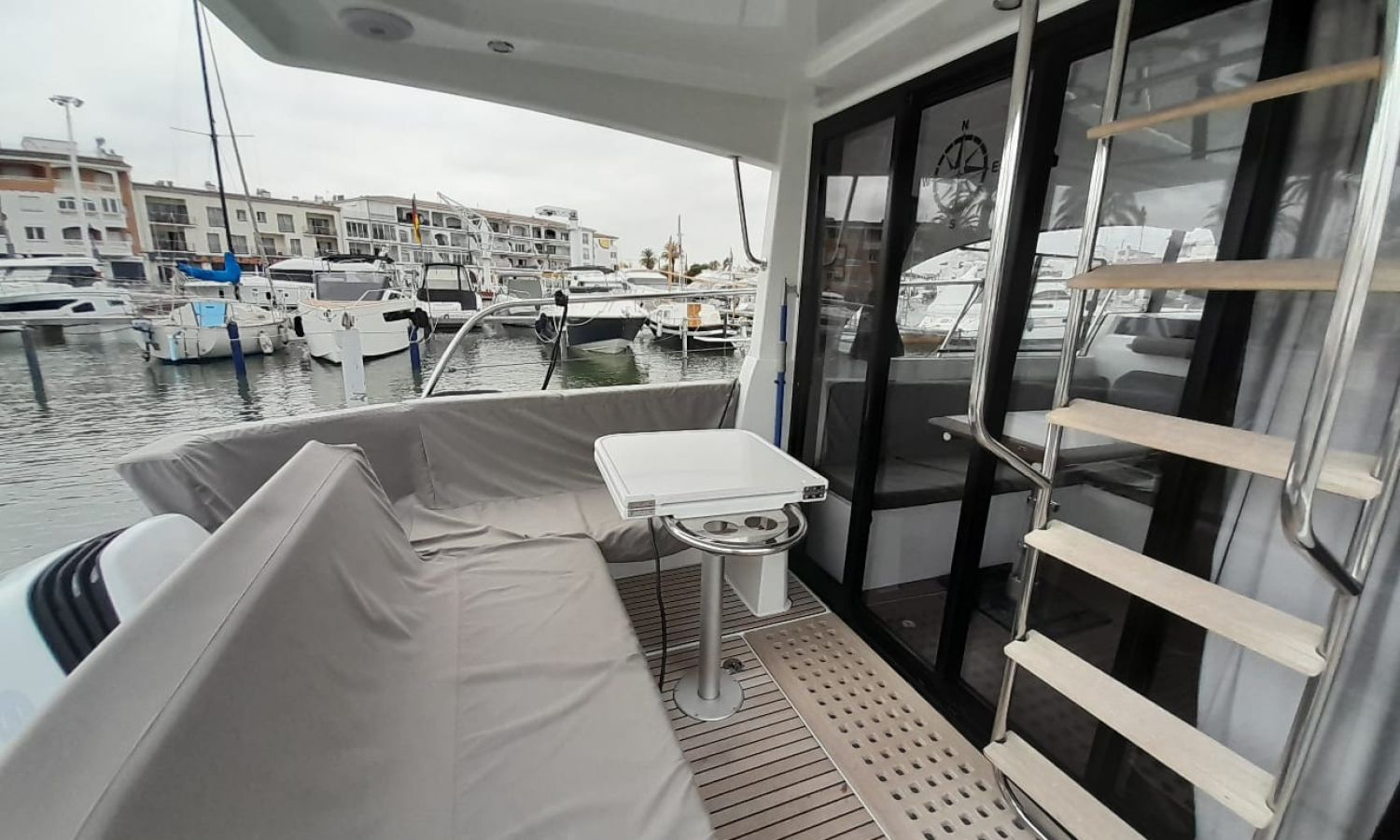 Flybridge - Toldo parasol - Solarium de proa - Escalera de baño - Mesa en la bañera - Teca - Ducha - Toma de puerto - Cargador de baterias - Generador - Aire acondicionado - Molinete eléctrico con ancla y cadena - 2 Cabinas - Wc eléctrico con depósito de aguas negras - Mandos electrónicos - Gps/Plotter/Sonda - Hélice de proa - VHF - Equipo de audio Fusion - Nevera 12 V. - Fregadero - Microondas - Antifouling.Descripción embarcación