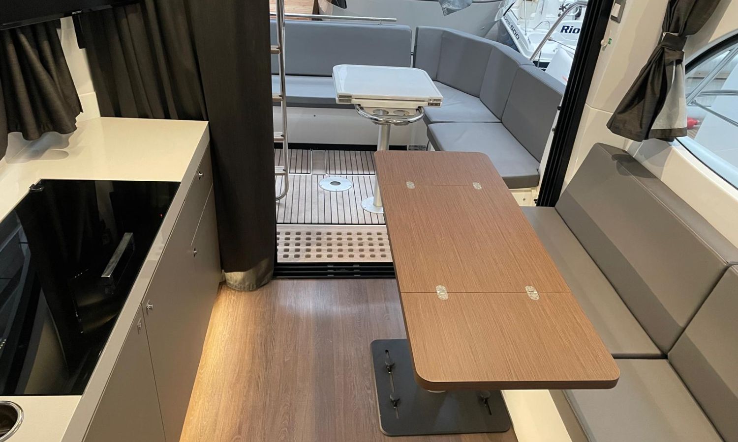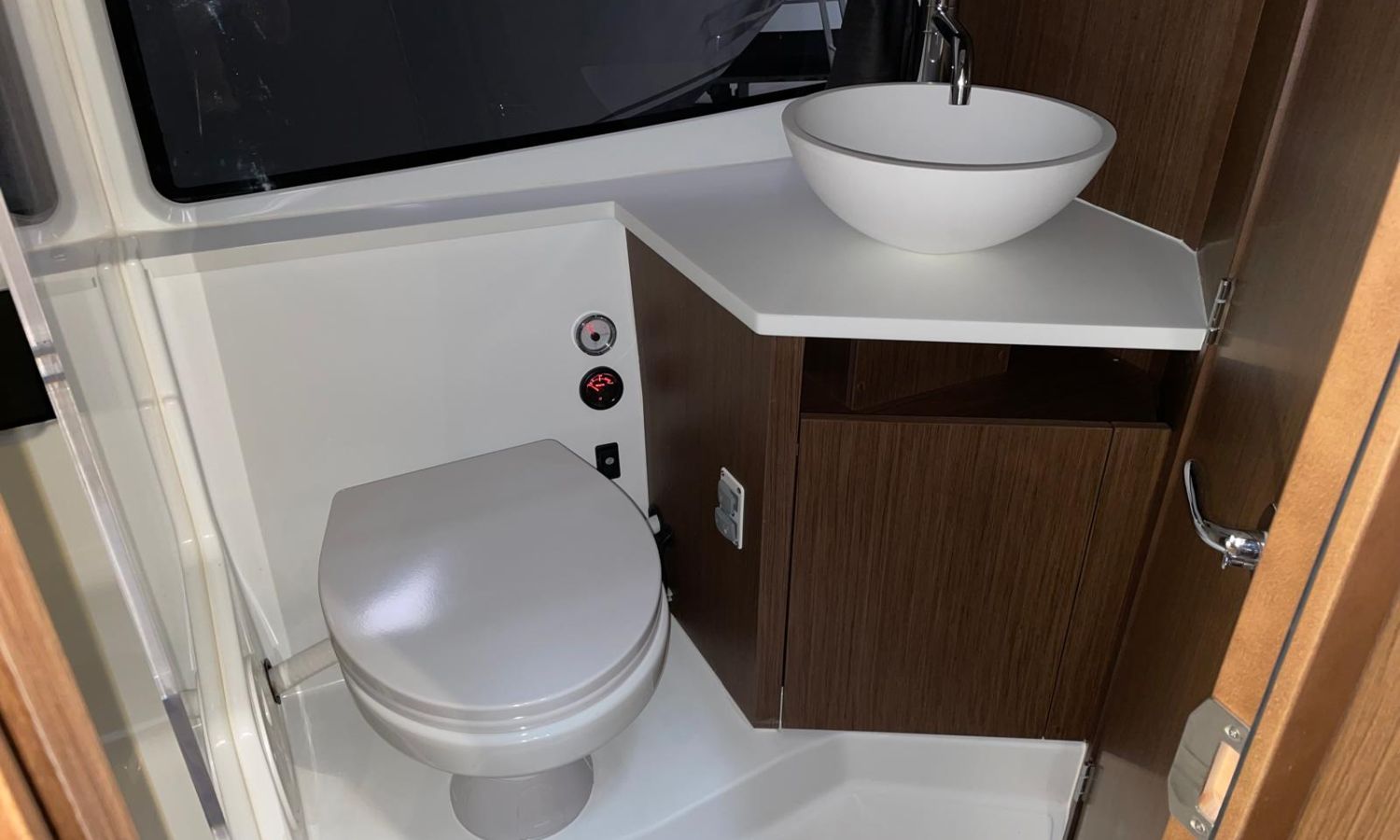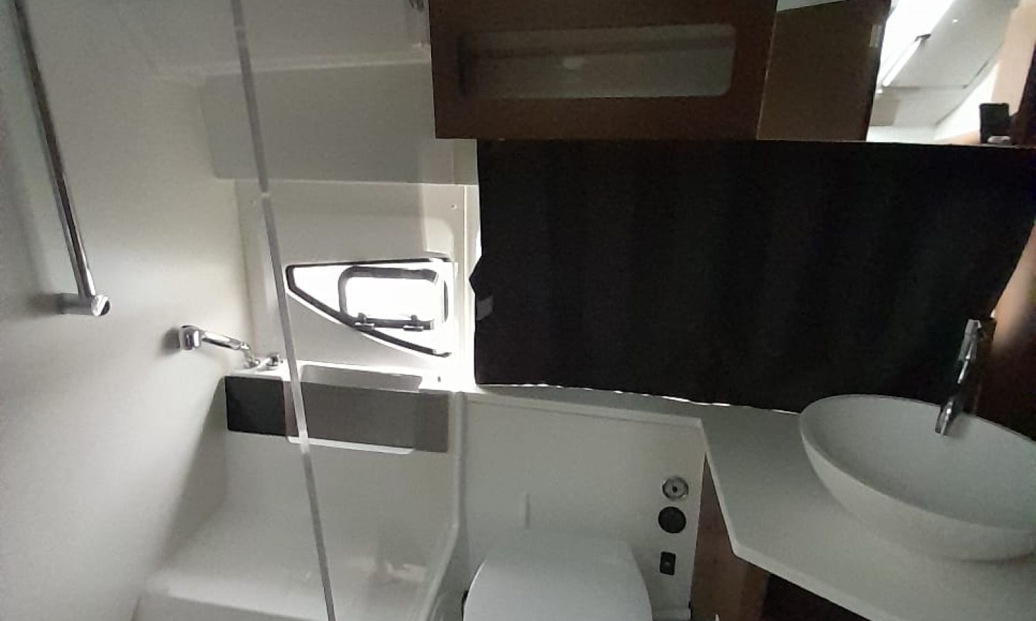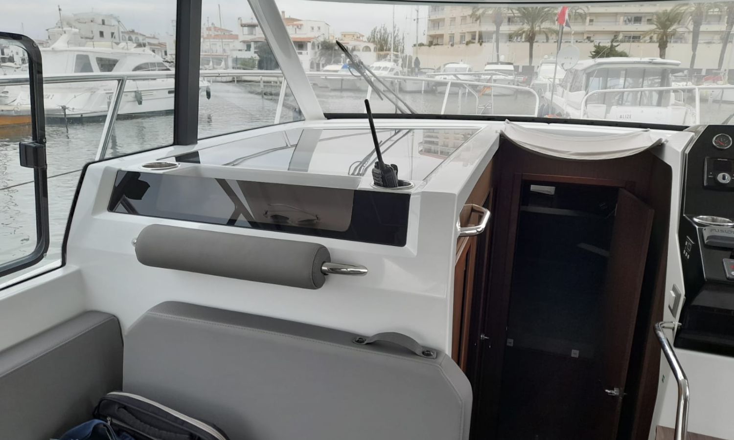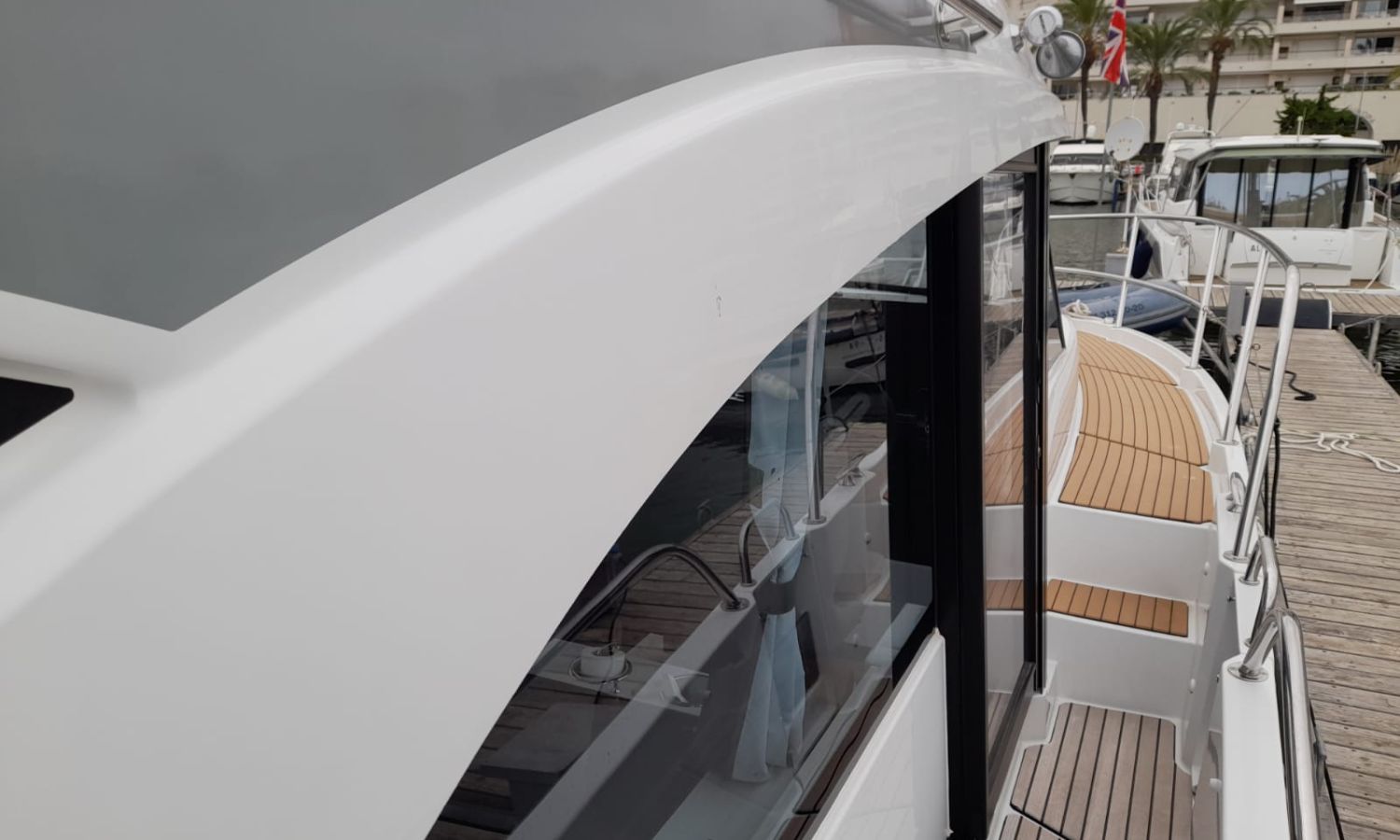 Flybridge - Toldo parasol - Solarium de proa - Escalera de baño - Mesa en la bañera - Teca - Ducha - Toma de puerto - Cargador de baterias - Generador - Aire acondicionado - Molinete eléctrico con ancla y cadena - 2 Cabinas - Wc eléctrico con depósito de aguas negras - Mandos electrónicos - Gps/Plotter/Sonda - Hélice de proa - VHF - Equipo de audio Fusion - Nevera 12 V. - Fregadero - Microondas - Antifouling.Descripción embarcación