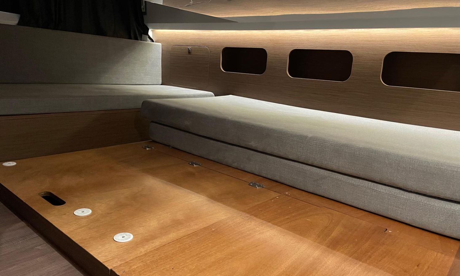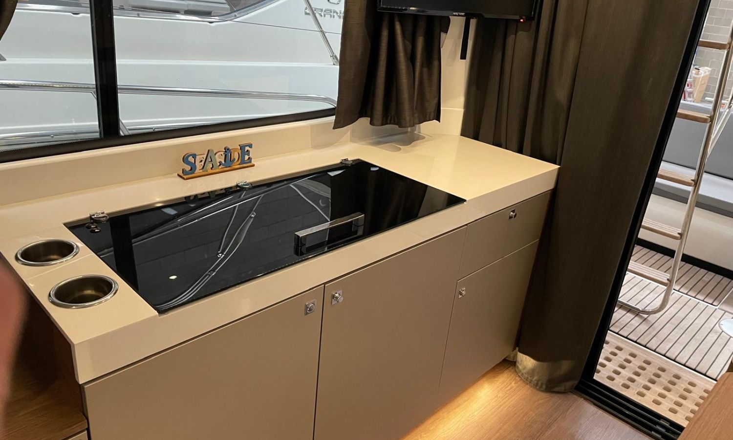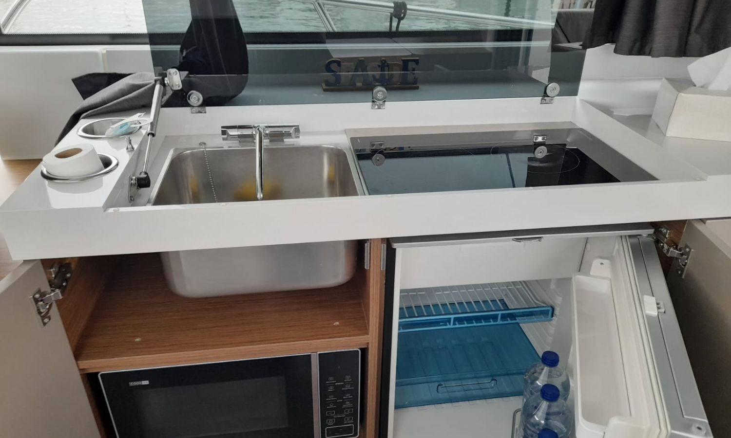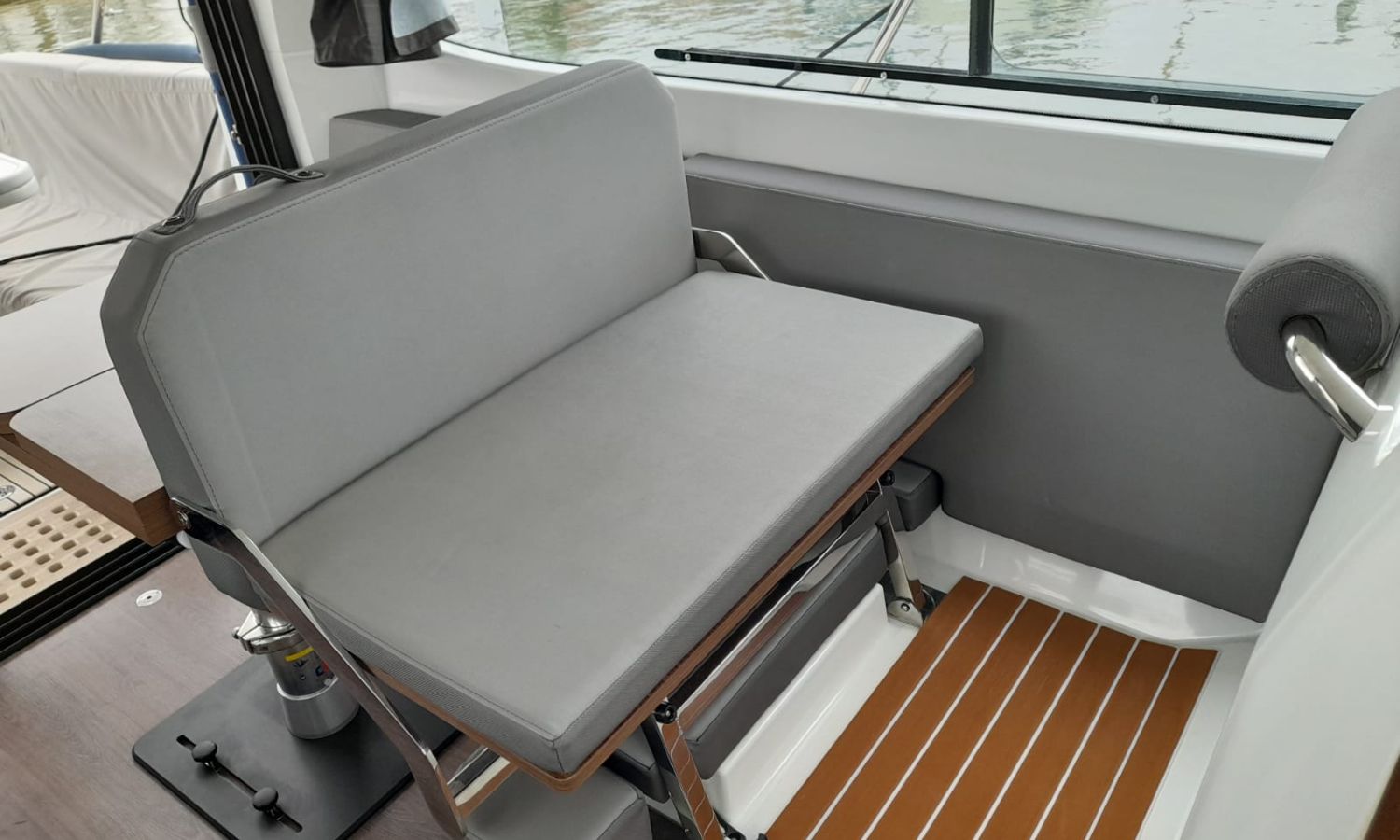 Flybridge - Toldo parasol - Solarium de proa - Escalera de baño - Mesa en la bañera - Teca - Ducha - Toma de puerto - Cargador de baterias - Generador - Aire acondicionado - Molinete eléctrico con ancla y cadena - 2 Cabinas - Wc eléctrico con depósito de aguas negras - Mandos electrónicos - Gps/Plotter/Sonda - Hélice de proa - VHF - Equipo de audio Fusion - Nevera 12 V. - Fregadero - Microondas - Antifouling.Descripción embarcación