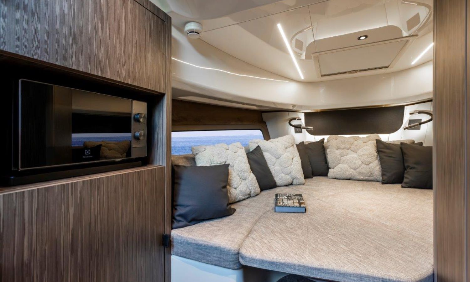 Joystick + Cruise control + Single lever control + Trip computer + Power trim assistance + Joystick docking - Depósito de aguas negras - Antifouling color negro - Coberturas para cuadro de mandos y asiento piloto y copiloto - Colchoneta de proa con cobertura - Hélice de proa - Frigorífico en cabina 90 l - Frigorífico en bañera 35 l - 3 Luces subacuáticas - 6 Defensas y fundas - Superficie de teka en los trancaniles laterales - Plataforma de popa en teka - Teka en la entrada de la bañera y en el lateral plegable - Bañera en teka en la zona de conducción - Lona de fondeo - Molinete eléctrico 800 W, cadena de 50 m y ancla de 16 kg Ultramarine en acero inoxidable - Copia certificado CE y declaración de conformidad - Coberturas defensas (color alternativo al estándar) - Interiores en madera Dark Grey 11.11 - Suelo interior en duelas de roble - Tapicería exterior Silvertex (color alternativo al estándar) - Capa protectora brillante para mesa de teka bañera - Preparación, botadura, entrega y prueba de mar - Tranporte astillero a Costa Brava.Descripción embarcación