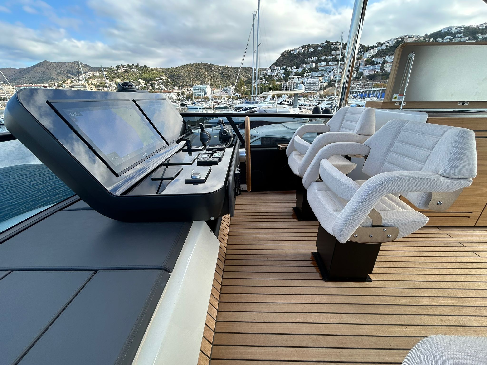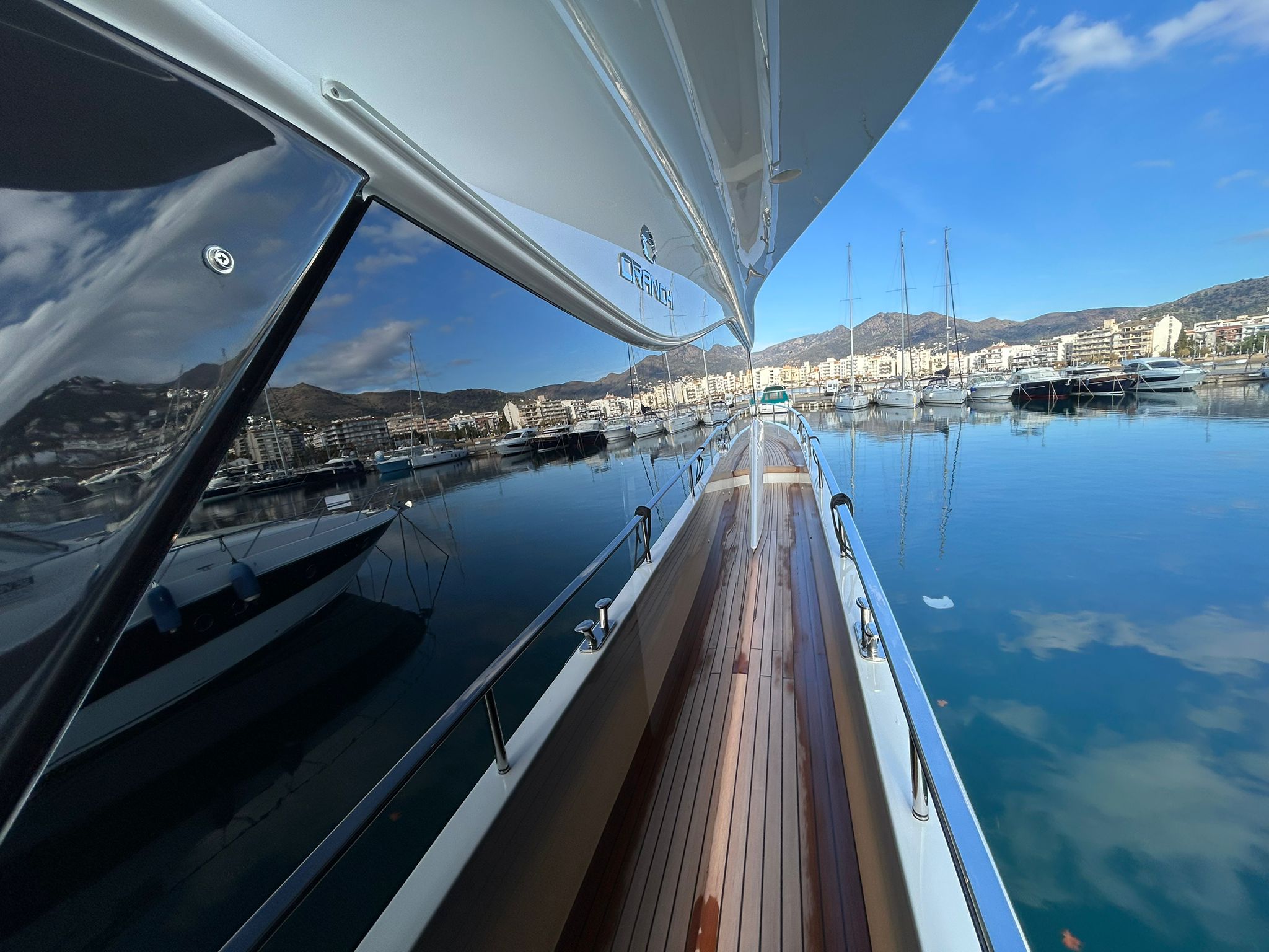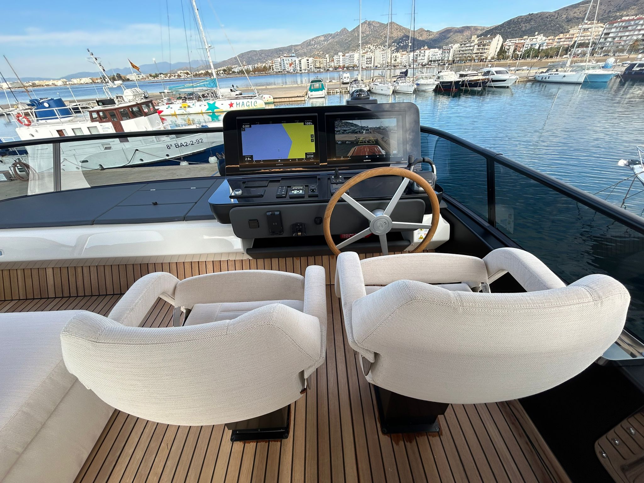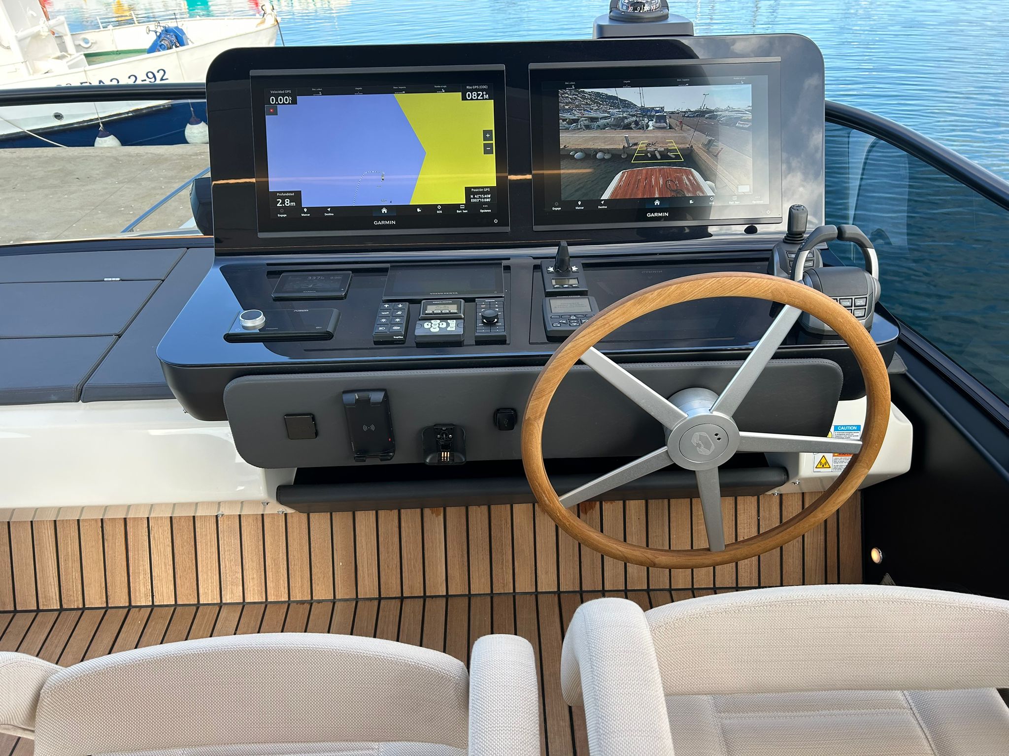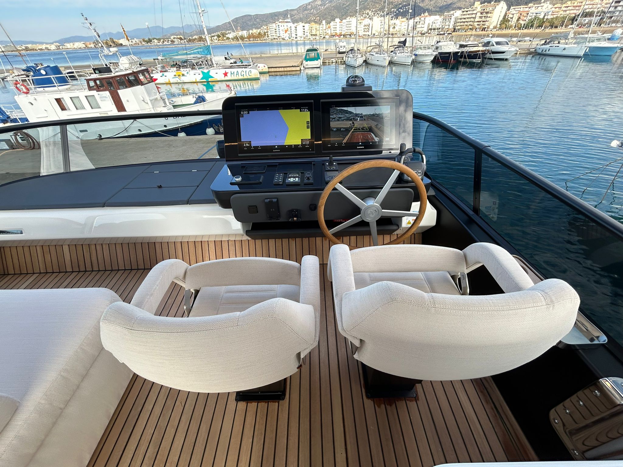 Ancla 60 Kg Ultramarine en acero inoxidable y cadena de acero inoxidable de 100 m - Enrolladores eléctricos cable línea de muelle de 20 m con mando a distancia - Zona de playa a popa: ducha con radio, luces y cargador inalámbrico para smartphone - Lino para 3 camarotes y cabina marinero: set de sábanas, fundas de almohadas, funda de colchón, colcha, toallas, etc. - Bidé en el baño de la cabina del armador - Bimini top de proa con palos de carbono - Cajafuerte electrónica en cabina armador - 6 cabos de amarre - Cobertura para dinette en bañera de popa - Coberturas flybridge - Desalinizadora 160 l/h con mando en cabina y sistema lavado con agua dulce - Hélice de proa proporcional - Faro pirata - Nevera en el sofá de la colchoneta de proa - Suplemento generador de 20,5 kW - Tercer puesto de mando en la bañera - Máquina de hielo con tanque de agua separado - Lavadora y secadora Miele - 7 Luces subacuáticas (3 a popa y 2 a cada lado) - Oscurantes para cristales de proa y laterales - Bimini top de popa vertical - Escotilla eléctrica en la timonería - Pasarela hidráulica telescópica retráctil - Fin Stabilizations System Humphree - Asiento interior copiloto - Puerta de acceso lateral a popa estribor - Puerta de acceso lateral a popa babor - Segunda pantalla plotter 22" en flybridge - Segunda pantalla plotter 22" en cubierta principal - Set de vajilla, vasos y cubiertos para 6 personas - Estabilizador giroscópico Seakeeper 9 - Surround view camera system Garmin - Superficie de teka en los trancaniles laterales proa/popa - Teka en el flybridge - Toldo de popa eléctrico en el flybridge - T-Top flybridge con láminas de apertura eléctrica - TV LED en salón con dispositivo eléctrico retráctil y sistema Home Theatre - TV 55" LED en cabina del armador y radio Bluetooth/USB - TV 43" LED en la cabina VIP y radio Bluetooth/USB - Certificado CE y declaración de conformidad - Transporte, montaje con varada y control general en el Cranchi Marine Test Centre en Venecia - Suplemento transporte T-Top - Decoración interior "Amalfi": combinación de colores de los muebles, suelos de madera, tejidos y mármoles - Pintura de la línea de belleza en el casco de color negro - T-Top lacado negro - 2 Cúpulas vacías para antena satélite TV6/60 cm.Descripción embarcación
