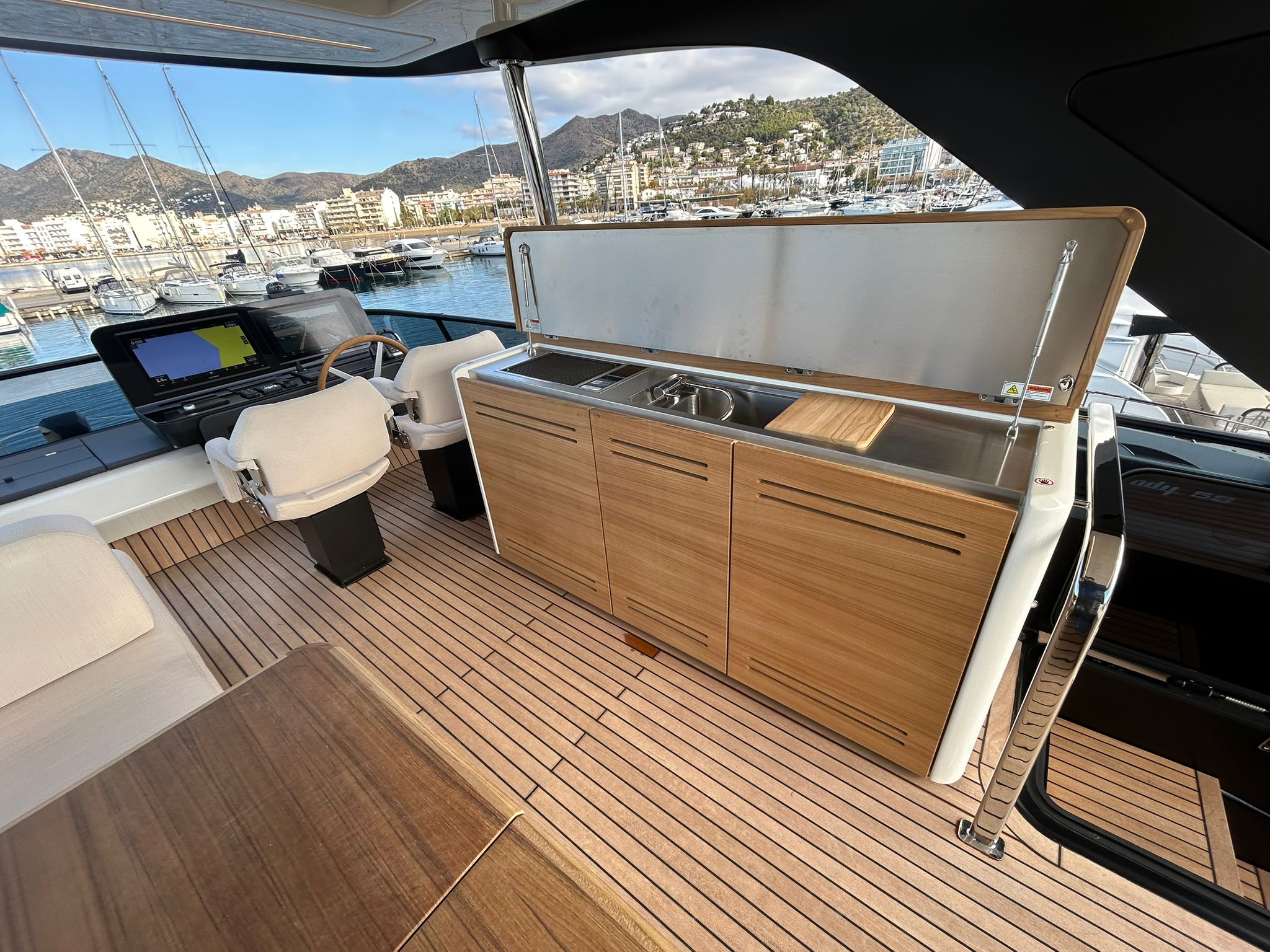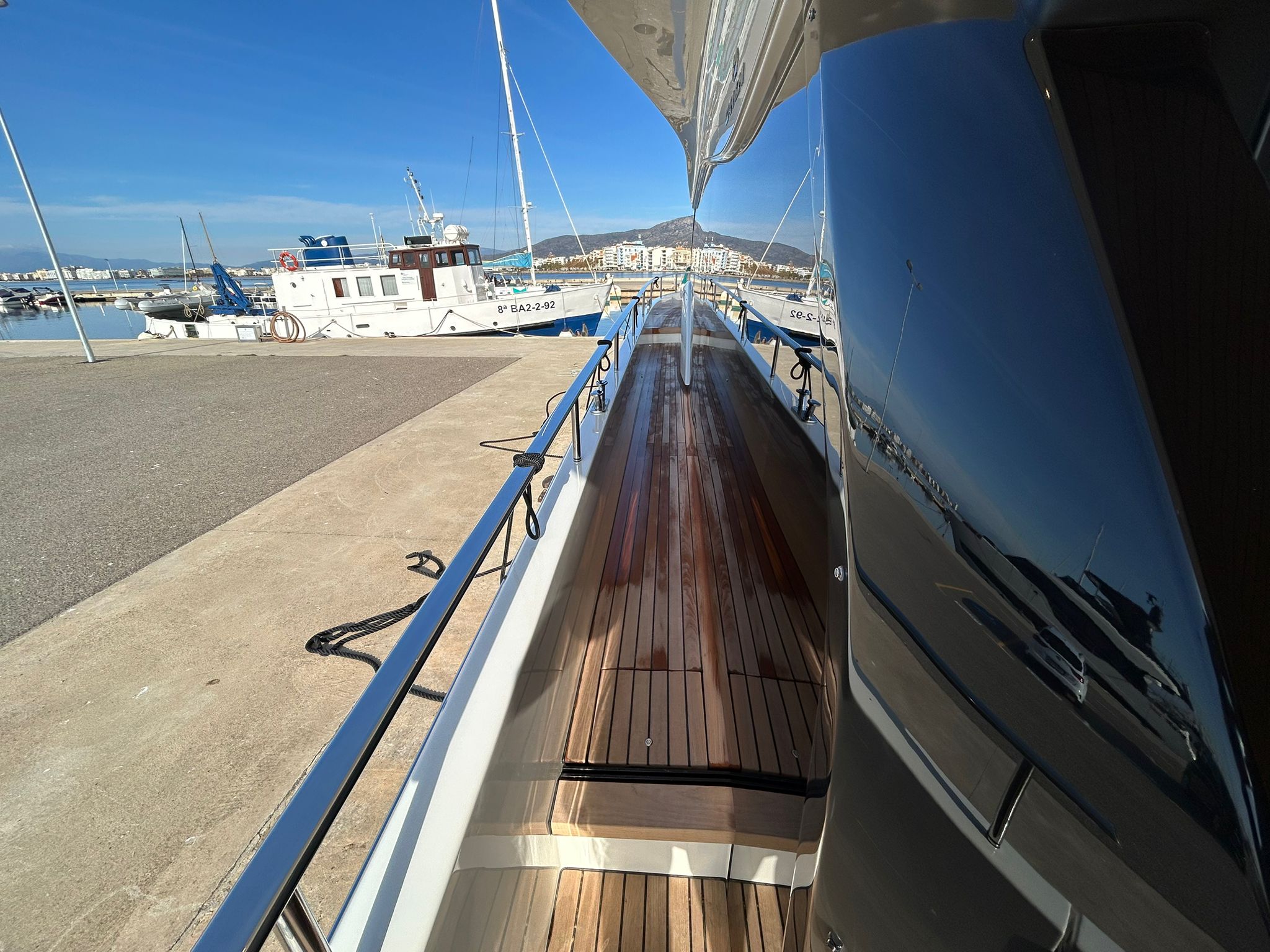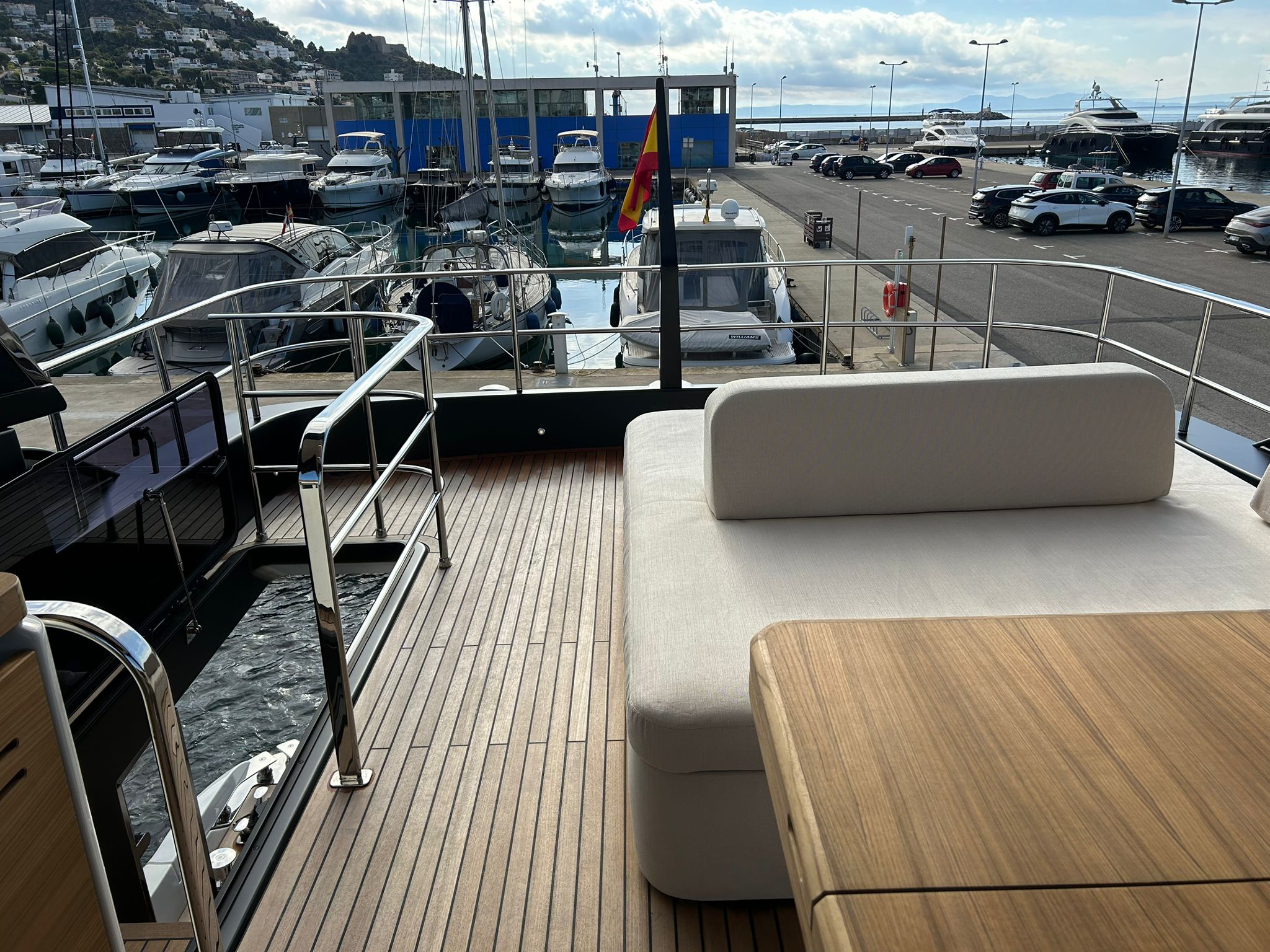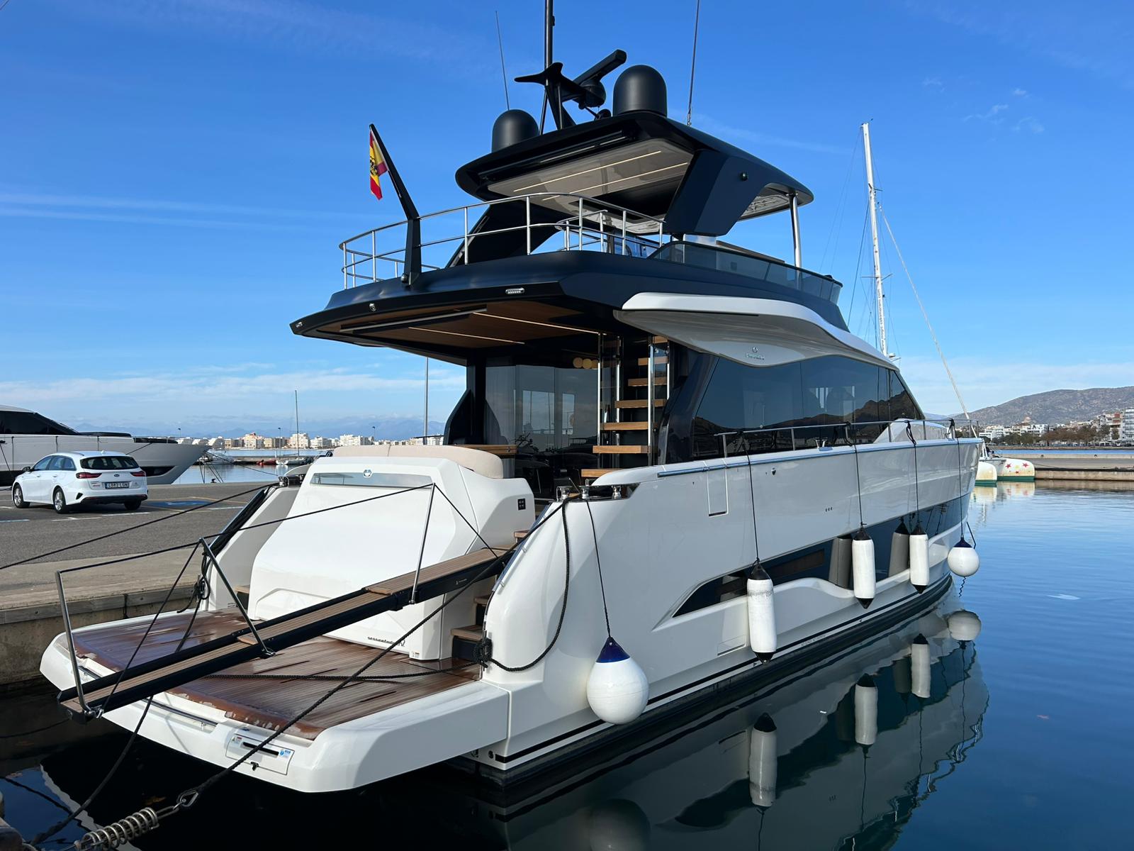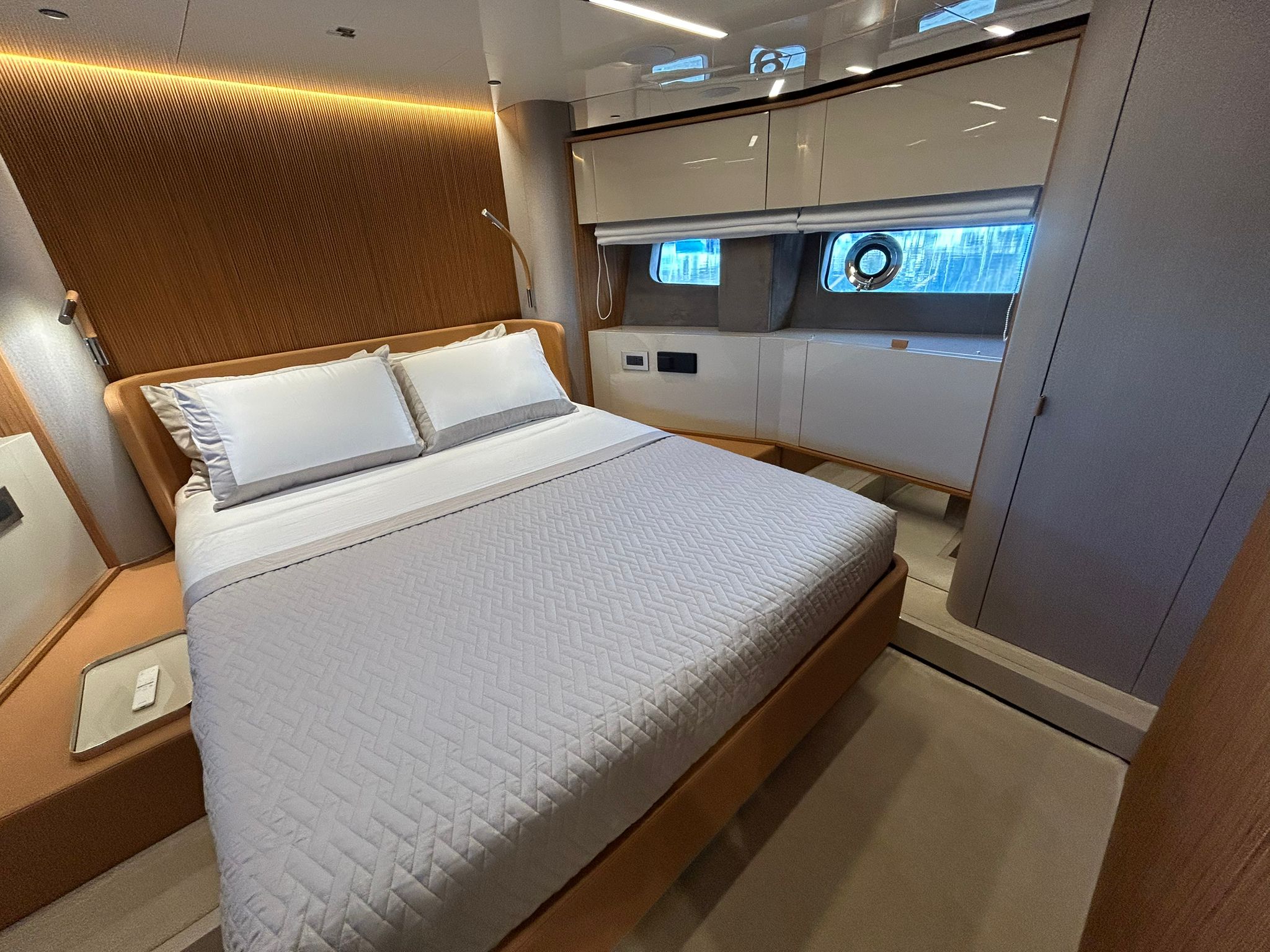 Ancla 60 Kg Ultramarine en acero inoxidable y cadena de acero inoxidable de 100 m - Enrolladores eléctricos cable línea de muelle de 20 m con mando a distancia - Zona de playa a popa: ducha con radio, luces y cargador inalámbrico para smartphone - Lino para 3 camarotes y cabina marinero: set de sábanas, fundas de almohadas, funda de colchón, colcha, toallas, etc. - Bidé en el baño de la cabina del armador - Bimini top de proa con palos de carbono - Cajafuerte electrónica en cabina armador - 6 cabos de amarre - Cobertura para dinette en bañera de popa - Coberturas flybridge - Desalinizadora 160 l/h con mando en cabina y sistema lavado con agua dulce - Hélice de proa proporcional - Faro pirata - Nevera en el sofá de la colchoneta de proa - Suplemento generador de 20,5 kW - Tercer puesto de mando en la bañera - Máquina de hielo con tanque de agua separado - Lavadora y secadora Miele - 7 Luces subacuáticas (3 a popa y 2 a cada lado) - Oscurantes para cristales de proa y laterales - Bimini top de popa vertical - Escotilla eléctrica en la timonería - Pasarela hidráulica telescópica retráctil - Fin Stabilizations System Humphree - Asiento interior copiloto - Puerta de acceso lateral a popa estribor - Puerta de acceso lateral a popa babor - Segunda pantalla plotter 22" en flybridge - Segunda pantalla plotter 22" en cubierta principal - Set de vajilla, vasos y cubiertos para 6 personas - Estabilizador giroscópico Seakeeper 9 - Surround view camera system Garmin - Superficie de teka en los trancaniles laterales proa/popa - Teka en el flybridge - Toldo de popa eléctrico en el flybridge - T-Top flybridge con láminas de apertura eléctrica - TV LED en salón con dispositivo eléctrico retráctil y sistema Home Theatre - TV 55" LED en cabina del armador y radio Bluetooth/USB - TV 43" LED en la cabina VIP y radio Bluetooth/USB - Certificado CE y declaración de conformidad - Transporte, montaje con varada y control general en el Cranchi Marine Test Centre en Venecia - Suplemento transporte T-Top - Decoración interior "Amalfi": combinación de colores de los muebles, suelos de madera, tejidos y mármoles - Pintura de la línea de belleza en el casco de color negro - T-Top lacado negro - 2 Cúpulas vacías para antena satélite TV6/60 cm.Descripción embarcación