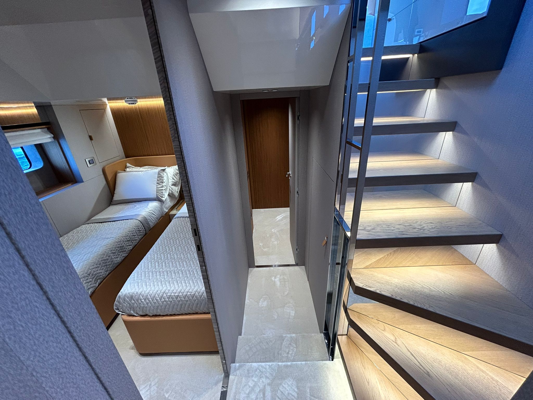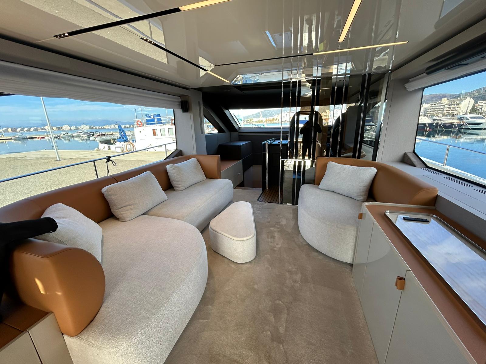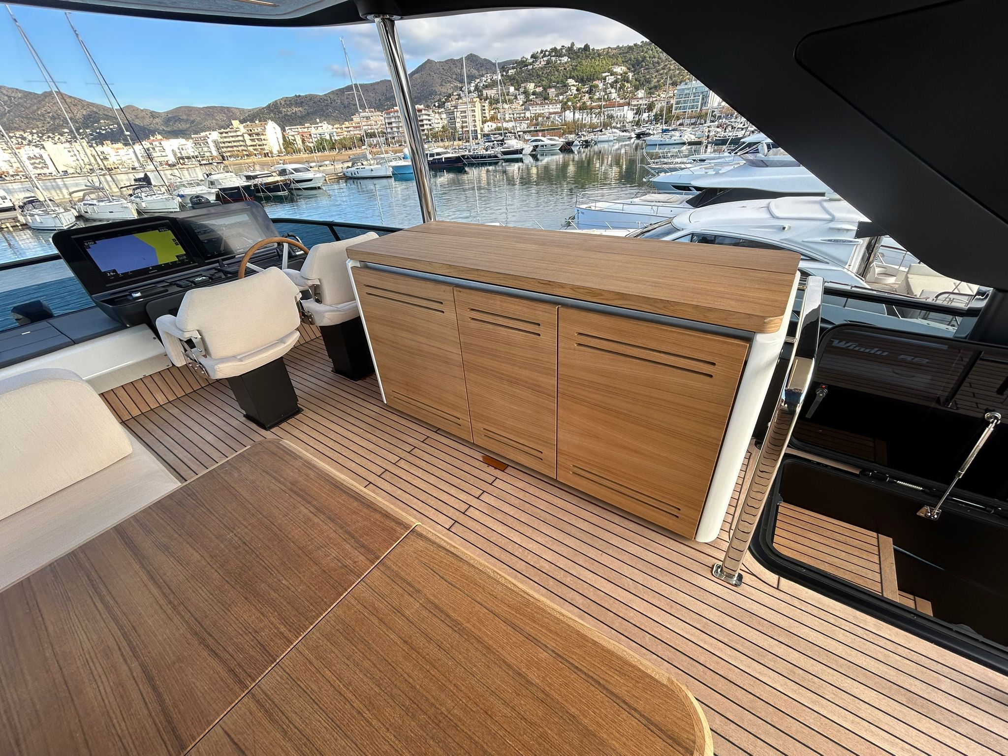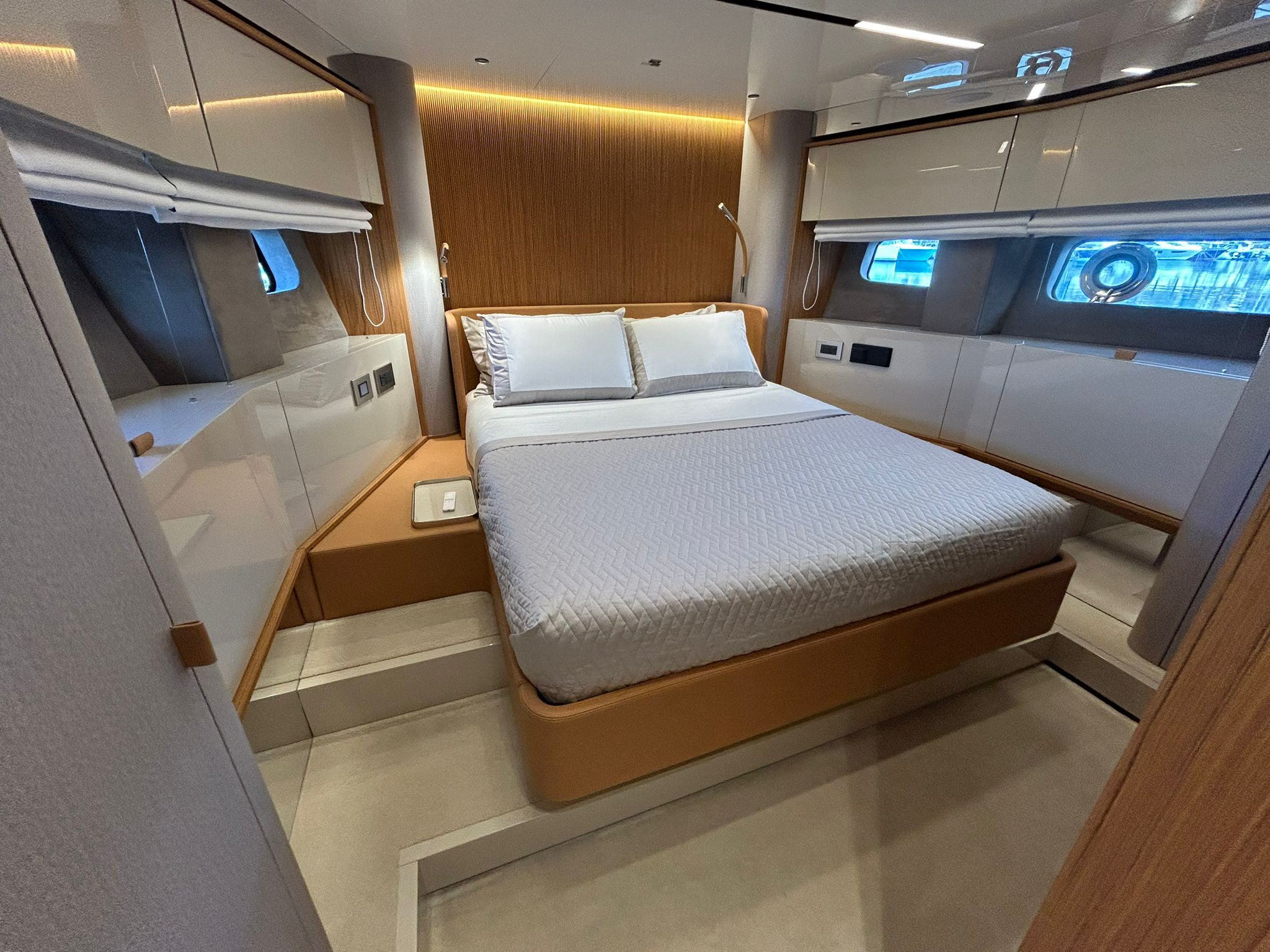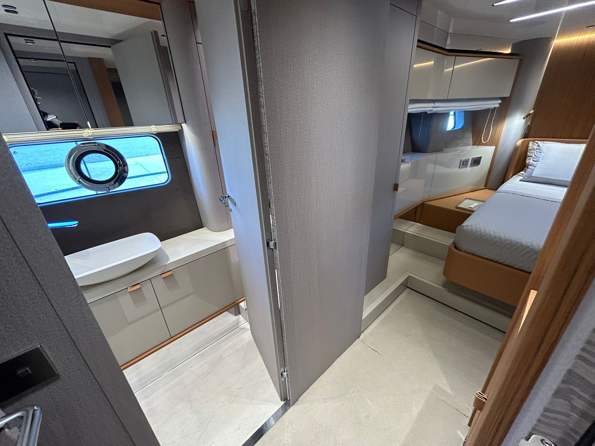 Ancla 60 Kg Ultramarine en acero inoxidable y cadena de acero inoxidable de 100 m - Enrolladores eléctricos cable línea de muelle de 20 m con mando a distancia - Zona de playa a popa: ducha con radio, luces y cargador inalámbrico para smartphone - Lino para 3 camarotes y cabina marinero: set de sábanas, fundas de almohadas, funda de colchón, colcha, toallas, etc. - Bidé en el baño de la cabina del armador - Bimini top de proa con palos de carbono - Cajafuerte electrónica en cabina armador - 6 cabos de amarre - Cobertura para dinette en bañera de popa - Coberturas flybridge - Desalinizadora 160 l/h con mando en cabina y sistema lavado con agua dulce - Hélice de proa proporcional - Faro pirata - Nevera en el sofá de la colchoneta de proa - Suplemento generador de 20,5 kW - Tercer puesto de mando en la bañera - Máquina de hielo con tanque de agua separado - Lavadora y secadora Miele - 7 Luces subacuáticas (3 a popa y 2 a cada lado) - Oscurantes para cristales de proa y laterales - Bimini top de popa vertical - Escotilla eléctrica en la timonería - Pasarela hidráulica telescópica retráctil - Fin Stabilizations System Humphree - Asiento interior copiloto - Puerta de acceso lateral a popa estribor - Puerta de acceso lateral a popa babor - Segunda pantalla plotter 22" en flybridge - Segunda pantalla plotter 22" en cubierta principal - Set de vajilla, vasos y cubiertos para 6 personas - Estabilizador giroscópico Seakeeper 9 - Surround view camera system Garmin - Superficie de teka en los trancaniles laterales proa/popa - Teka en el flybridge - Toldo de popa eléctrico en el flybridge - T-Top flybridge con láminas de apertura eléctrica - TV LED en salón con dispositivo eléctrico retráctil y sistema Home Theatre - TV 55" LED en cabina del armador y radio Bluetooth/USB - TV 43" LED en la cabina VIP y radio Bluetooth/USB - Certificado CE y declaración de conformidad - Transporte, montaje con varada y control general en el Cranchi Marine Test Centre en Venecia - Suplemento transporte T-Top - Decoración interior "Amalfi": combinación de colores de los muebles, suelos de madera, tejidos y mármoles - Pintura de la línea de belleza en el casco de color negro - T-Top lacado negro - 2 Cúpulas vacías para antena satélite TV6/60 cm.Descripción embarcación