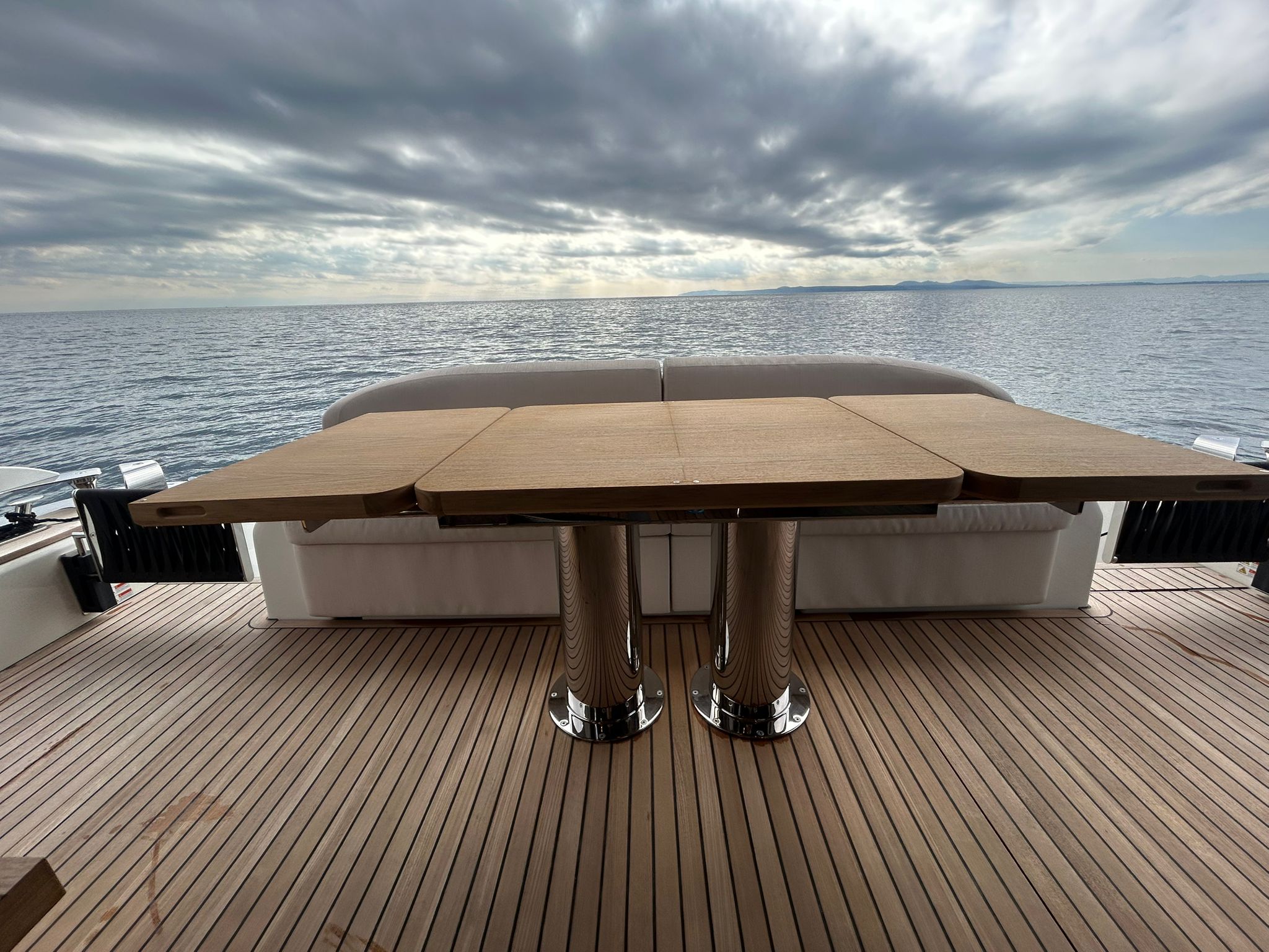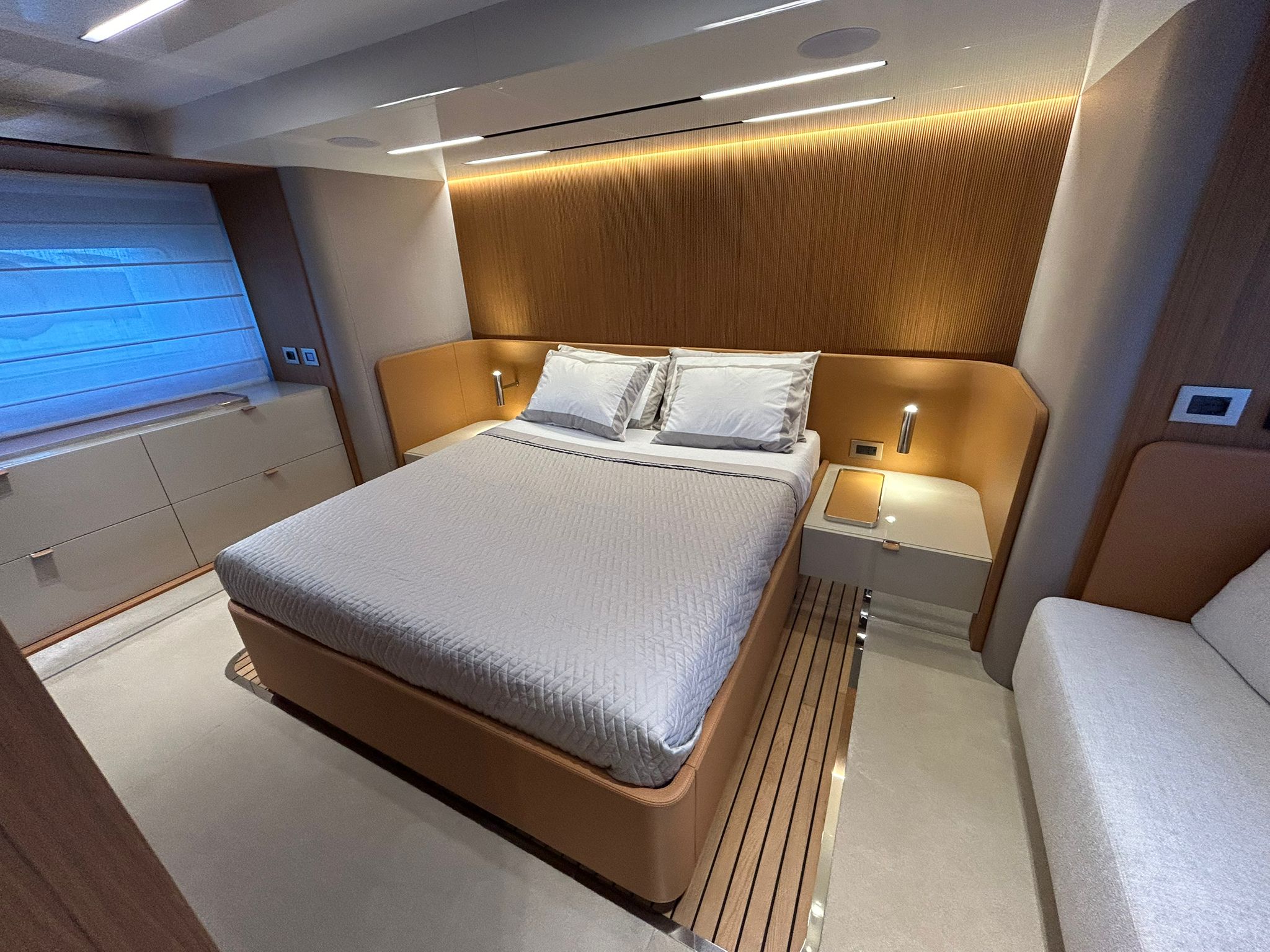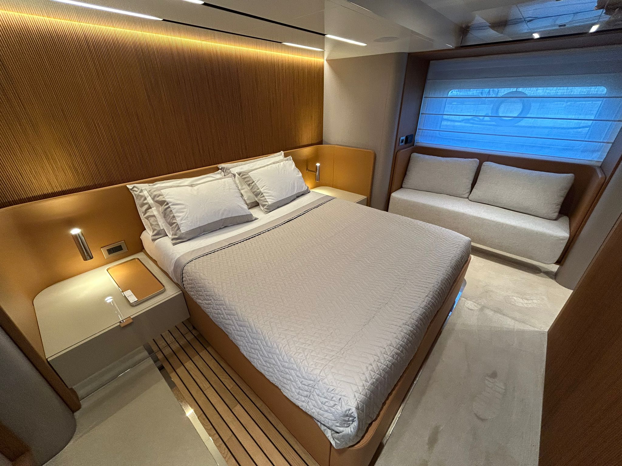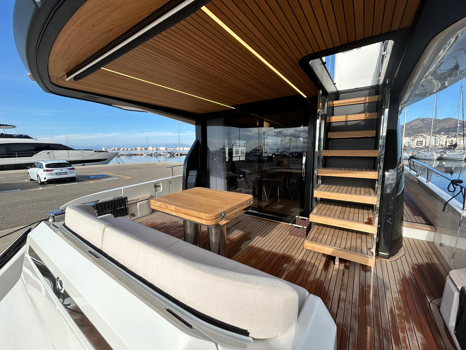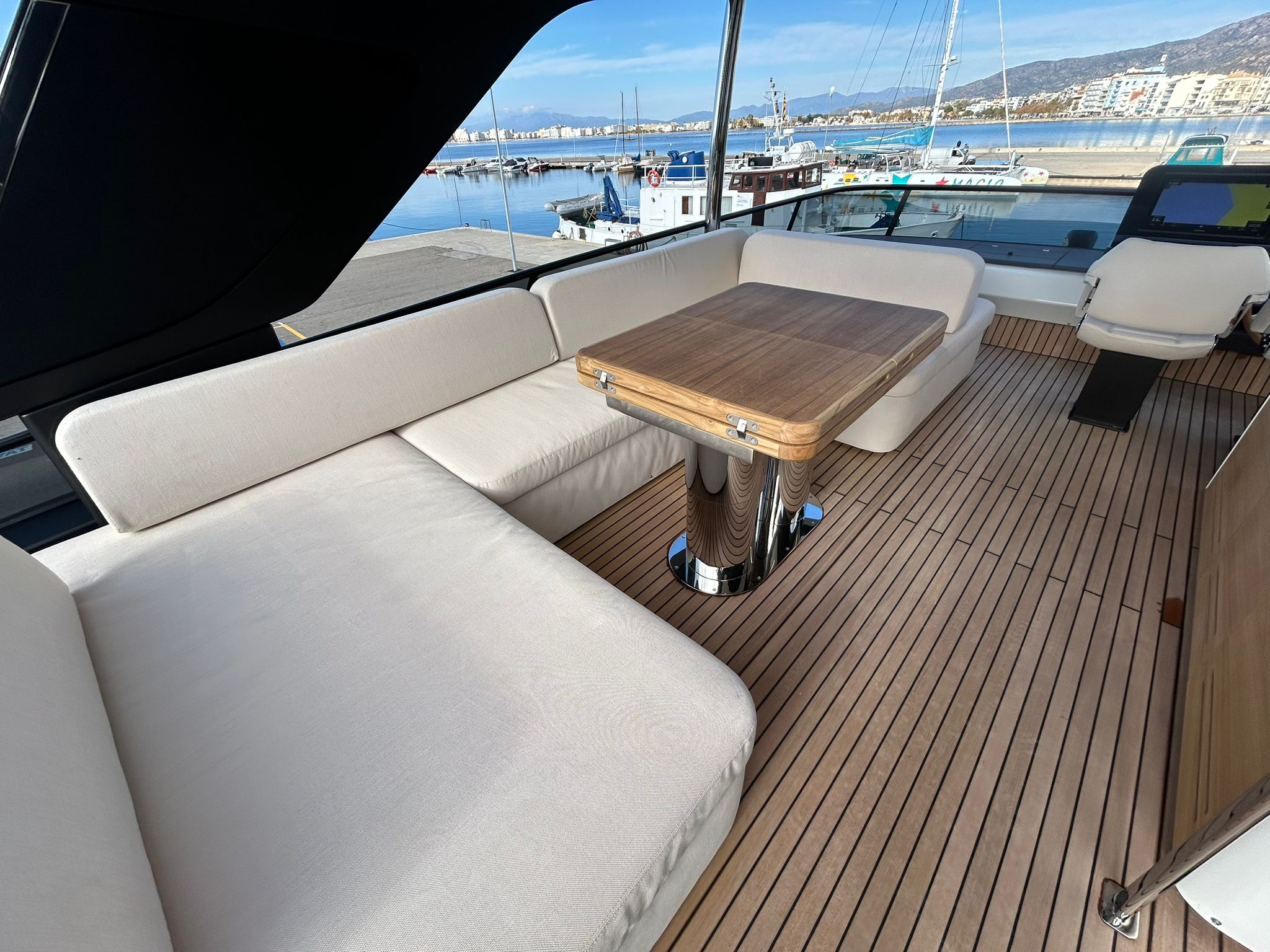 Ancla 60 Kg Ultramarine en acero inoxidable y cadena de acero inoxidable de 100 m - Enrolladores eléctricos cable línea de muelle de 20 m con mando a distancia - Zona de playa a popa: ducha con radio, luces y cargador inalámbrico para smartphone - Lino para 3 camarotes y cabina marinero: set de sábanas, fundas de almohadas, funda de colchón, colcha, toallas, etc. - Bidé en el baño de la cabina del armador - Bimini top de proa con palos de carbono - Cajafuerte electrónica en cabina armador - 6 cabos de amarre - Cobertura para dinette en bañera de popa - Coberturas flybridge - Desalinizadora 160 l/h con mando en cabina y sistema lavado con agua dulce - Hélice de proa proporcional - Faro pirata - Nevera en el sofá de la colchoneta de proa - Suplemento generador de 20,5 kW - Tercer puesto de mando en la bañera - Máquina de hielo con tanque de agua separado - Lavadora y secadora Miele - 7 Luces subacuáticas (3 a popa y 2 a cada lado) - Oscurantes para cristales de proa y laterales - Bimini top de popa vertical - Escotilla eléctrica en la timonería - Pasarela hidráulica telescópica retráctil - Fin Stabilizations System Humphree - Asiento interior copiloto - Puerta de acceso lateral a popa estribor - Puerta de acceso lateral a popa babor - Segunda pantalla plotter 22" en flybridge - Segunda pantalla plotter 22" en cubierta principal - Set de vajilla, vasos y cubiertos para 6 personas - Estabilizador giroscópico Seakeeper 9 - Surround view camera system Garmin - Superficie de teka en los trancaniles laterales proa/popa - Teka en el flybridge - Toldo de popa eléctrico en el flybridge - T-Top flybridge con láminas de apertura eléctrica - TV LED en salón con dispositivo eléctrico retráctil y sistema Home Theatre - TV 55" LED en cabina del armador y radio Bluetooth/USB - TV 43" LED en la cabina VIP y radio Bluetooth/USB - Certificado CE y declaración de conformidad - Transporte, montaje con varada y control general en el Cranchi Marine Test Centre en Venecia - Suplemento transporte T-Top - Decoración interior "Amalfi": combinación de colores de los muebles, suelos de madera, tejidos y mármoles - Pintura de la línea de belleza en el casco de color negro - T-Top lacado negro - 2 Cúpulas vacías para antena satélite TV6/60 cm.Descripción embarcación