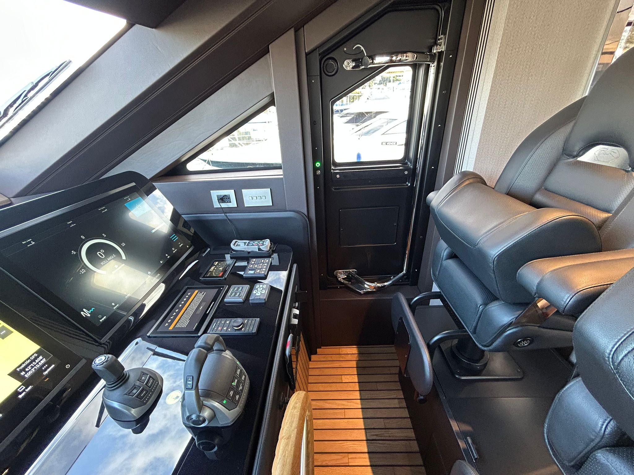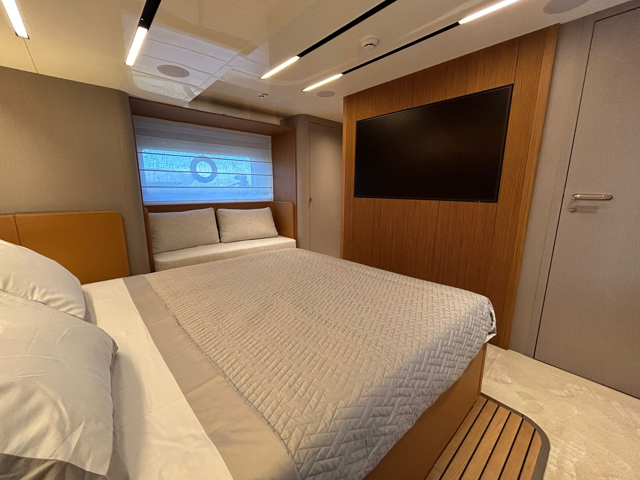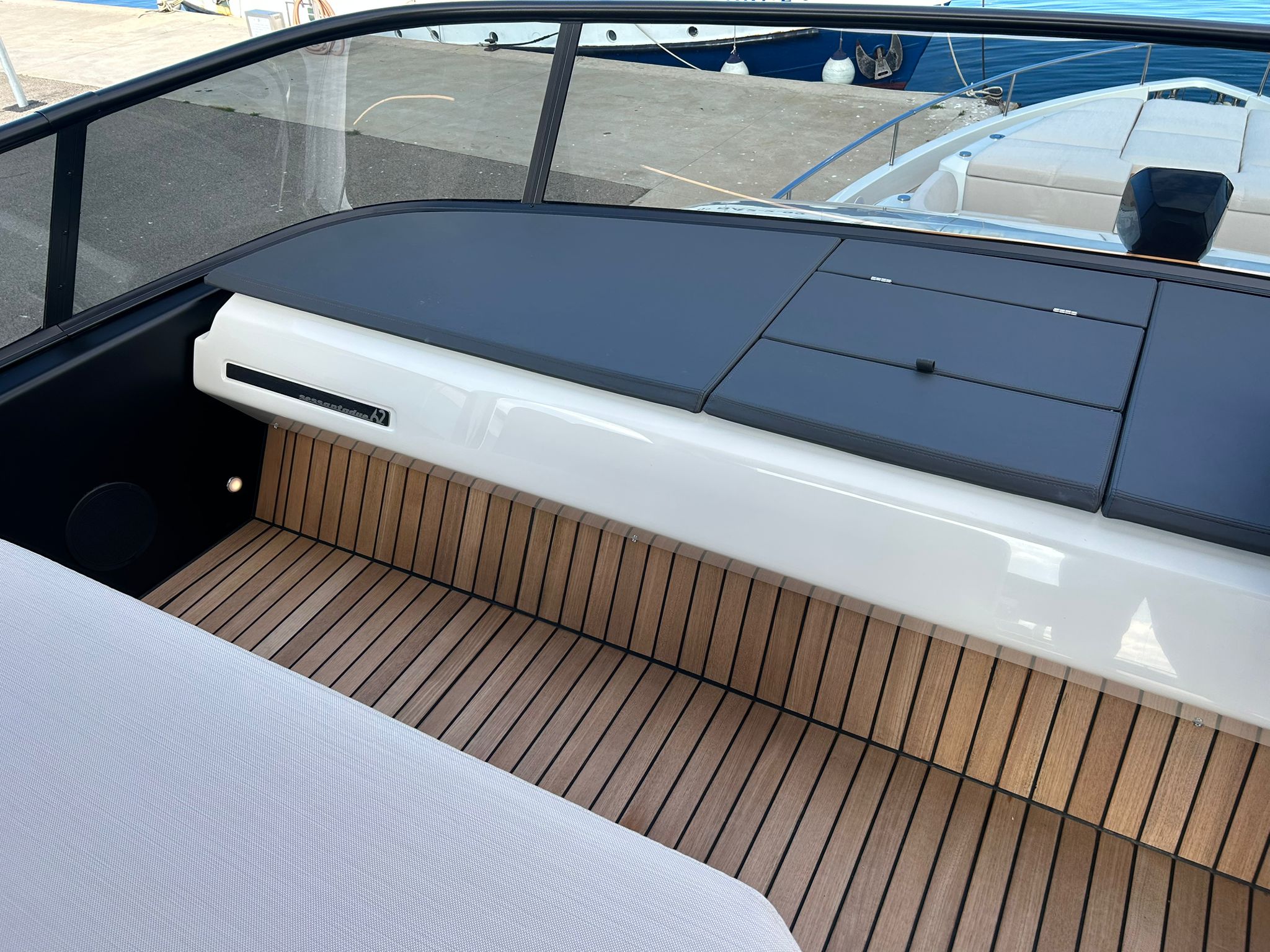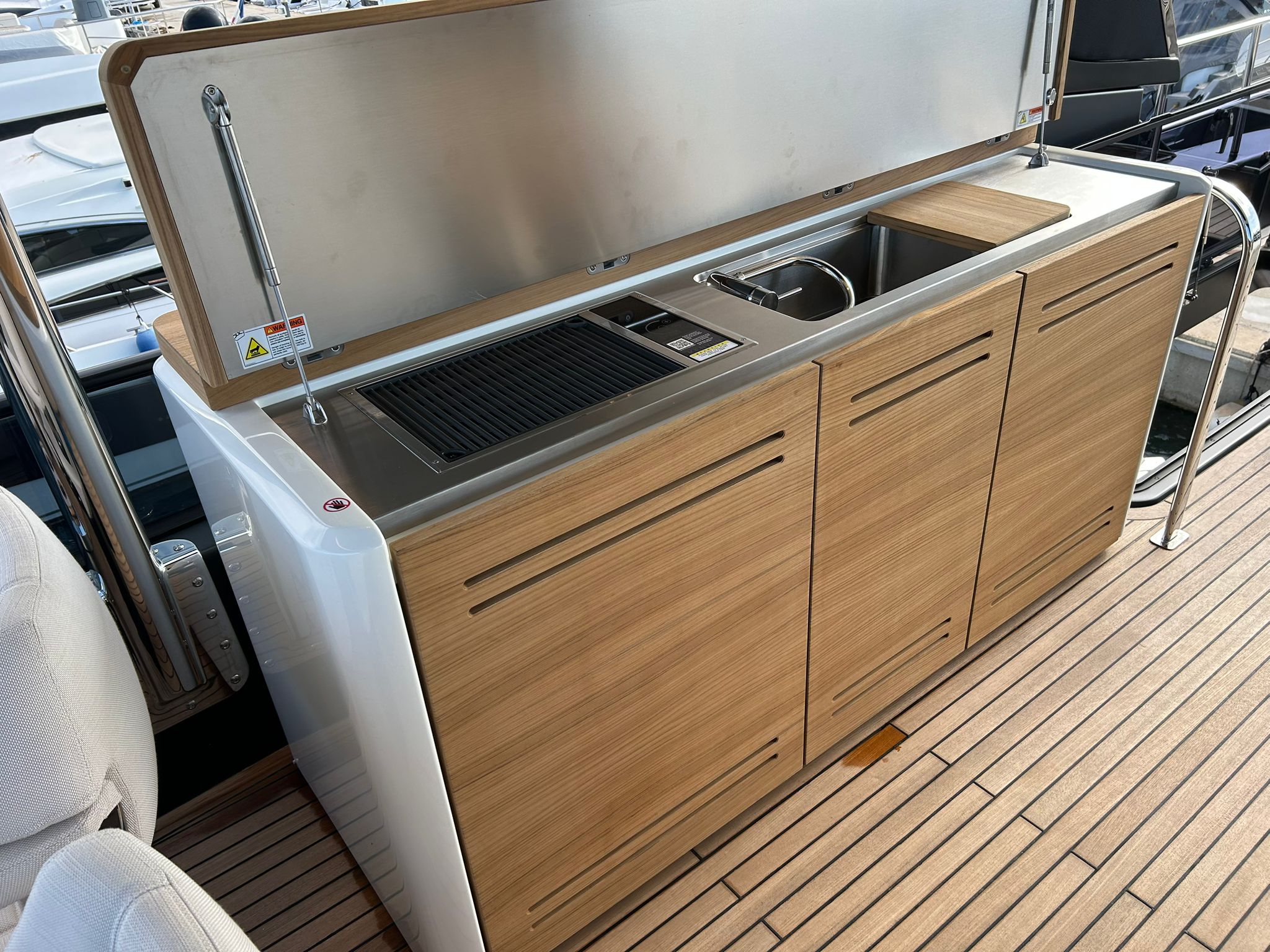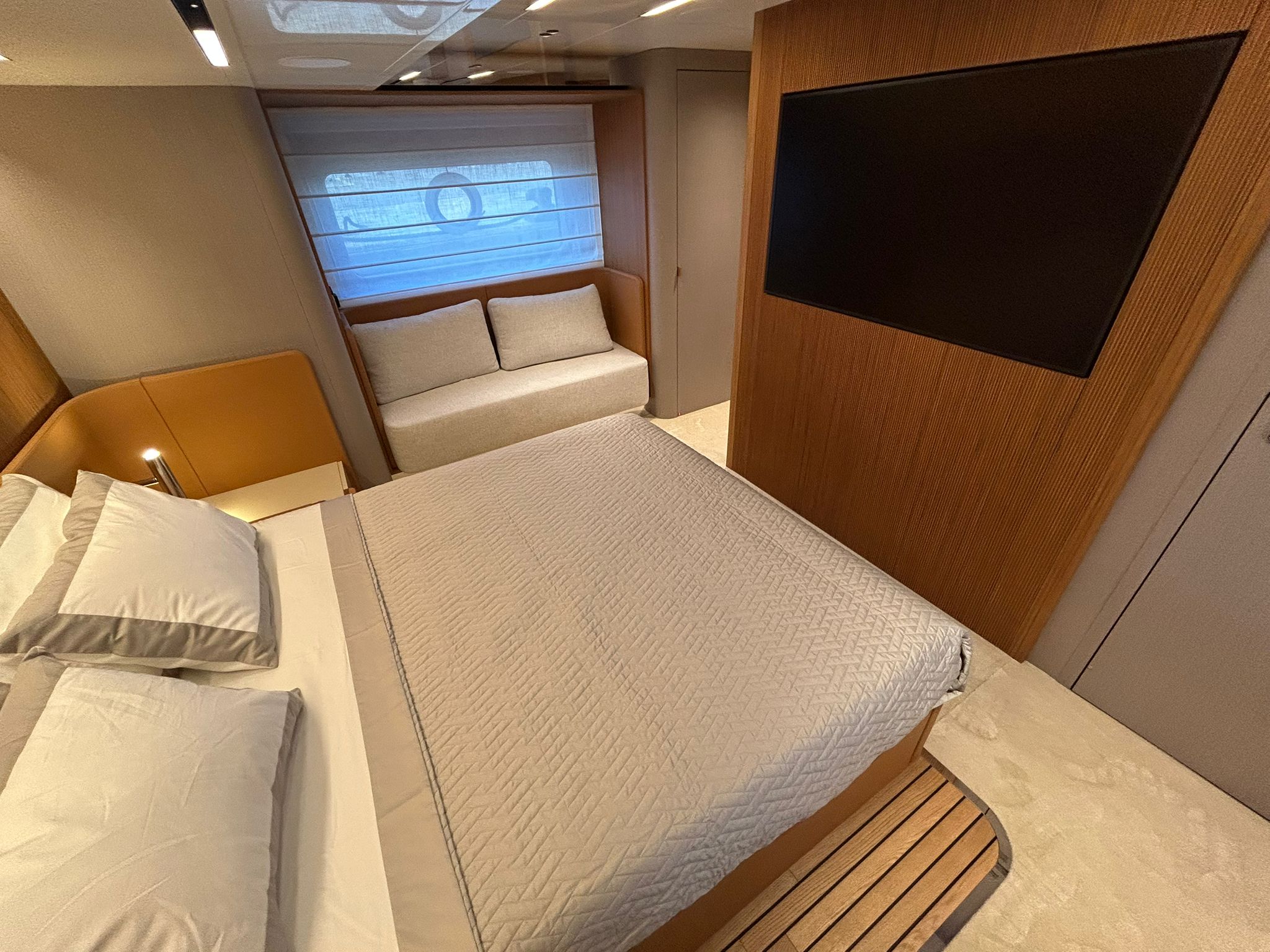 Ancla 60 Kg Ultramarine en acero inoxidable y cadena de acero inoxidable de 100 m - Enrolladores eléctricos cable línea de muelle de 20 m con mando a distancia - Zona de playa a popa: ducha con radio, luces y cargador inalámbrico para smartphone - Lino para 3 camarotes y cabina marinero: set de sábanas, fundas de almohadas, funda de colchón, colcha, toallas, etc. - Bidé en el baño de la cabina del armador - Bimini top de proa con palos de carbono - Cajafuerte electrónica en cabina armador - 6 cabos de amarre - Cobertura para dinette en bañera de popa - Coberturas flybridge - Desalinizadora 160 l/h con mando en cabina y sistema lavado con agua dulce - Hélice de proa proporcional - Faro pirata - Nevera en el sofá de la colchoneta de proa - Suplemento generador de 20,5 kW - Tercer puesto de mando en la bañera - Máquina de hielo con tanque de agua separado - Lavadora y secadora Miele - 7 Luces subacuáticas (3 a popa y 2 a cada lado) - Oscurantes para cristales de proa y laterales - Bimini top de popa vertical - Escotilla eléctrica en la timonería - Pasarela hidráulica telescópica retráctil - Fin Stabilizations System Humphree - Asiento interior copiloto - Puerta de acceso lateral a popa estribor - Puerta de acceso lateral a popa babor - Segunda pantalla plotter 22" en flybridge - Segunda pantalla plotter 22" en cubierta principal - Set de vajilla, vasos y cubiertos para 6 personas - Estabilizador giroscópico Seakeeper 9 - Surround view camera system Garmin - Superficie de teka en los trancaniles laterales proa/popa - Teka en el flybridge - Toldo de popa eléctrico en el flybridge - T-Top flybridge con láminas de apertura eléctrica - TV LED en salón con dispositivo eléctrico retráctil y sistema Home Theatre - TV 55" LED en cabina del armador y radio Bluetooth/USB - TV 43" LED en la cabina VIP y radio Bluetooth/USB - Certificado CE y declaración de conformidad - Transporte, montaje con varada y control general en el Cranchi Marine Test Centre en Venecia - Suplemento transporte T-Top - Decoración interior "Amalfi": combinación de colores de los muebles, suelos de madera, tejidos y mármoles - Pintura de la línea de belleza en el casco de color negro - T-Top lacado negro - 2 Cúpulas vacías para antena satélite TV6/60 cm.Descripción embarcación