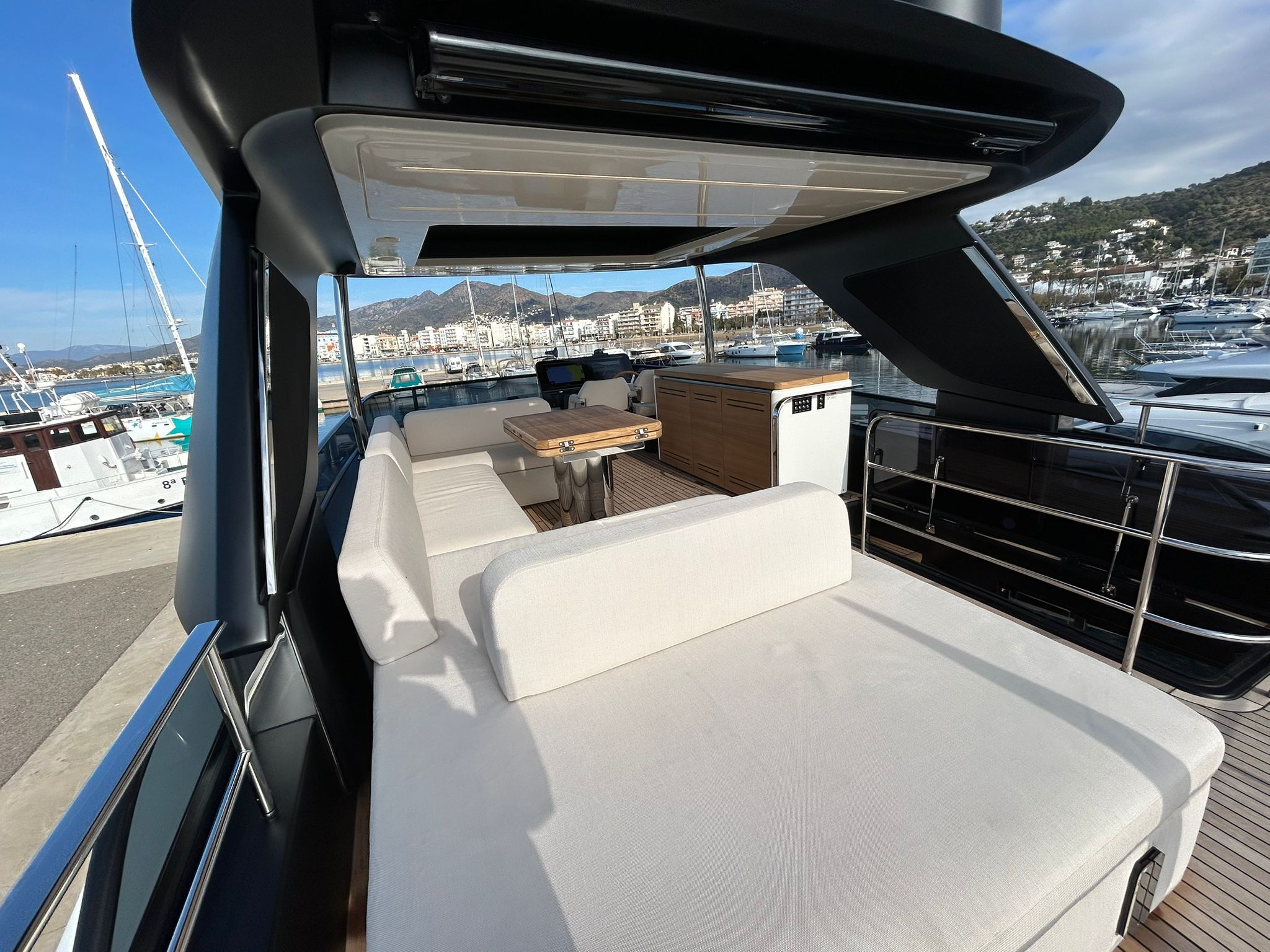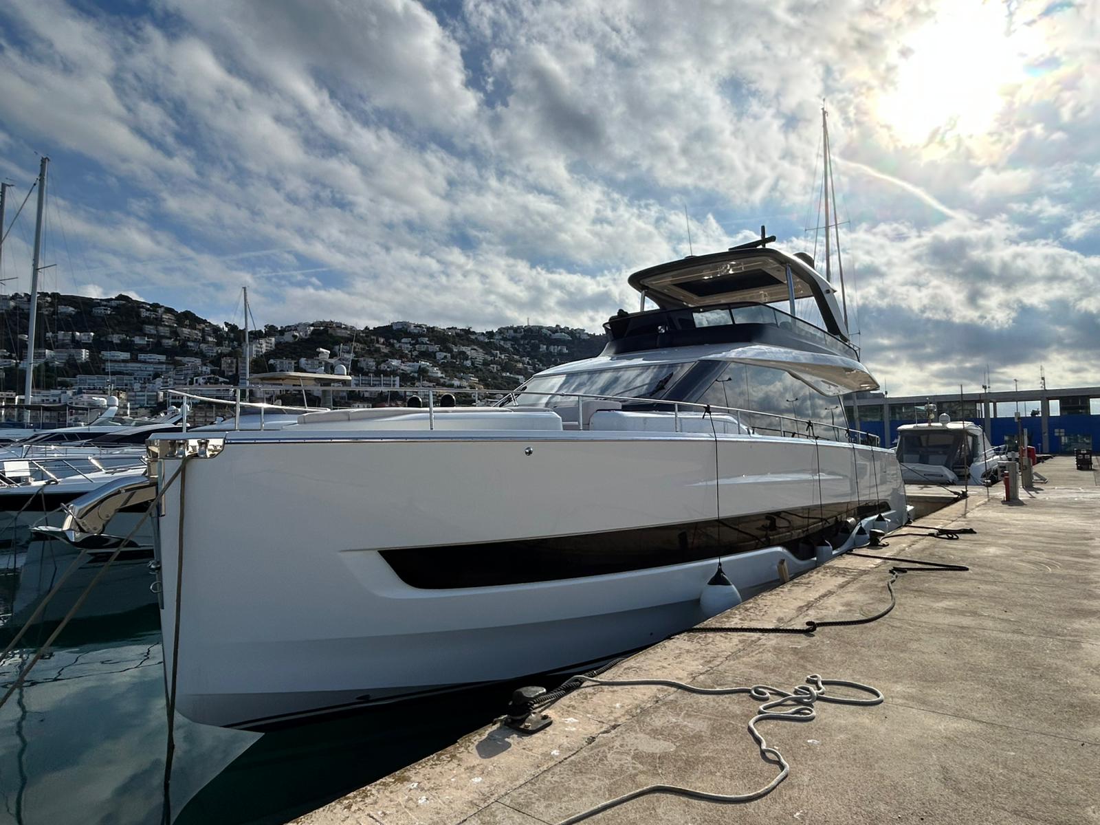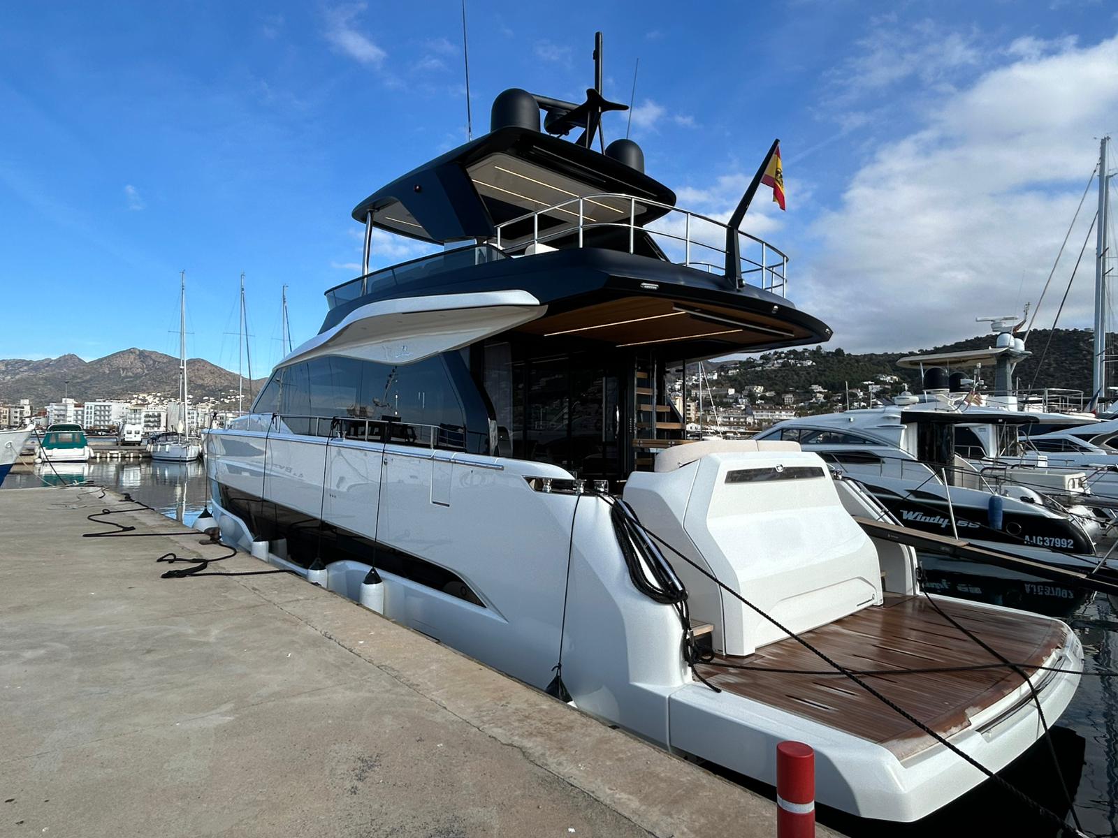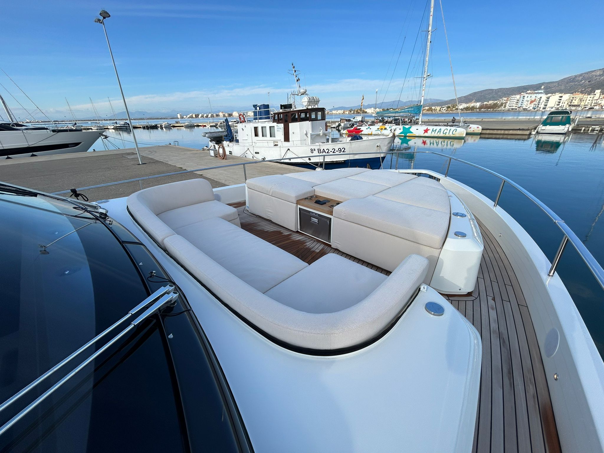 Embarcación en stock. Entrega inmediata. Modelo Sessantadue 62 del prestigioso astillero Cranchi. Eslora total de 20,23 m y casco de color blanco con T-Top negro. Dispone de una gran habitabilidad interior, amplio flybridge, garaje y cabina del marinero.AST-Nº 7956