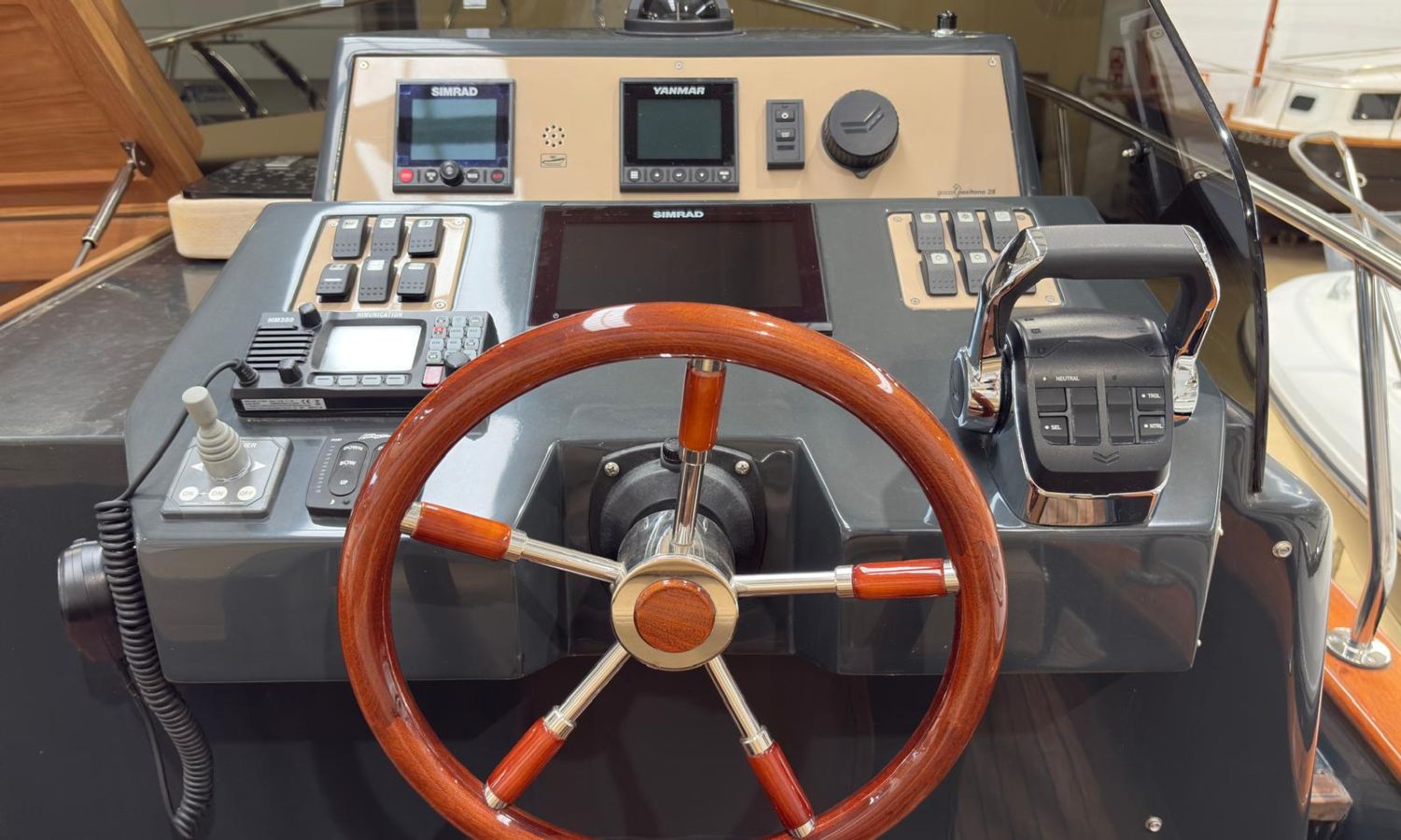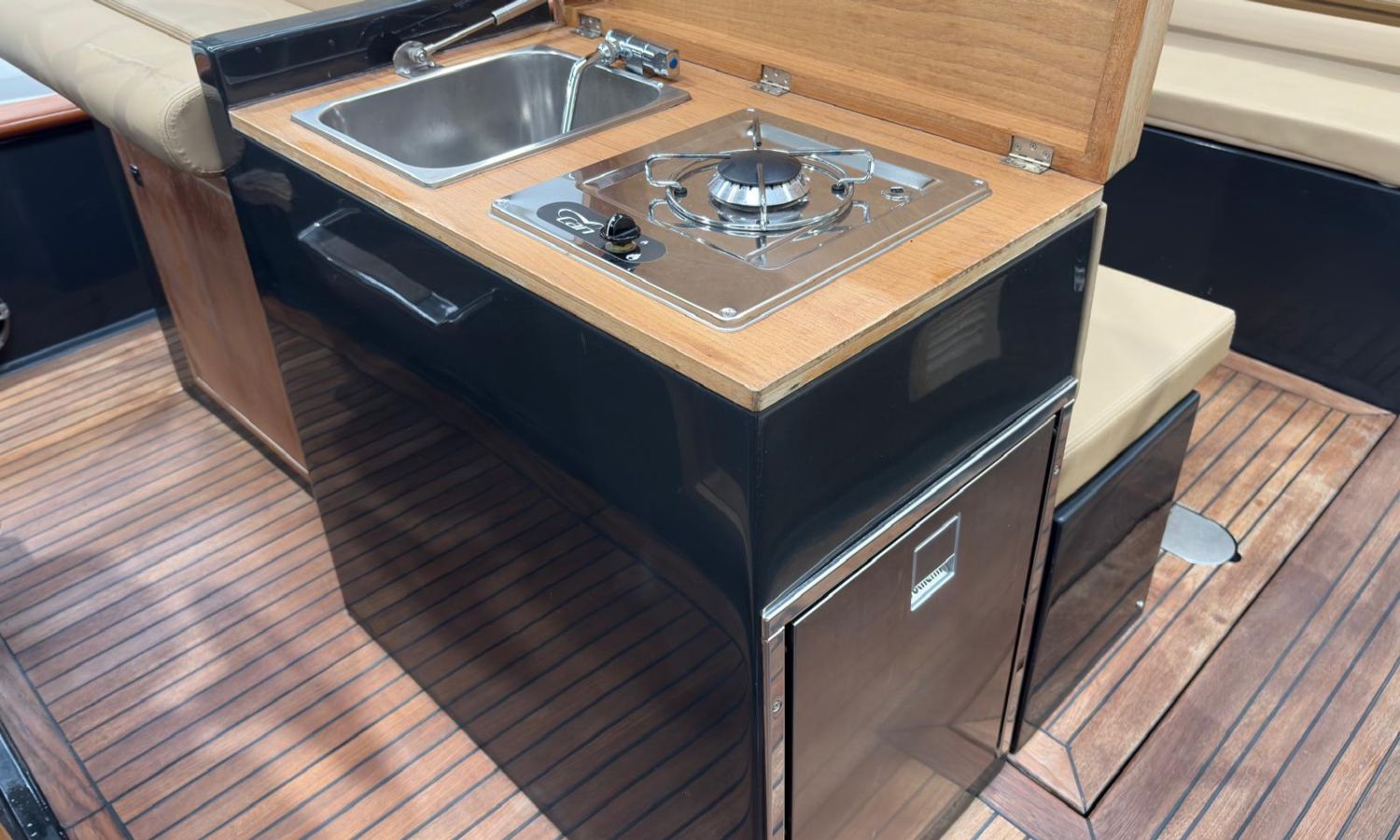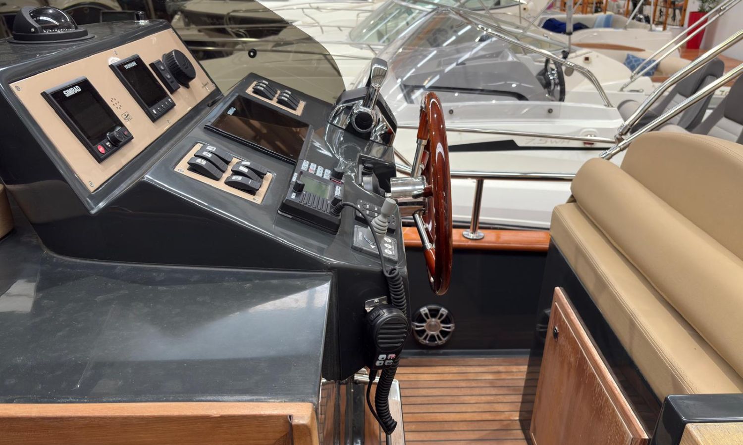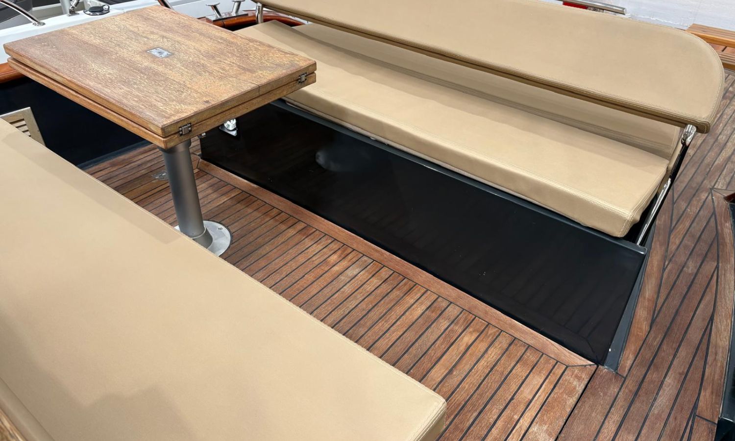 Toldo parasol - Plataforma de baño con escalera - Ducha en popa - Solarium de popa - Toma de puerto 220 v. - Cargador de baterias - Mesa en la bañera - Nevera 12 v. - Teca - Gps/Plotter/Sonda - Mando electrónico - Hélice de proa - Vhf - Equipo audio - Wc marino - Compas - Antifouling.Descripción embarcación