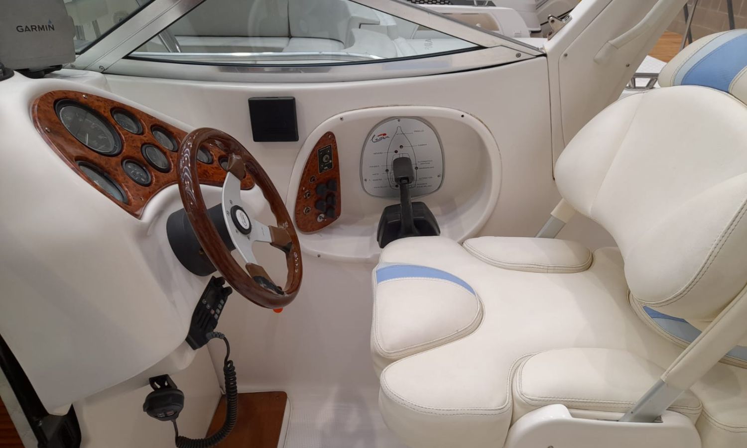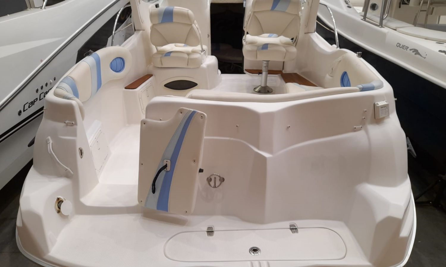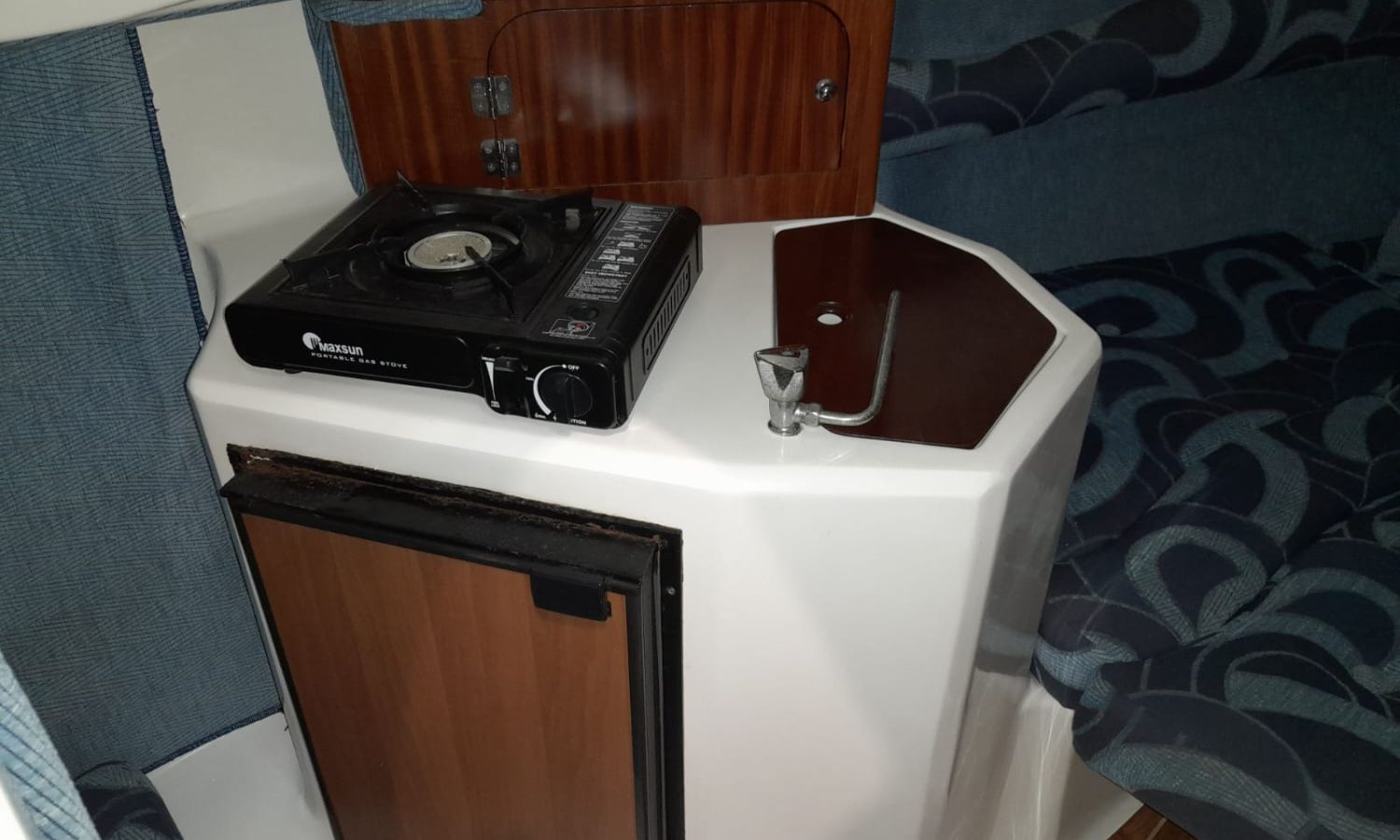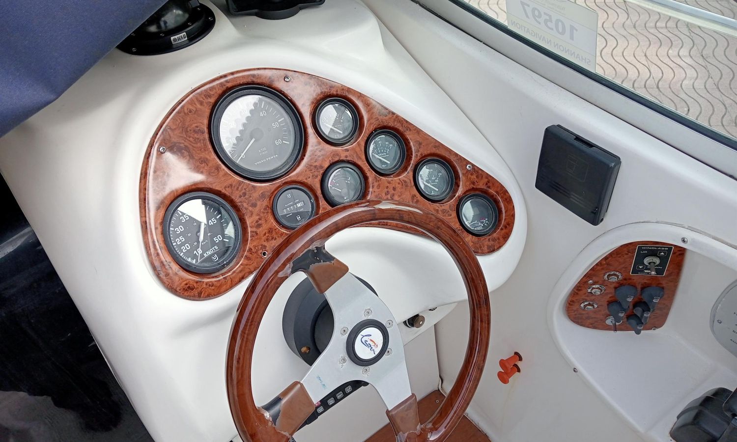 Toldo parasol - Ducha en popa - Plataforma de baño con escalera - Solárium de proa - Mesa en la bañera - Solárium de popa - Mueble-bar con fregadero - Cocina a gas - Nevera 12 V. - Gps/Sonda - Ancla y cadena - VHF - Compás - WC marino - Cabina - Antifouling.