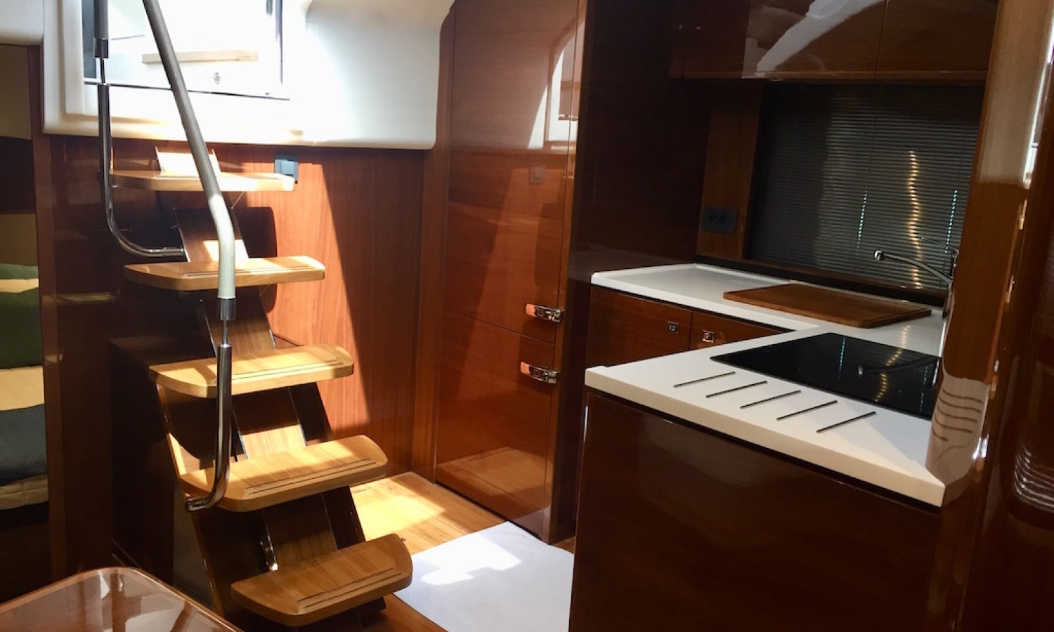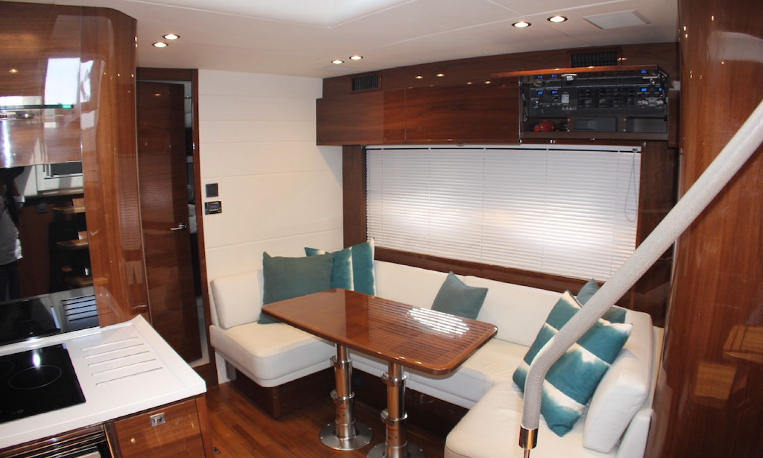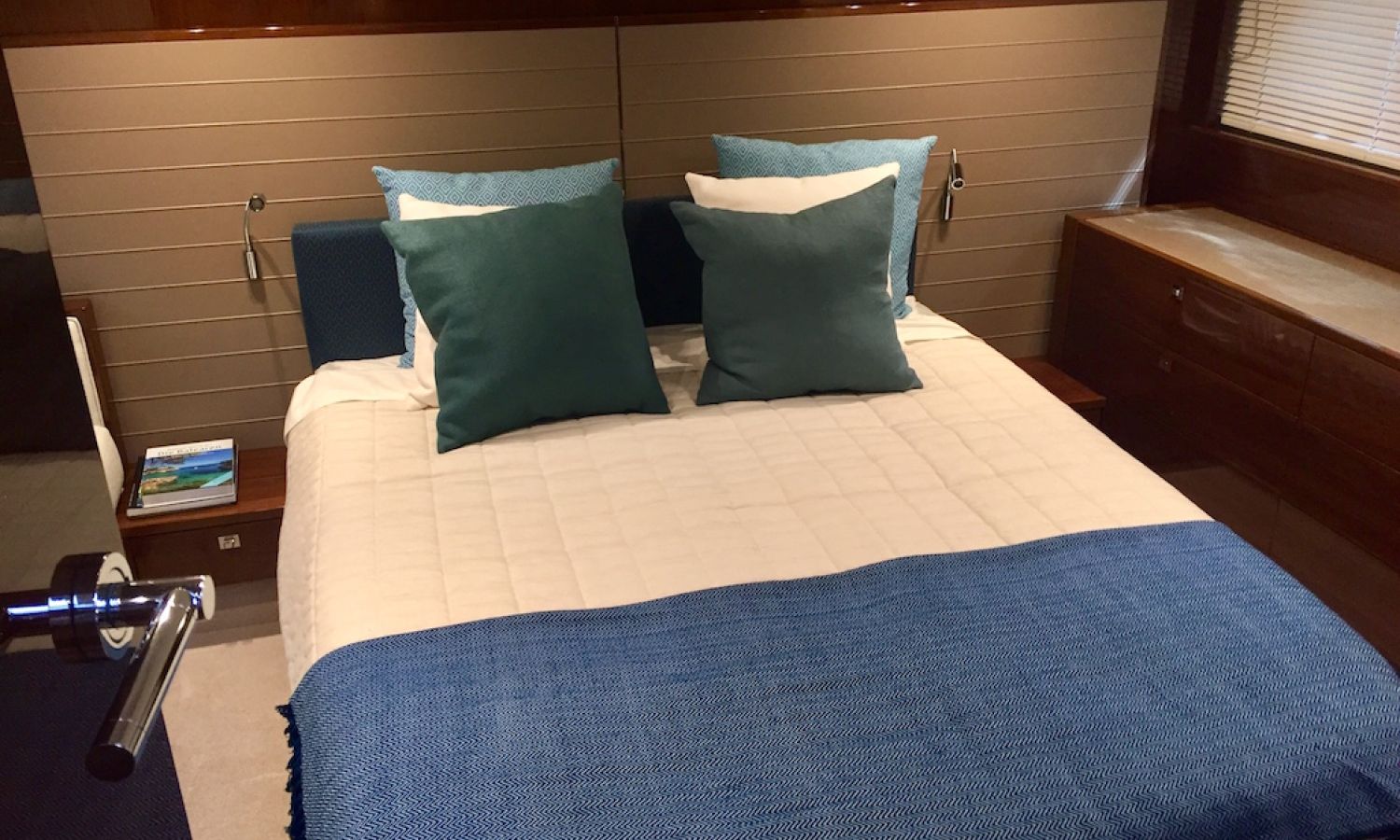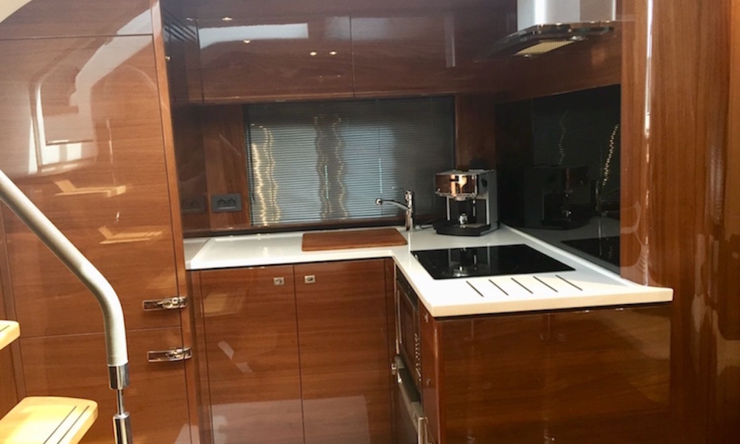 Generador - Aire acondicionado - Hélice de proa - Joystick - Flaps - Pasarela Hidráulica - Toma de puerto 220V. - Cargador de baterías - Calentador de agua - Flexiteek en bañera y plataforma de baño - Parrilla y nevera eléctrica en la bañera - Molinete de ancla eléctrico - Colchonetas solarium en proa - Ducha en popa - Mesa en la bañera - Mandos electrónicos - GPS/Plotter/Sonda/Radar - Piloto Automático - Indicador angulo de timón - Compás - Radio VHF - Equipo de audio - Antena TV + TV en Cabinas y comedor - 2 Camarotes - 2 WC marinos eléctricos con depósito de aguas negras y ducha - Cocina eléctrica - Fregadero - Microondas - Nevera.