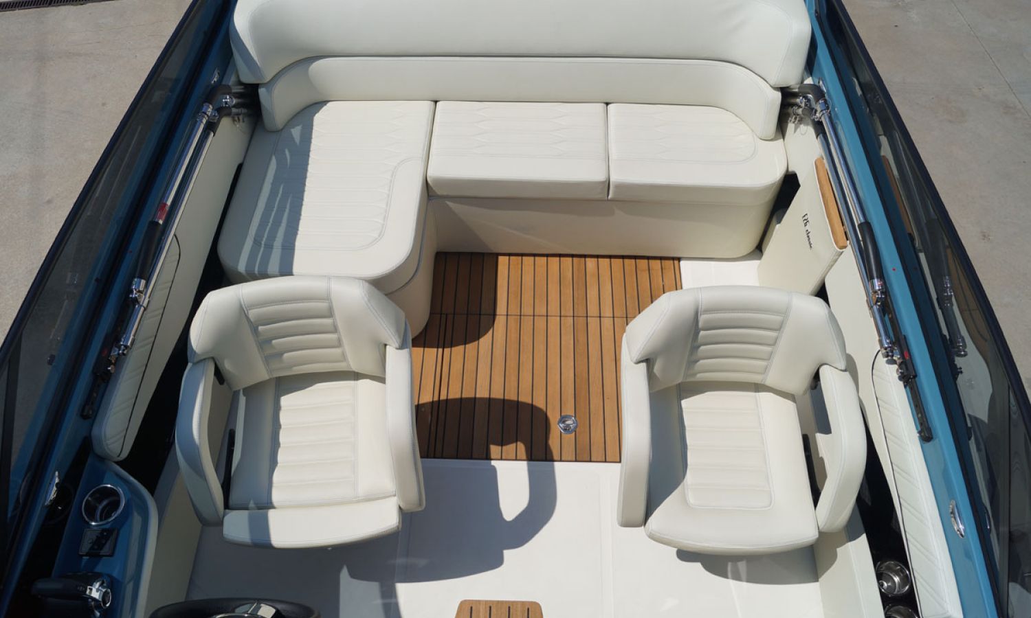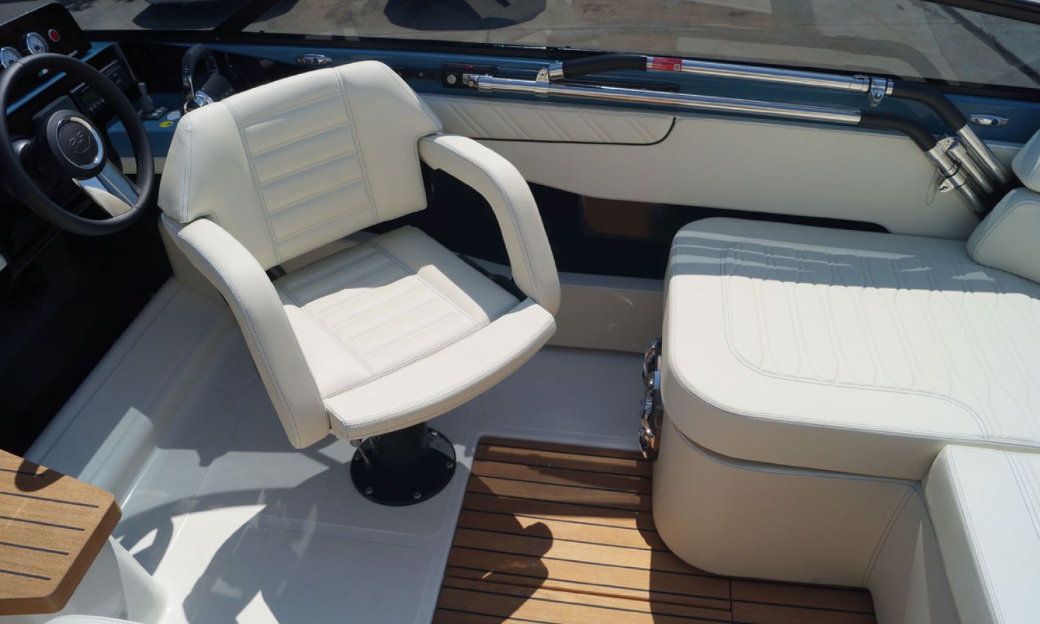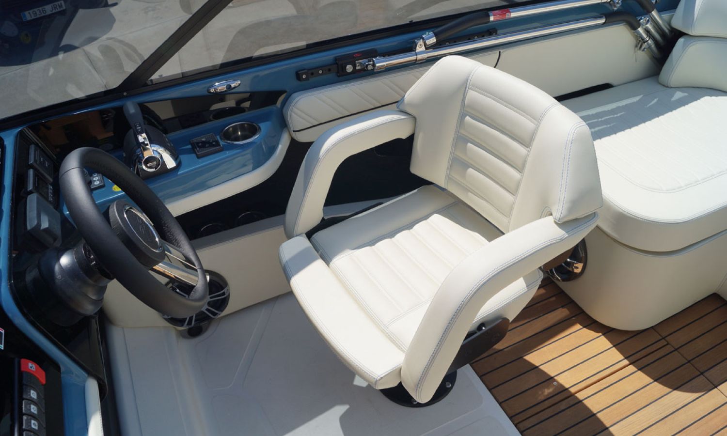 Taud de soleil microperforée noir - Coussin bain de soleil avant - Propulseur d´étrave avec extincteur automatique - Réfrigérateur cabine 42 l - GPS/Chartplotter à couleur + transducteur pour la profondeur, la température de l'eau, interfacé avec le moteur - Installation électrique 230 V avec chargeur de batteries et prise de quai avec câble de connexion - 6 Pare-battages et couvertures - Radio Fusion Bluetooth/USB, 2 haut-parleurs, amplificateur, subwoofer et télécommande dans le cockpit - Table de cockpit avec housse - Teck sur le pont de proue complet - Cockpit en teck - Taud de mouillage - Guindeau électrique 500 W avec 30 m chaîne et ancre 8 kg Ultramarine en acier inoxydable - Couvertures pare-battages couleur alternative du standard - Sellerie extérieure Silvertex couleur alternative du standard - Coque et pont en couleur laquée - Certificat CE et déclaration de conformité - Transport du chantier naval à la Costa Brava.Description du bateau