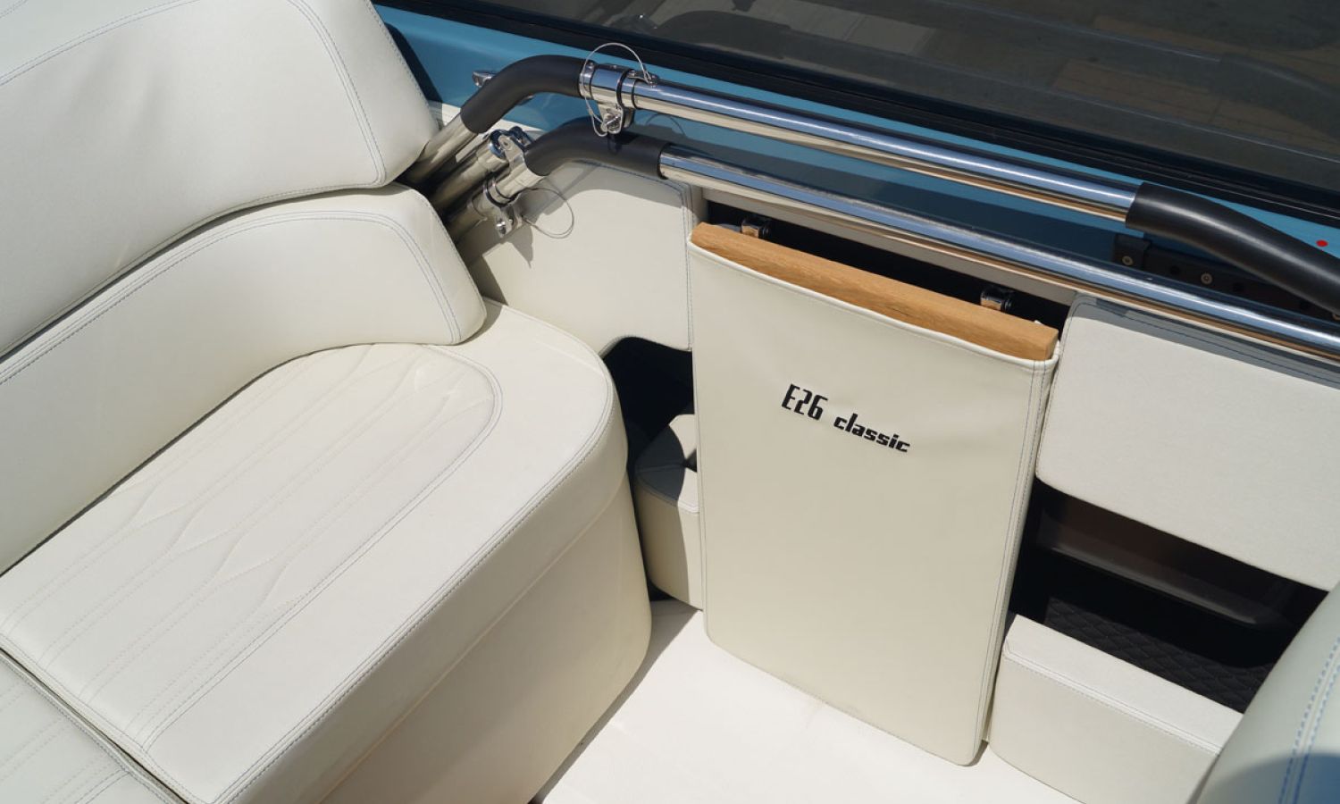 Bateau neuf en stock. Livraison Janvier 2026. Banque de photos, couleurs et équipement peuvent ne correspondre pas exactement à l'unité offerte. Modèle E 26 Classic du chantier naval italien Cranchi de 7,85 mètres de longueur totale. Bateau avec plate-forme de bain confortable, avec cabine et bain de soleil arrière.AST-Nº 7970