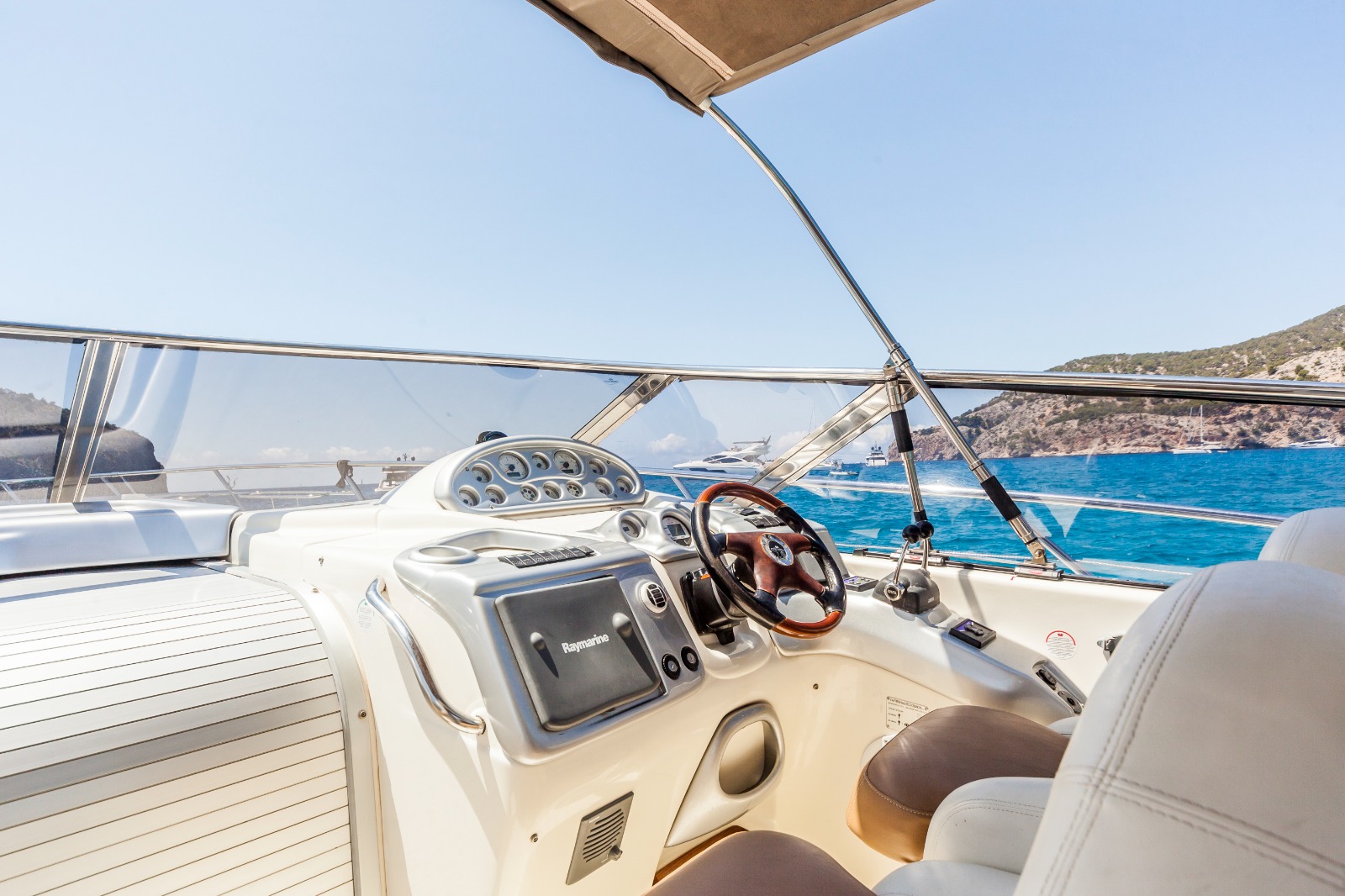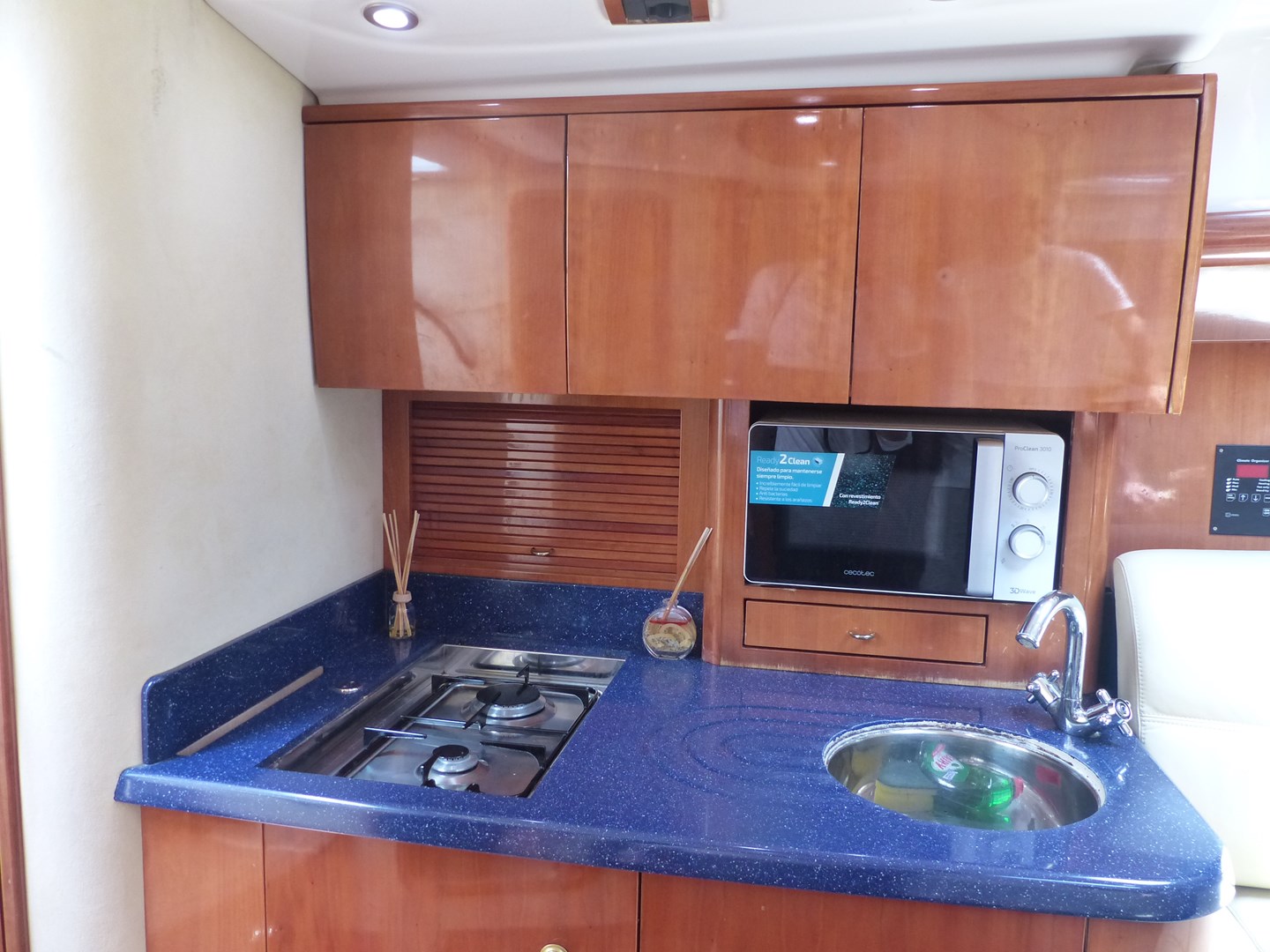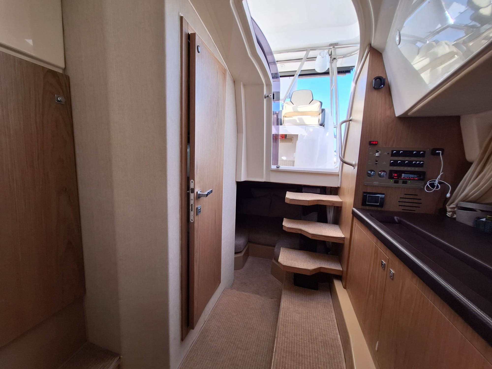 Propulseur d'étrave - Correcteurs d'assiette - Prise de quai 220 V. - Chargeur de batterie - Cockpit et plateforme de bain en teck - Barbecoue de cockpit - Réfrigérateur - Guideau électrique - Coussins de bain de soleil avant - Douchette arrière - Table de cockpit - Coomandes électroniques - Gps/Plotter/Sondeur - Indicateur d'angle de barre - Compas - Vhf -Equipement audio - Wc marin avec réservoir d'eaux noires - Douche - Cuisine électrique - Evier - Micro-ondes - Arceau radar repliable hydrauliquement - Antifouling.Description du bateau