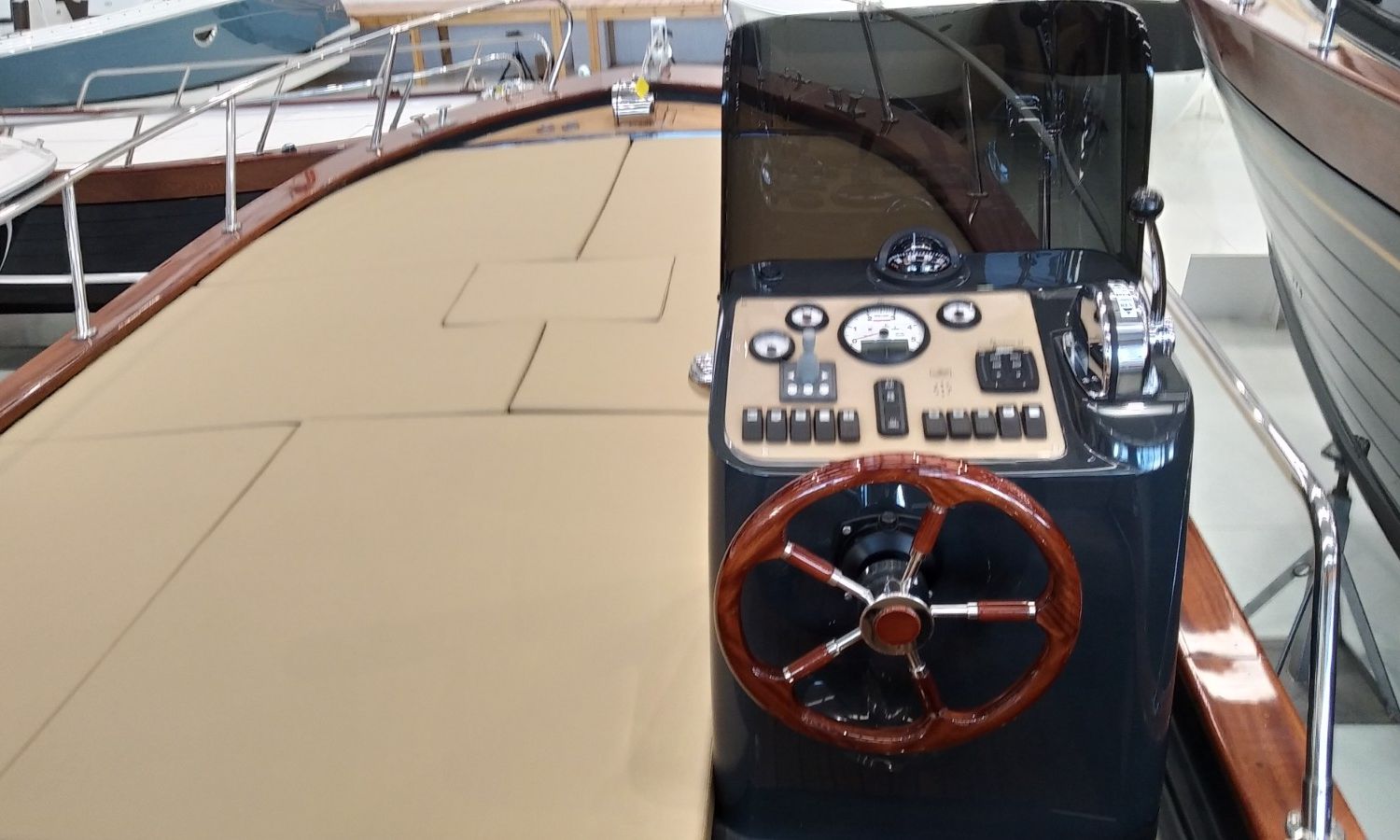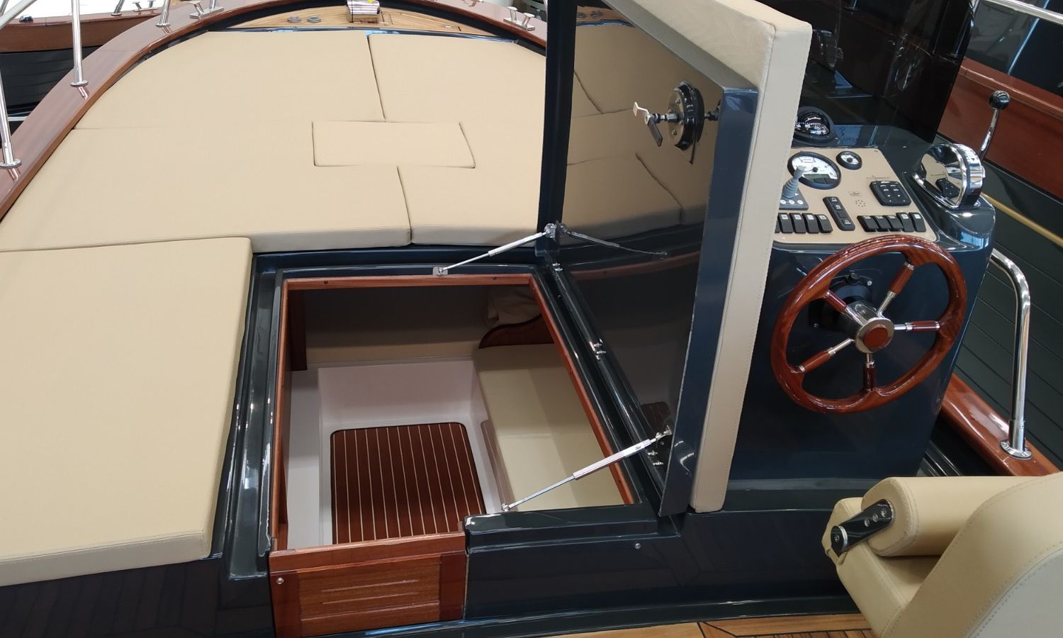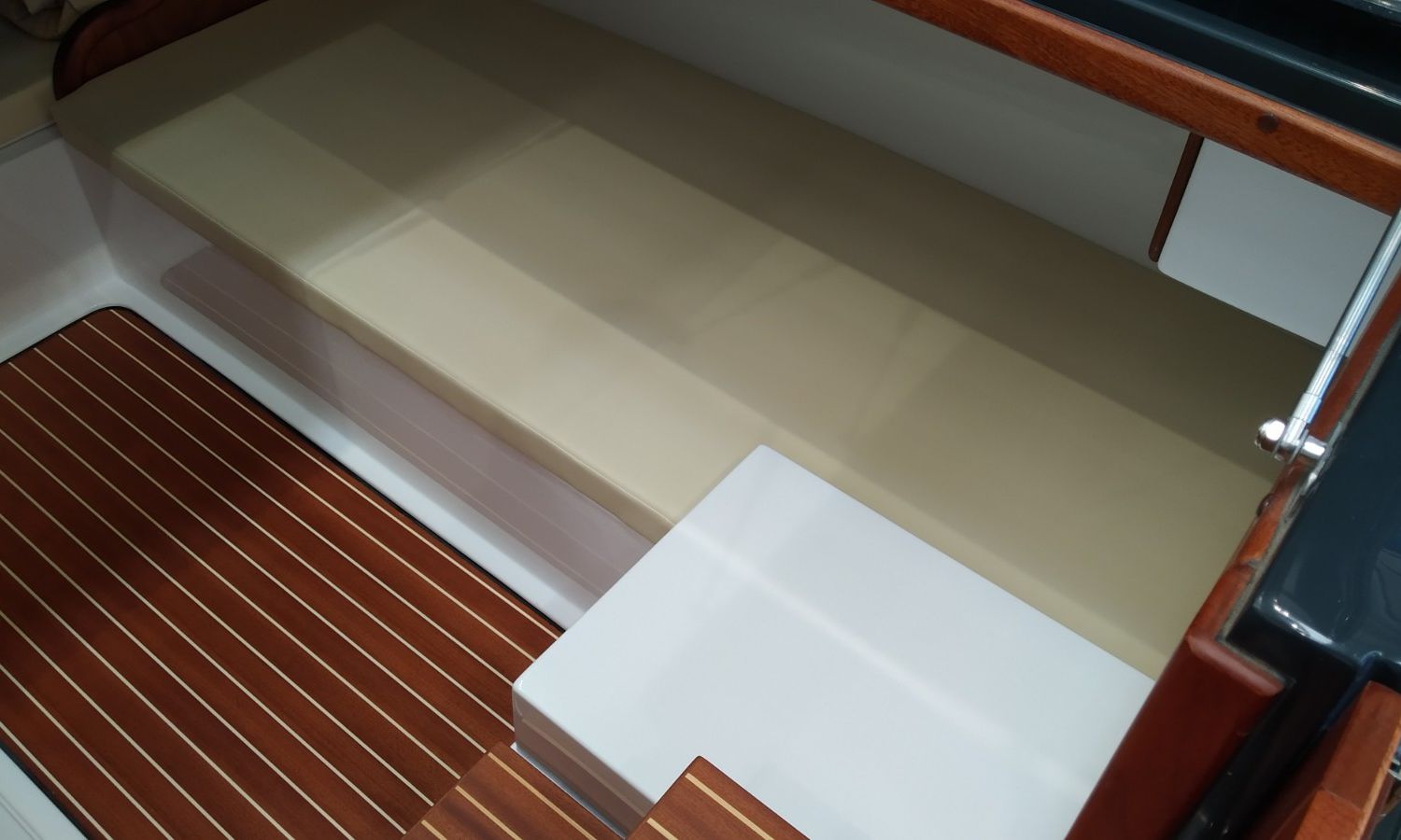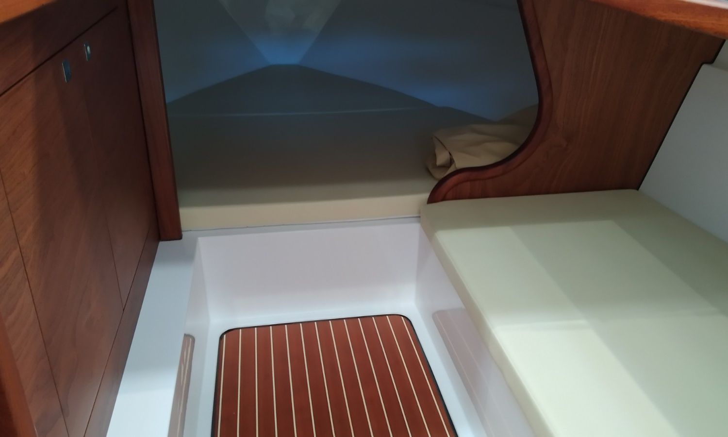 Console commandes avec instruments et siège pilote - Couverture console - Coussins extérieurs sur pont et sièges - Coussins intérieurs - Douche avec réservoir d'eaux - Propulseur d'étrave - Guindeau électrique avec ancre et chaîne - Plateforme de bain en fibre et teck avec échelle - Surface cockpit en teck (seulement poupe) - Taud de soleil - Supplément taud de soleil microperforé (1 à poupe et 1 latéral) - Préparation, remise en main propre et test en mer - Transport du chantier naval à la Costa Brava.Description du bateau