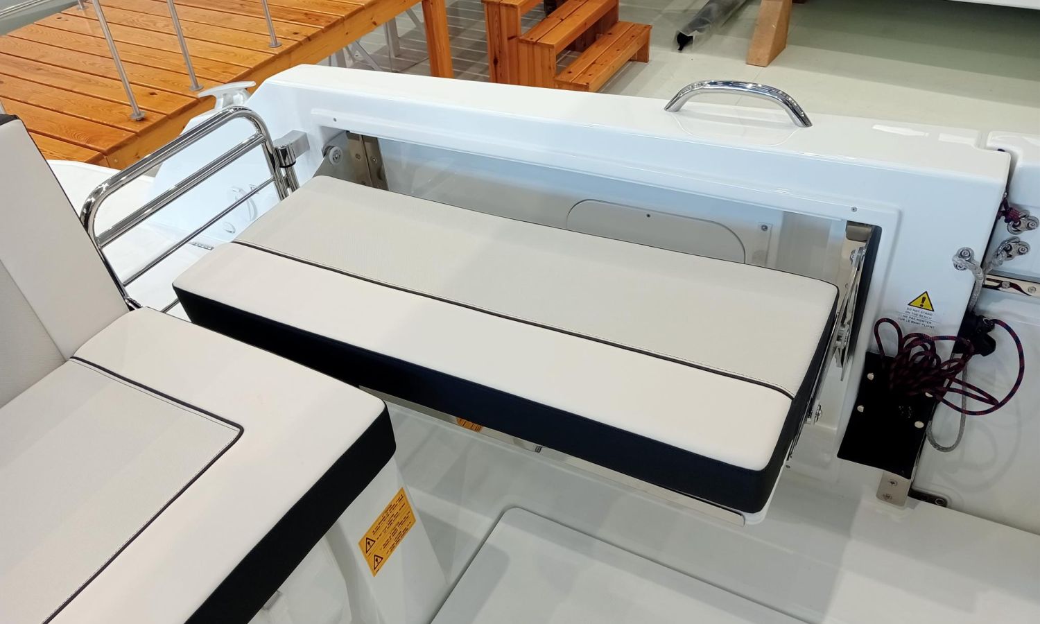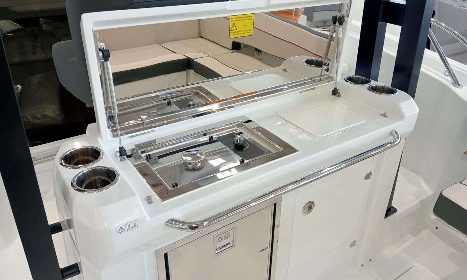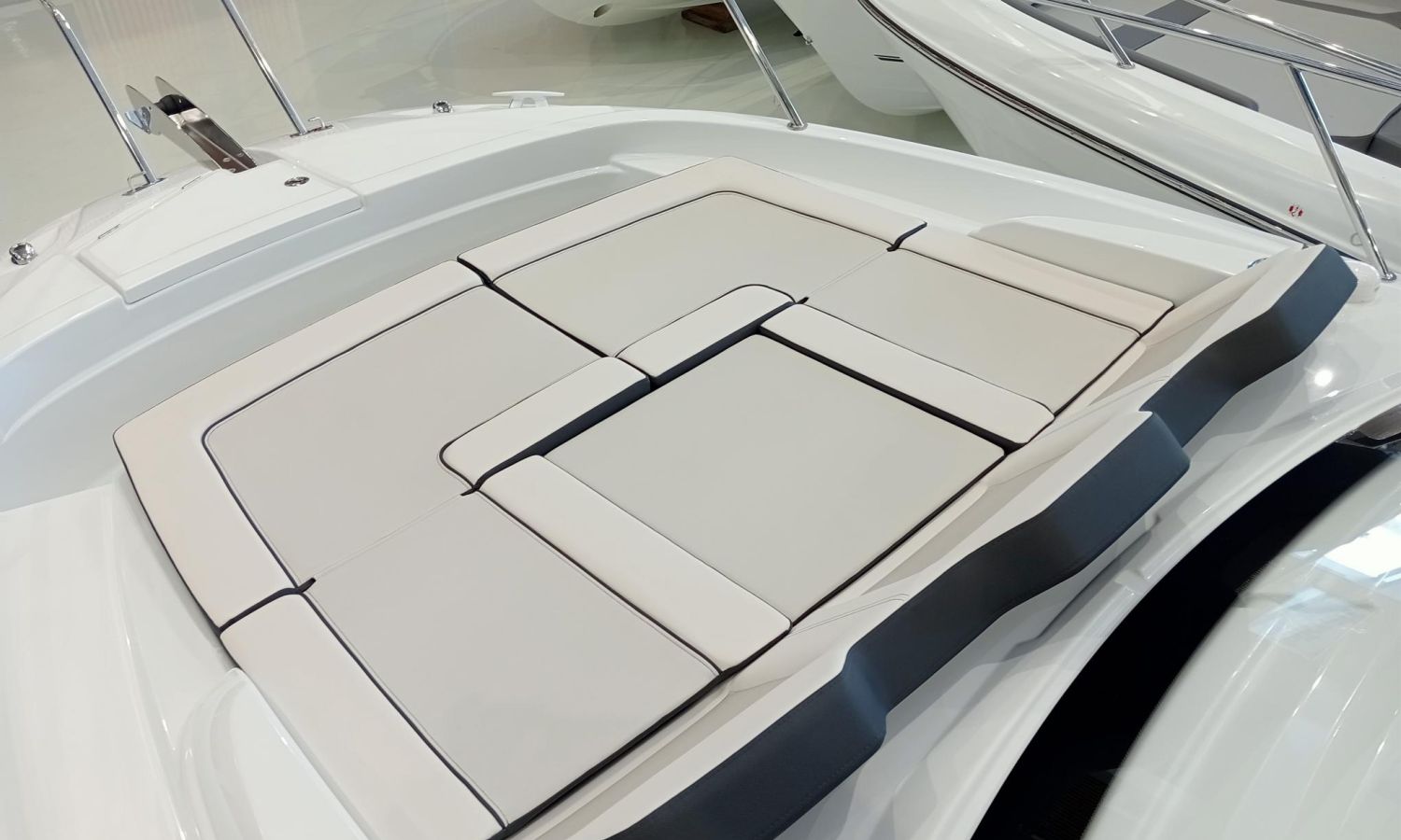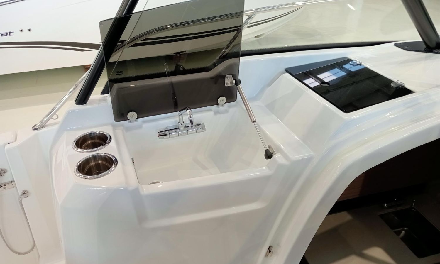 Niveau d’équipement Premiere - Pack Confort - Pack Audio Premium pour bateau avec T-Top - Rideaux intérieurs - T-TOP toit en Polyester - Kit d’amarrage - Kit de mouillage - Propulseur d’étrave - Plates-formes de bain en Polyester - Panneau en T-Top à ouverture manuelle - Banc latéral rétractable Dossier réglable pour bain de soleil baignoire arrière - Réfrigérateur dans la baignoire et le stockage sur Leaning Post - Réchaud à gaz dans la cuisine de la baignoire - Tapisserie de bain avant avec sièges Meridian - - Pompe électrique laver l’eau de mer couverte - Panneau de douche + couvercle de toilette - Coussins de baignoire Silvertex ICE Diamante carbone - Tapisserie salon/Cabine PVC Marlin Pure White - Pre-Rigging moteurs Yamaha 2x200-250 SBW électrique - Transport depuis le chantier naval, Costa-Brava - Installation des moteurs inclus- Peinture Antifouling - Lancement et livraison.Description du bateau
