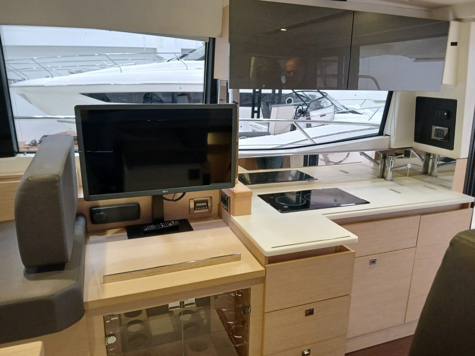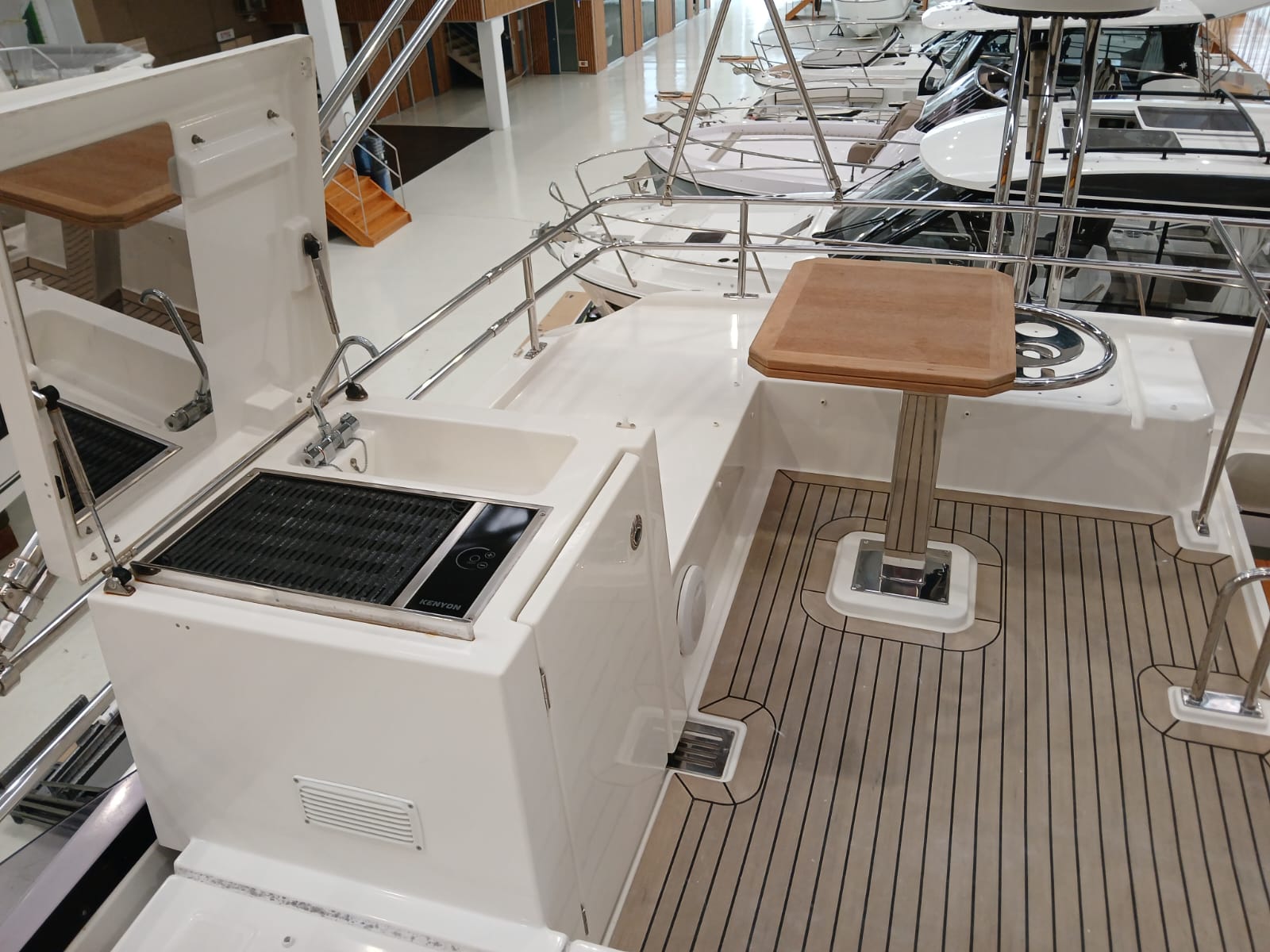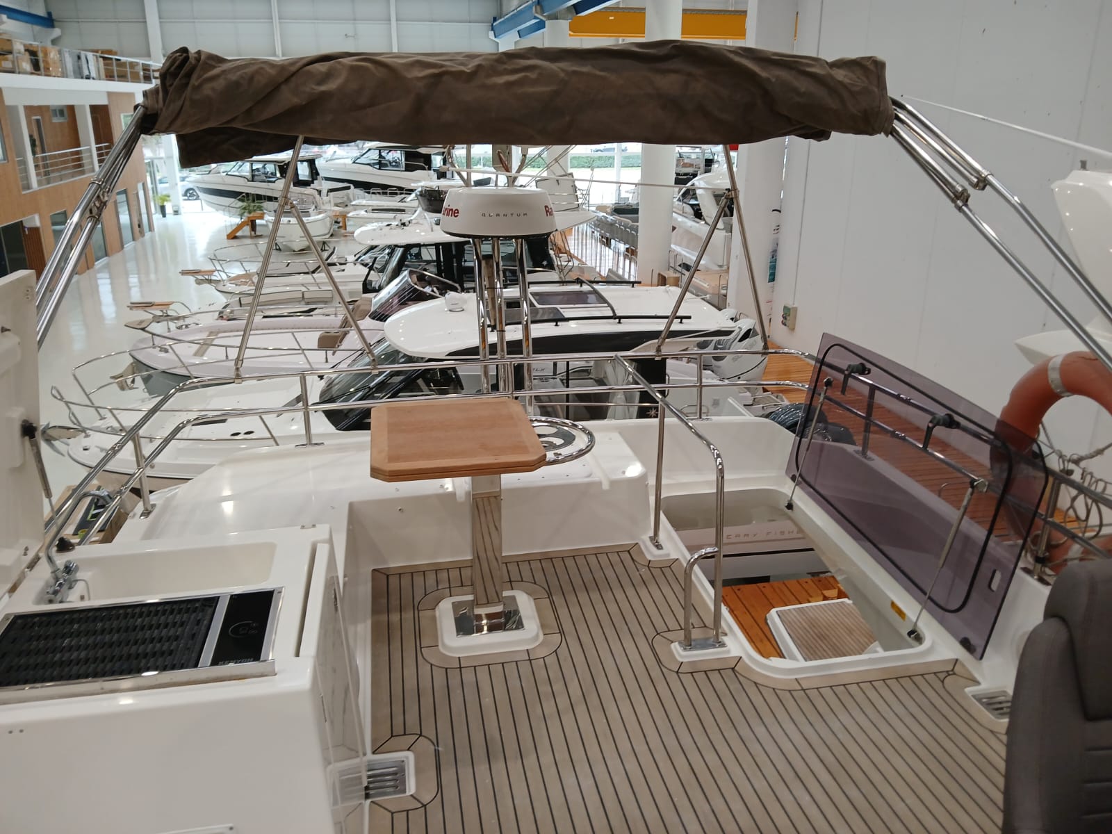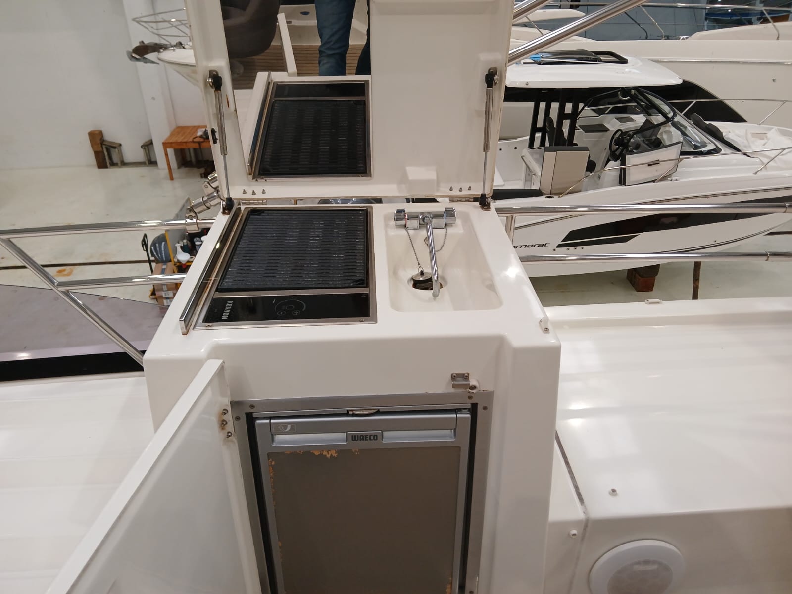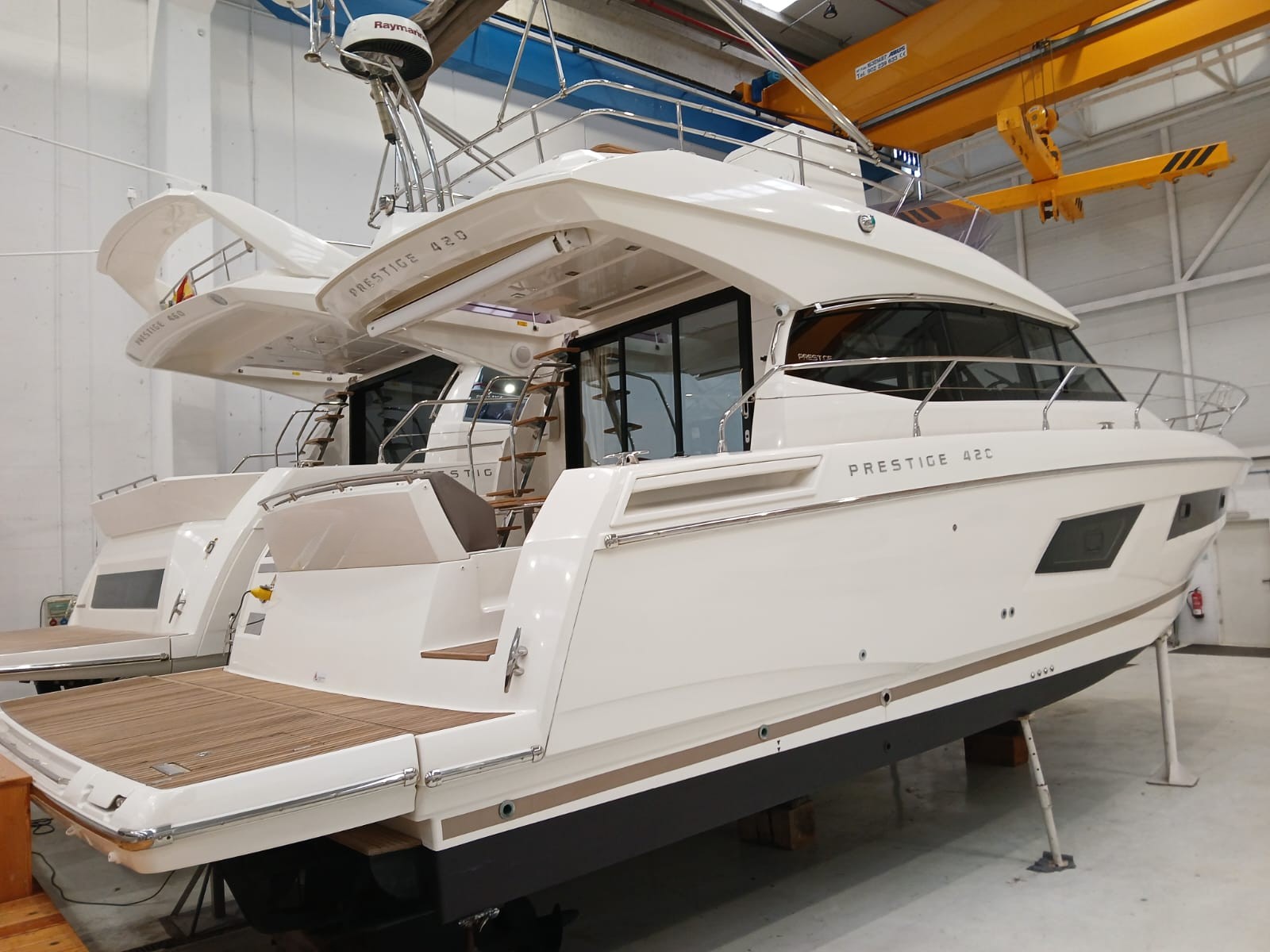 Plateforme hydraulique - Passerelle hydraulique - Commandes électroniques - Climatisation - Gps/Plotter/Sonda - Fly - Vhf - Joystick - Générateur - Radar - Bimini fly et taud électronique dans le cockpit - Tableà manger avec piètement électrique - Réfrigérateur - Plaque à induction - Flexitec sur les côtés et le fly - Solárium à l'avant - Antifouling.Description du bateau