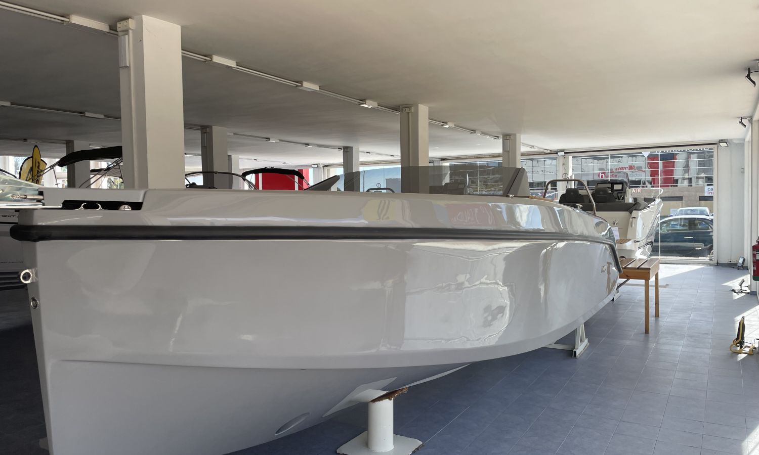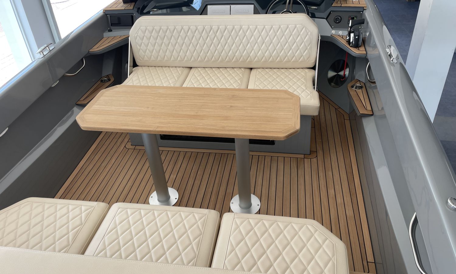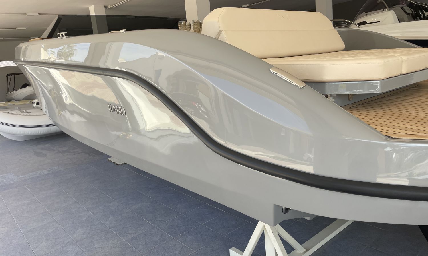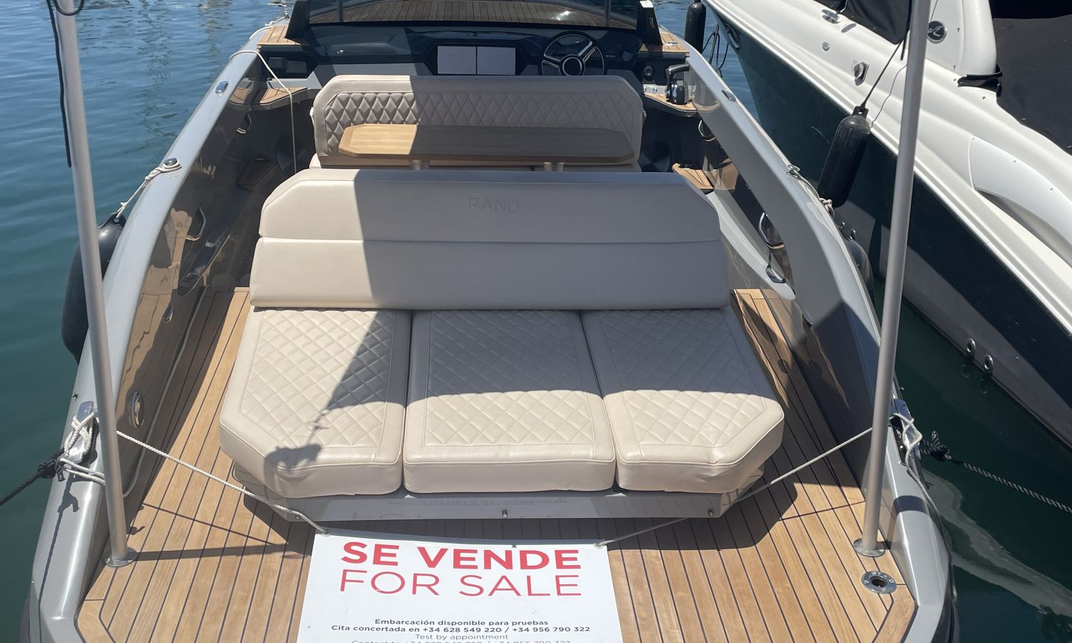 COQUE COULEUR GRISE SKI - SELLERIE EN CUIR DIAMANT - GUINDEAU ELECTRIQUE + KIT DE MOUILLAGE - DEUX ECRANS RAYMARINE 7" SUR LE TABLEAU DE BORD AVEC SYSTEME DOMOTIQUE - CROCHET A SKI - PORTE-VERRE - DOUCHE DE COCKPIT - FEUX A LEDS DANS LE COCKPIT - DEFENSES - ECHELLE DE BAIN PREMIUM - REFRIGERATEUR LUXE - TAUD DE MOUILLAGE - CAPTEUR DE PROFONDEUR - CHARGEUR DE BATTERIE – AUVENT DE TYPE HAIMA - PROPULSEUR D'ETRAVE - SYSTEME AUDIO B&O - EXTINCTEUR AUTOMATIQUE - TECK SUR PONT ET PLATEFORME DE BAIN - TRANSPORT CHANTIER NAVAL-COSTA-BRAVA.Description du bateau