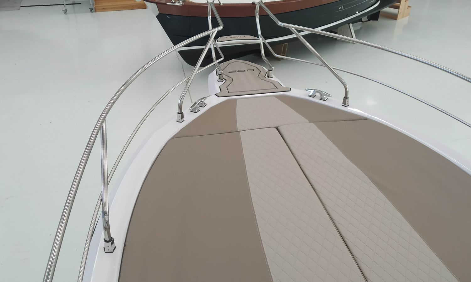 2 Sièges confort S-Line - Console Luxury - Installation douche complète - Guindeau électrique - Bancs latéraux pliables - Sellerie Luxury - Table à poupe en teck - Taud soleil - Direction hydraulique - WC électrique avec réservoir d'eaux noires - Box WC séparé - Transport chantier naval à Costa Brava.Description du bateau
